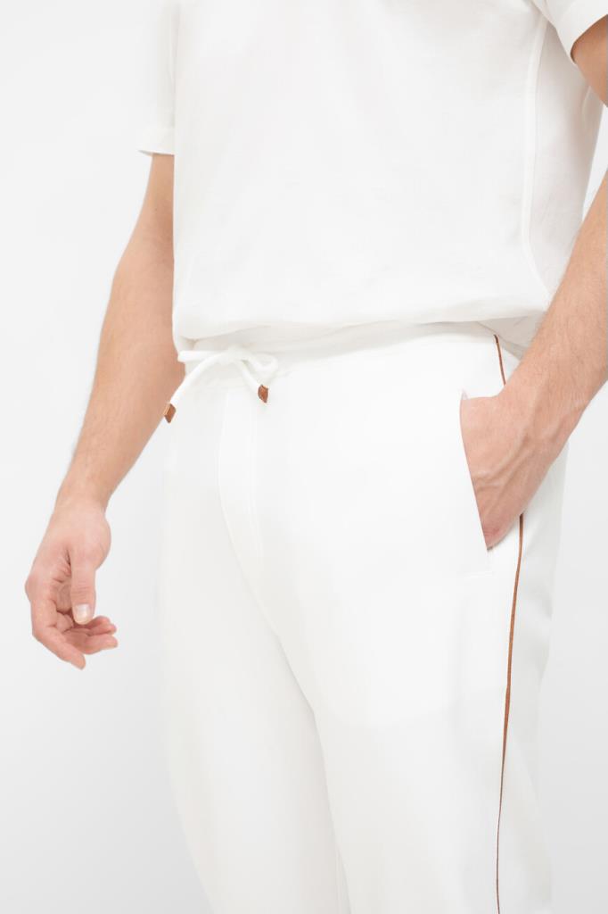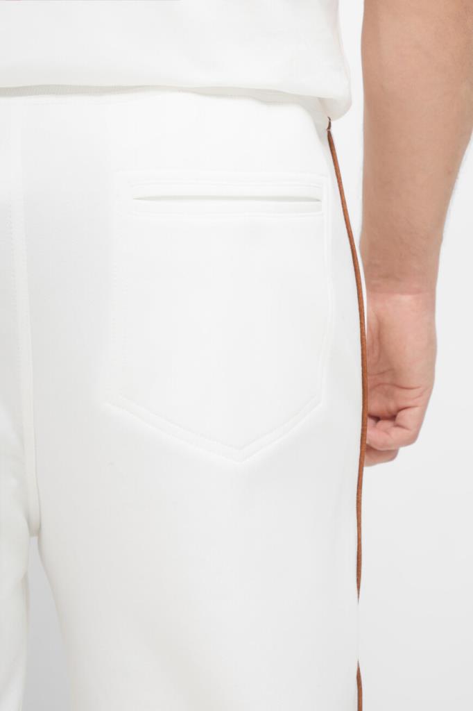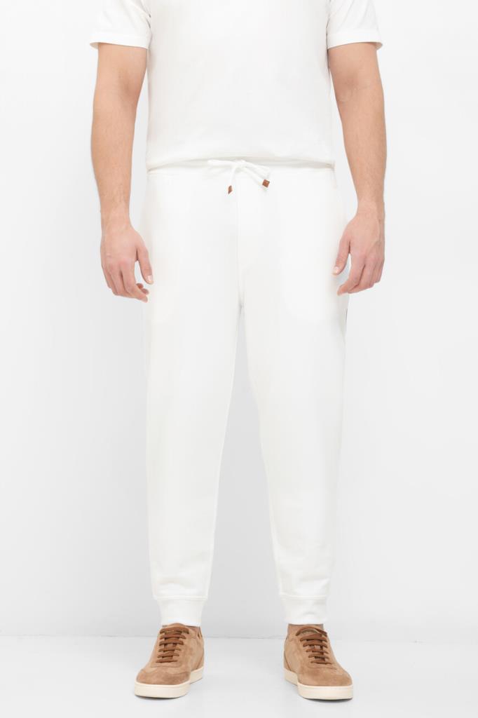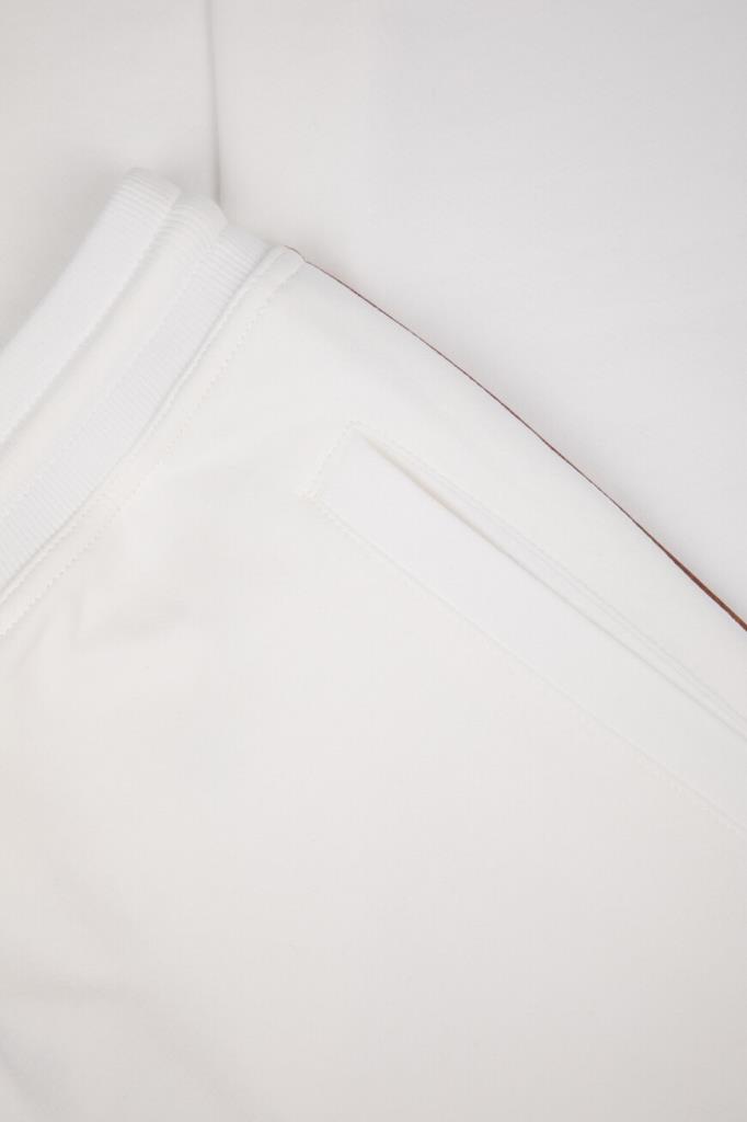 Спортивные брюки из линейки Travelwear от BRUNELLO CUCINELLI. Для создания изделия свободного силуэта выбран высокотехнологичный хлопковый футер белого цвета. Модель декорирована коричневыми полосами-лампасами и оснащена широким эластичным поясом-кулиской и манжетами-резинками для комфортной посадки. Брюки с четырьмя карманами составят идеальный комплект с толстовкой с невысоким воротником-стойкой в стиле бомбера из той же коллекции.