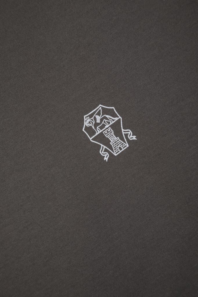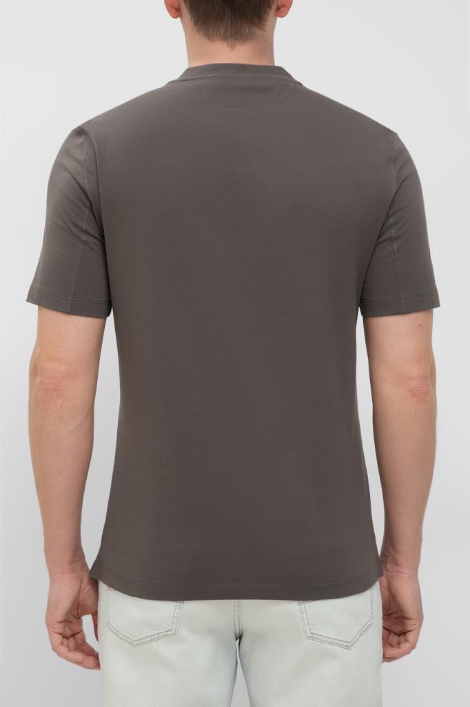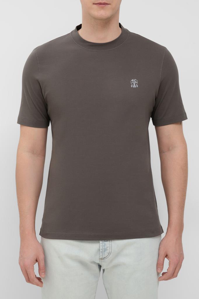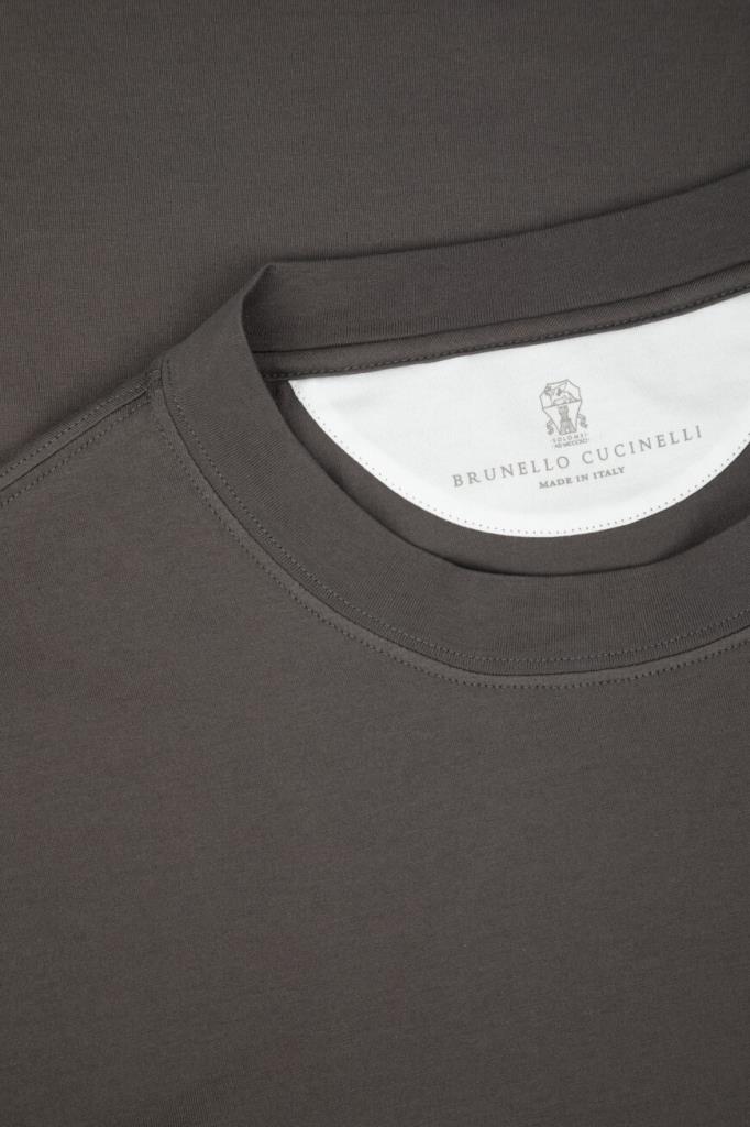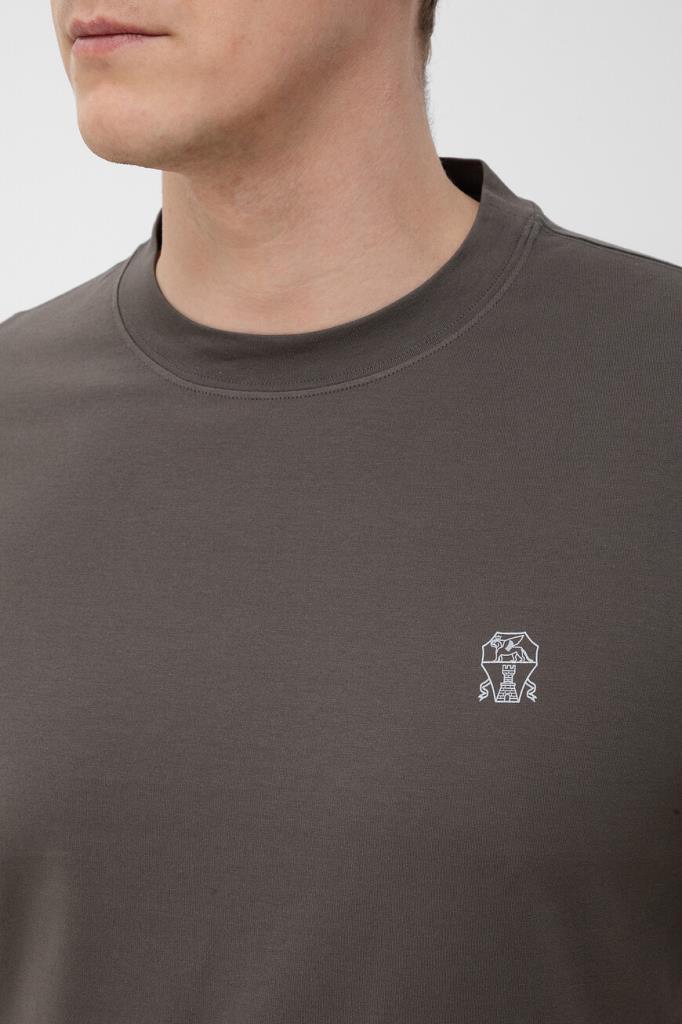Футболка BRUNELLO CUCINELLI выполнена в сером цвете. Для изготовления повседневной модели используется мягкое хлопковое джерси — лёгкая ткань с гладкой ровной поверхностью. Небольшой логотип Solomeo слева на груди завершает изделие прилегающего силуэта культовым элементом. Манжеты и низ модели с круглым вырезом горловины на резинке дополнены отглаженной кромкой.
