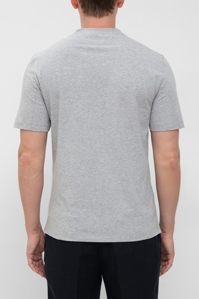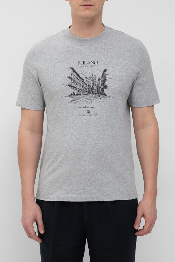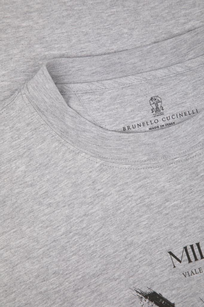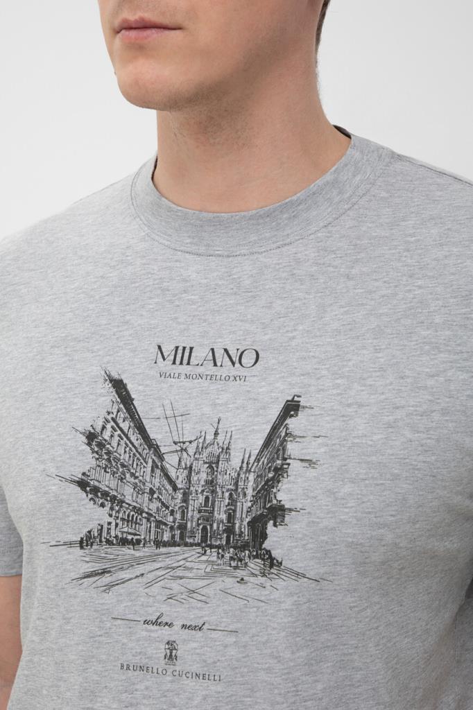 Меланжевая футболка Milano прилегающего силуэта от BRUNELLO CUCINELLI. Для пошива изделия серого цвета используется мягкое хлопковое джерси — лёгкая ткань с гладкой ровной поверхностью. Отличительными деталями являются края рукавов (манжеты) с отглаженной кромкой и крупный принт, посвящённый одному из городов, в которых находятся Дома Cucinelli, спереди. В центре композиции расположен Миланский собор - главная достопримечательность площади Дуомо. Чёрная фраза-надпись «Where next?» приглашает отправиться в новые места.