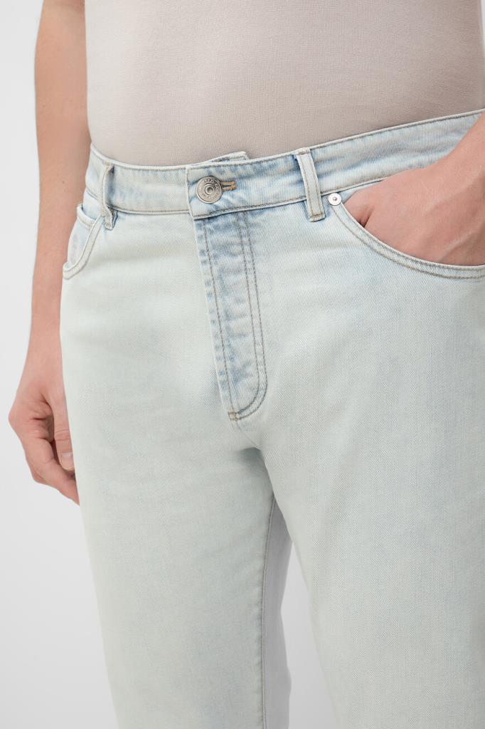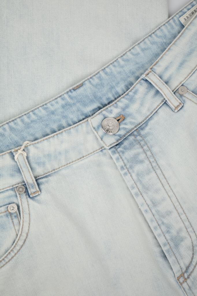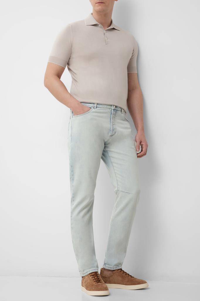 Голубые джинсы BRUNELLO CUCINELLI с выбеленным эффектом. Изделие выполнено из мягкого хлопкового денима стрейч с пятью карманами. На поясе сзади размещена коричневая прямоугольная накладка с тиснёным логотипом Дома, а спереди на уровне колен расположены горизонтальные швы. Модель также украшают прострочка на швах, вышитая монограмма на маленьком кармане спереди и дизайнерская строчка на задних карманах.
