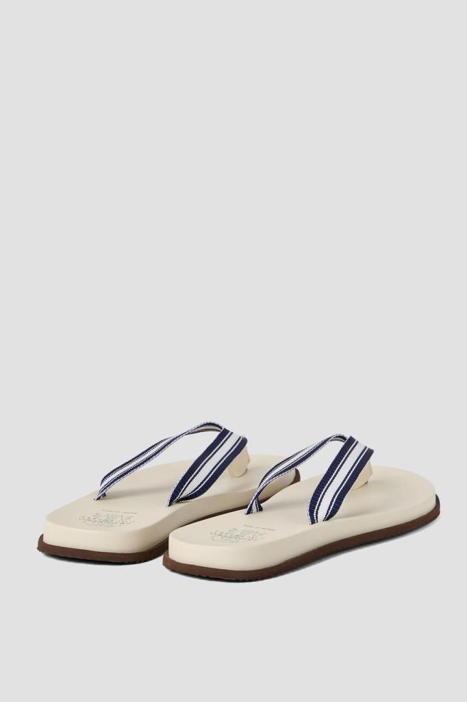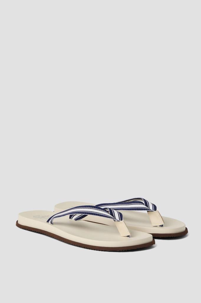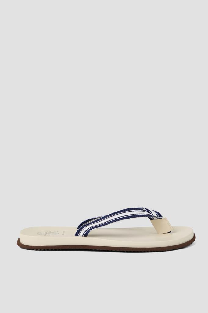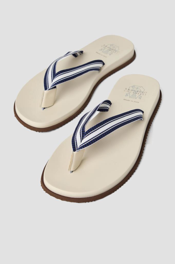 Шлёпанцы Pool от Brunello Cucinelli на кожаной платформе оттенка слоновой кости. Практичная и лёгкая пара представляет собой современную интерпретацию классических моделей для бассейна. Изделие характеризуется наличием двух Y-образных ремешков из прочного пластичного материала ТПУ сверху, украшенных полосатым геометрическим мотивом в бело-синей гамме. Стельки декорированы геральдическим логотипом Дома, завершающим стиль обуви утончённой деталью.
