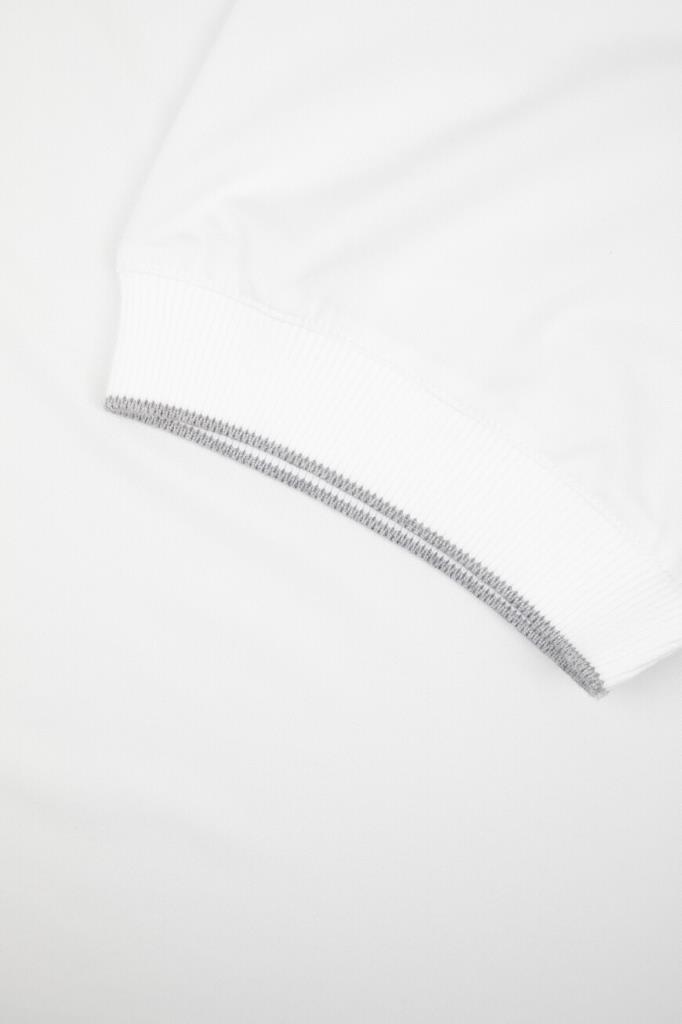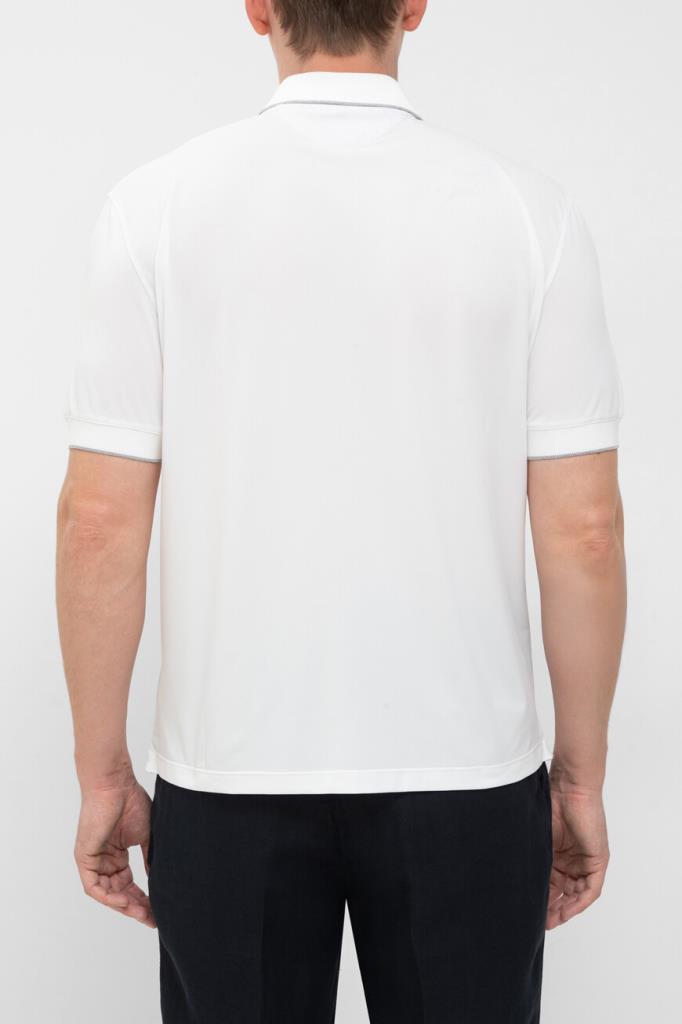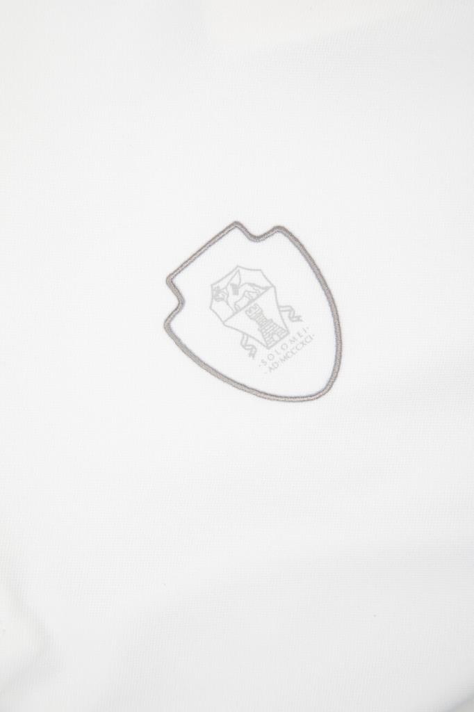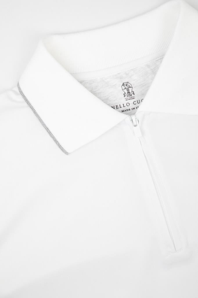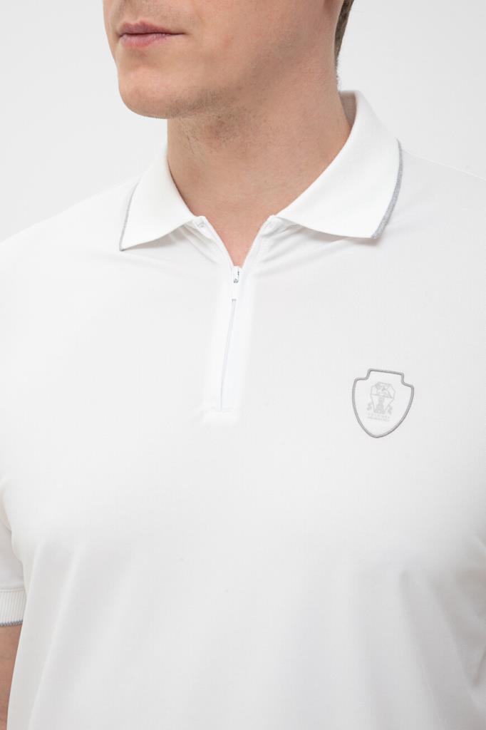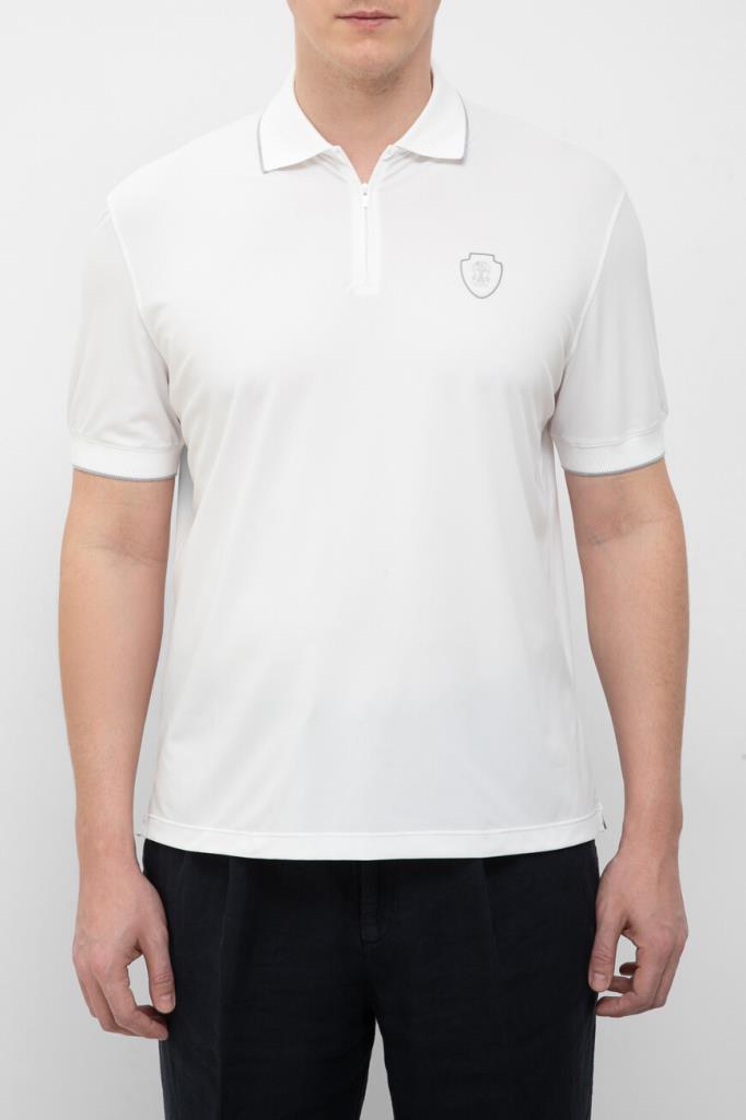Поло прямого силуэта от BRUNELLO CUCINELLI. Для пошива изделия в спортивном стиле используется прочный технический трикотаж-пике на основе полиэфира и нейлона белого цвета с добавлением эластичных волокон. Конструкция модели характеризуется наличием коротких рукавов и застёжкой-молнией спереди в тон. Принадлежность поло Дому деликатно обозначена геральдической эмблемой Solomeo слева на груди.