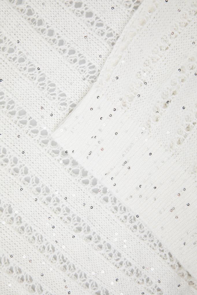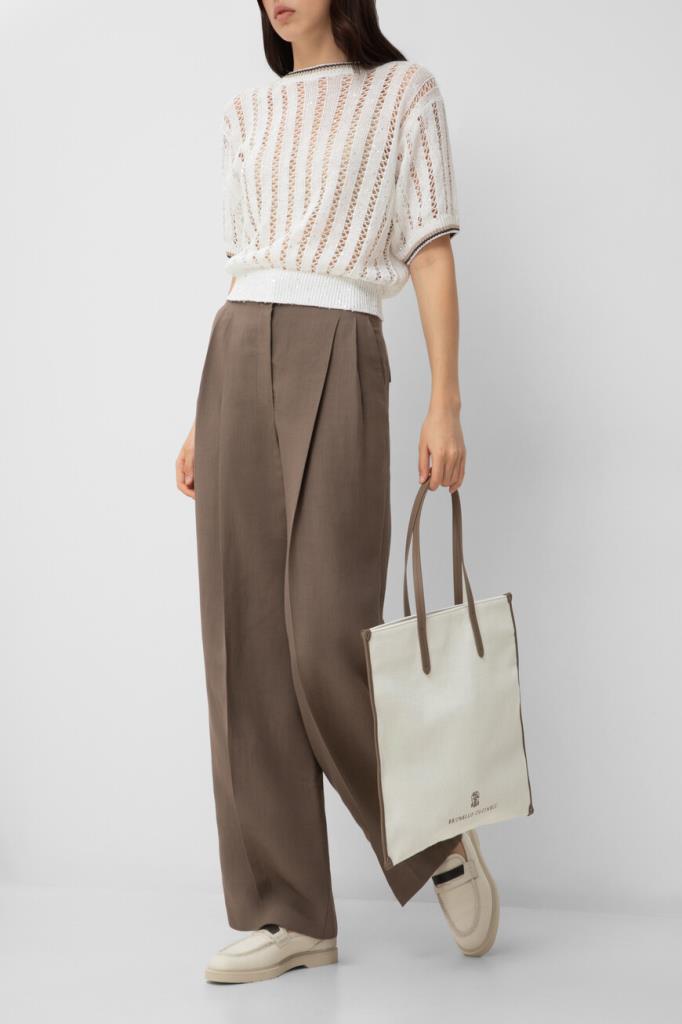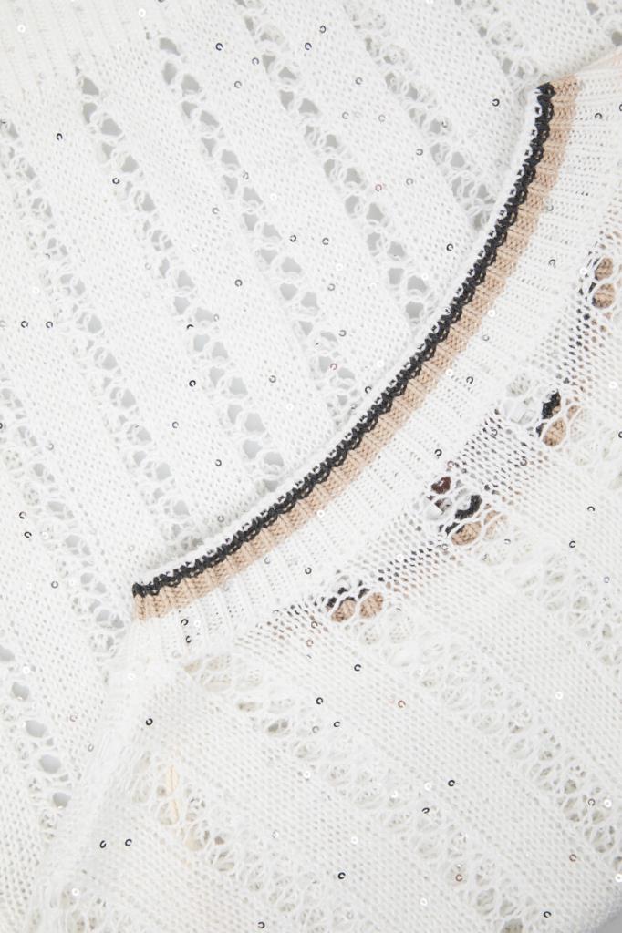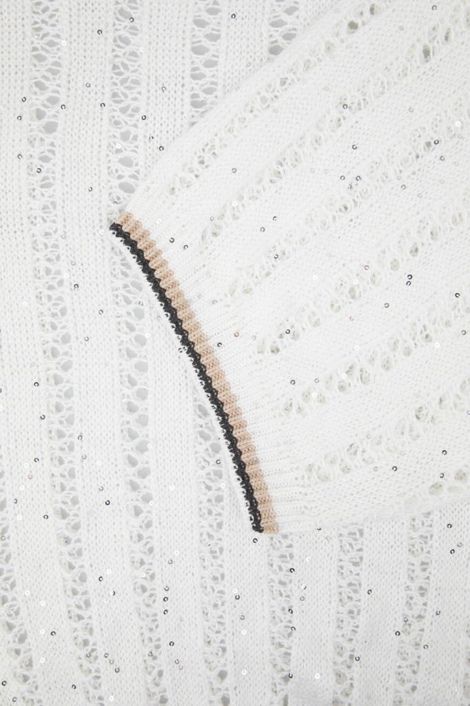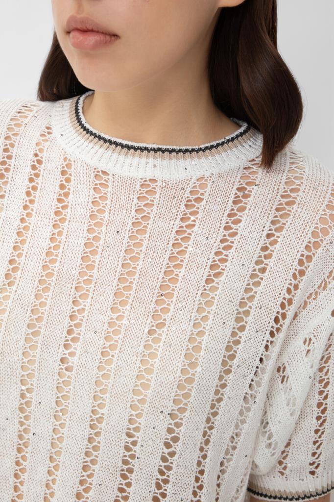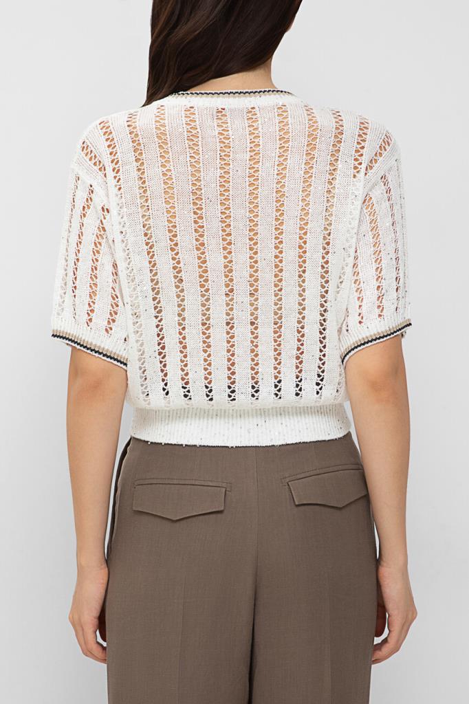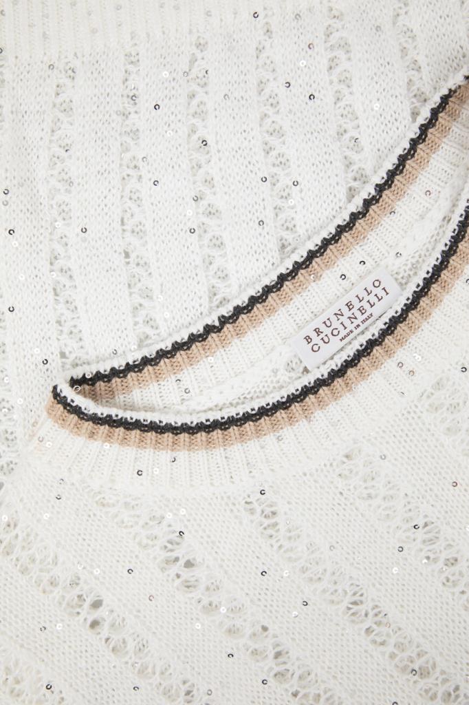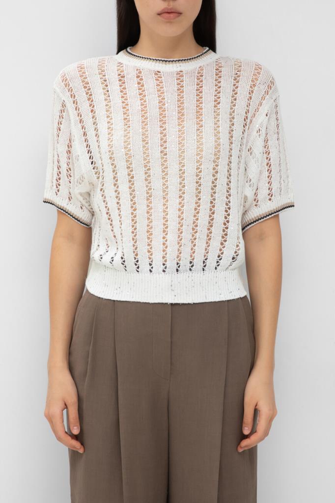 Вязаный свитер-топ BRUNELLO CUCINELLI с декором из сияющих пайеток. Для изготовления полупрозрачной ажурной модели прямого силуэта выбран смесовый трикотаж на основе прочного нейлона и льна белого цвета. Особенностью изделия стали полосы-кант на круглом вырезе горловины и снизу на манжетах рукавов. Топ будет смотреться выигрышно в тандеме с брюками с классическими стрелками и двойными защипами сверху из той же коллекции.