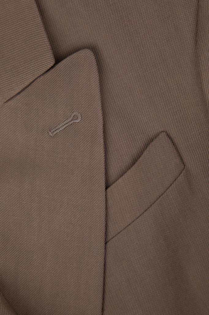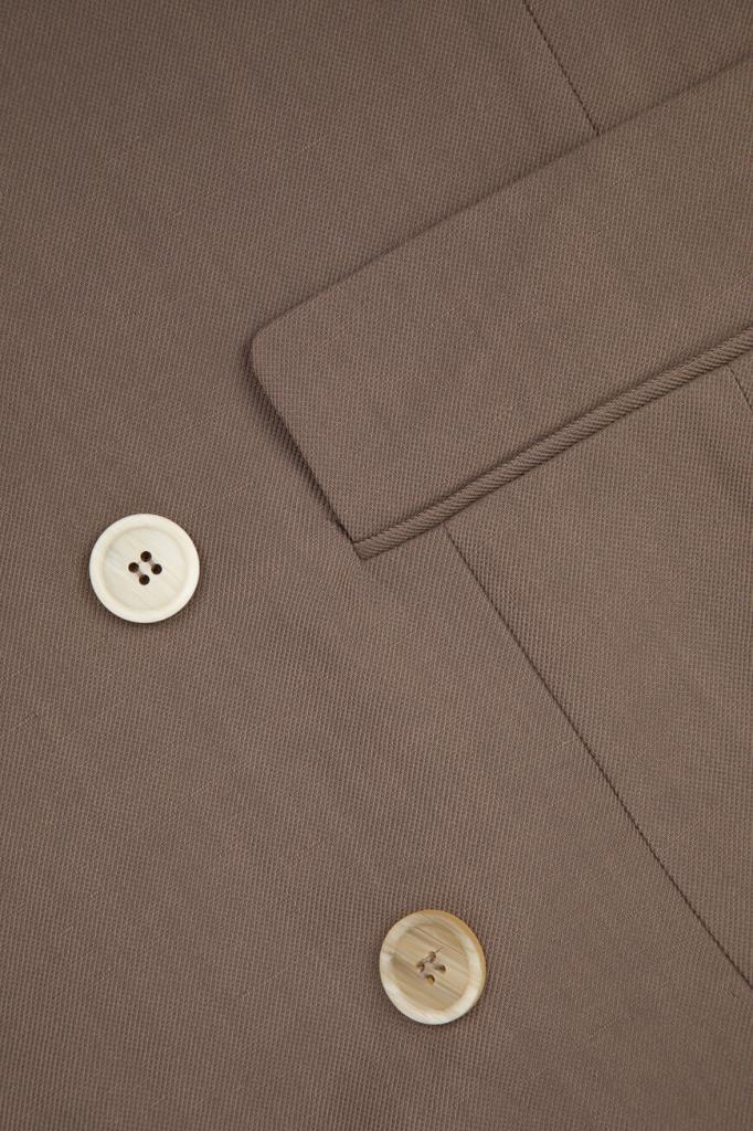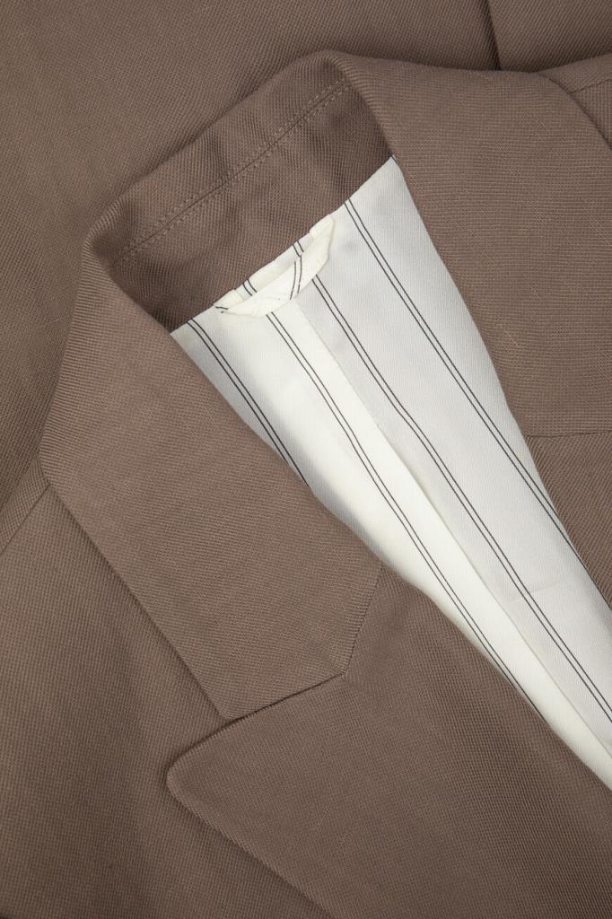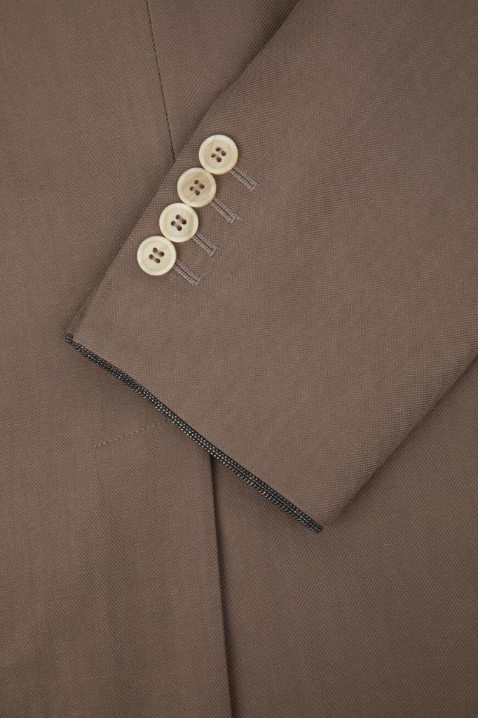 Пиджак BRUNELLO CUCINELLI выполнен в оттенке какао. Для создания изделия с заострёнными лацканами выбран мягкий твил Fluid на основе льна и прочного вискозного волокна, который по-новому интерпретирует классическую модель. На струящейся текстуре ткани выделяются крупные роговые пуговицы, характеризующие двубортный мужской фасон, традиционный нагрудный карман с листочкой слева и прорезные карманы с клапанами по бокам. Манжеты подчёркивают полосы из рядов ценной цепочки Мониль.