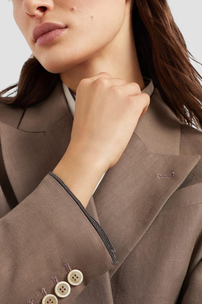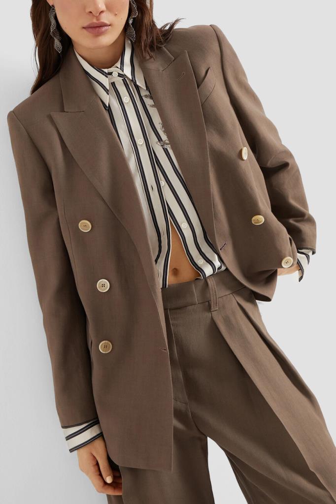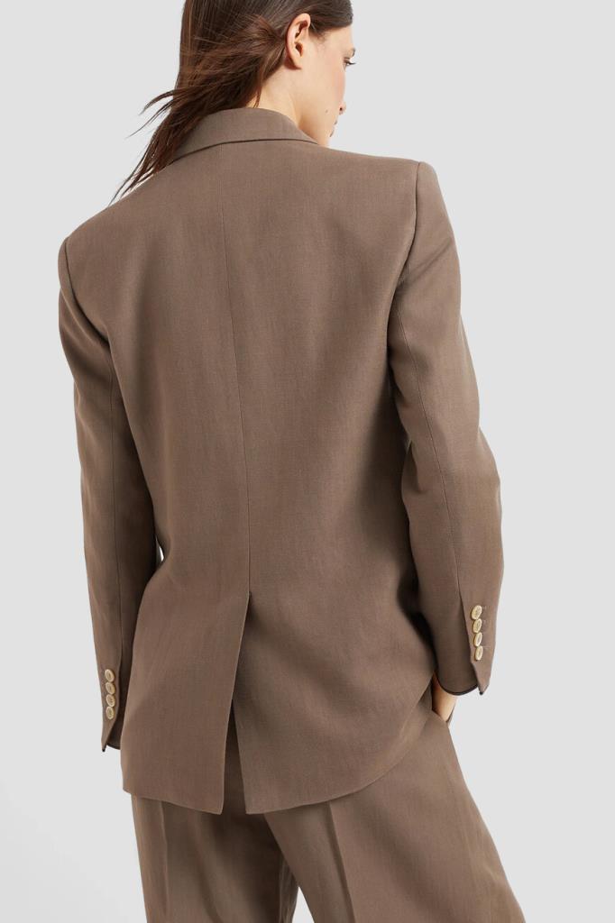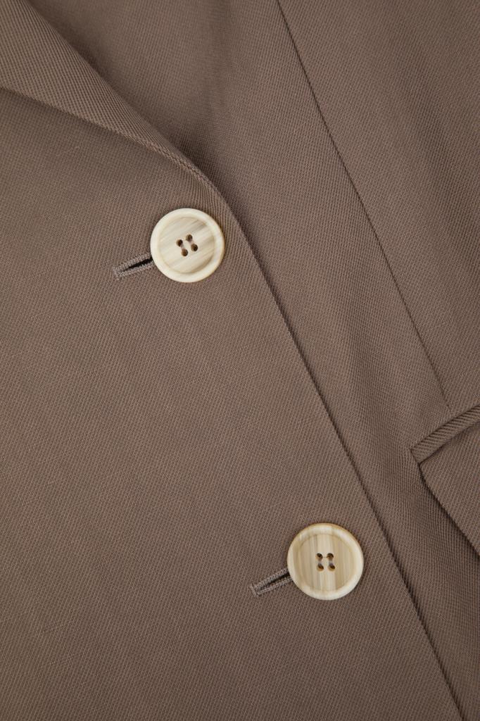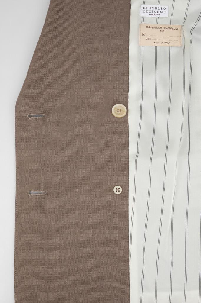 Пиджак BRUNELLO CUCINELLI выполнен в оттенке какао. Для создания изделия с заострёнными лацканами выбран мягкий твил Fluid на основе льна и прочного вискозного волокна, который по-новому интерпретирует классическую модель. На струящейся текстуре ткани выделяются крупные роговые пуговицы, характеризующие двубортный мужской фасон, традиционный нагрудный карман с листочкой слева и прорезные карманы с клапанами по бокам. Манжеты подчёркивают полосы из рядов ценной цепочки Мониль.