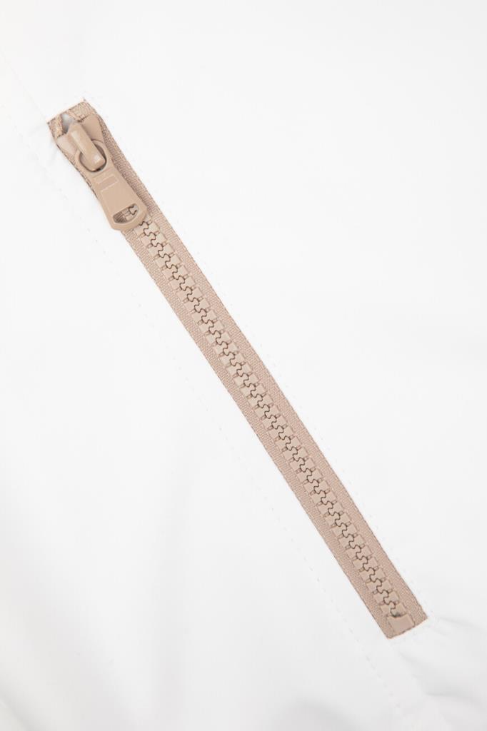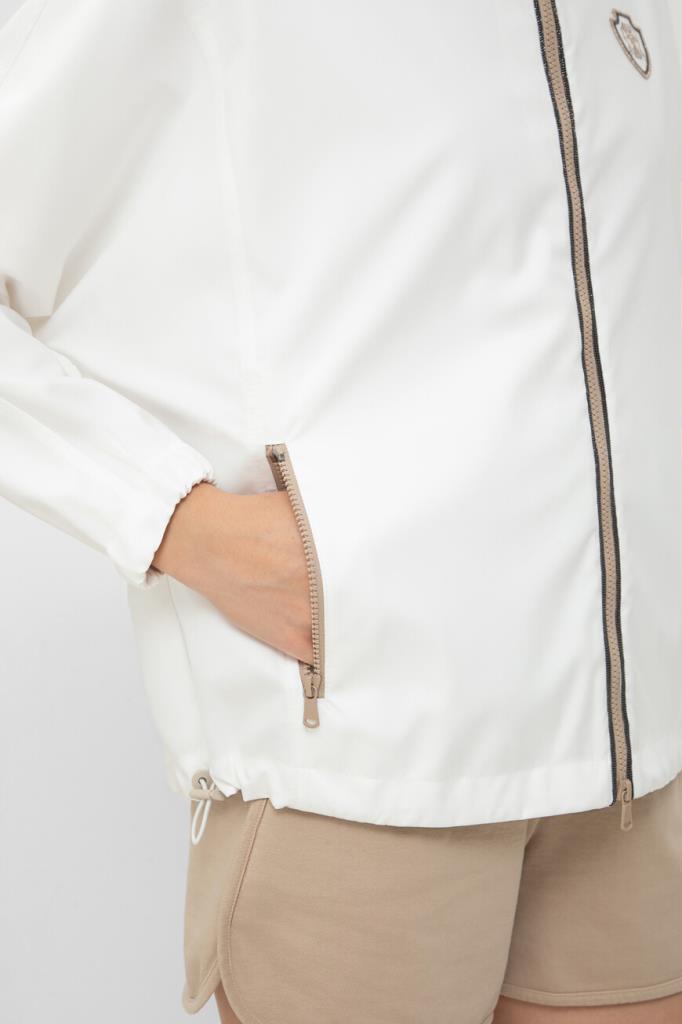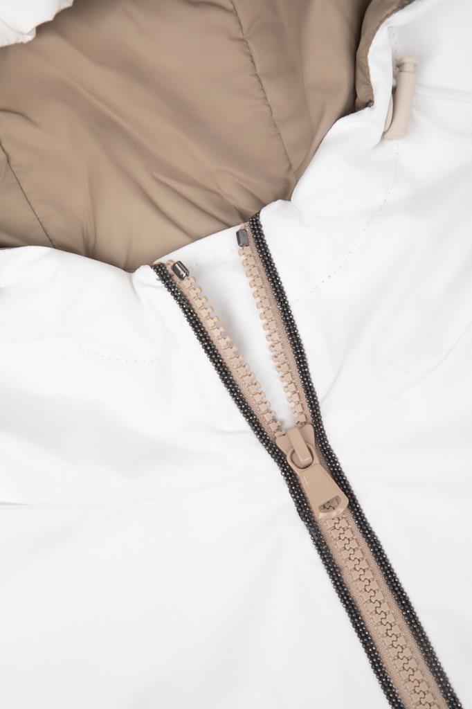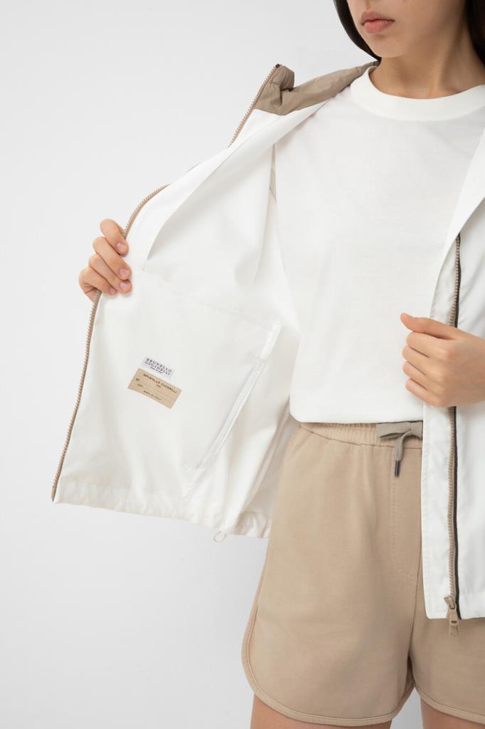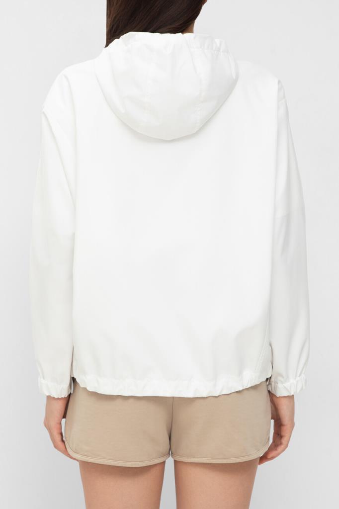 Куртка с глубоким капюшоном на кулисках от BRUNELLO CUCINELLI. Изделие выполнено из высокопрочного полиэфира белого цвета. Для оптимальной посадки свободной модели по фигуре предусмотрены эластичный пояс на кулисках и манжеты-резинки. Атрибутами Дома являются полосы из рядов ценной цепочки Мониль по обе стороны застёжки, а также знаковая эмблема-герб с лого-монограммой слева на груди.