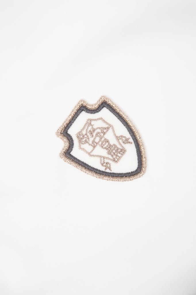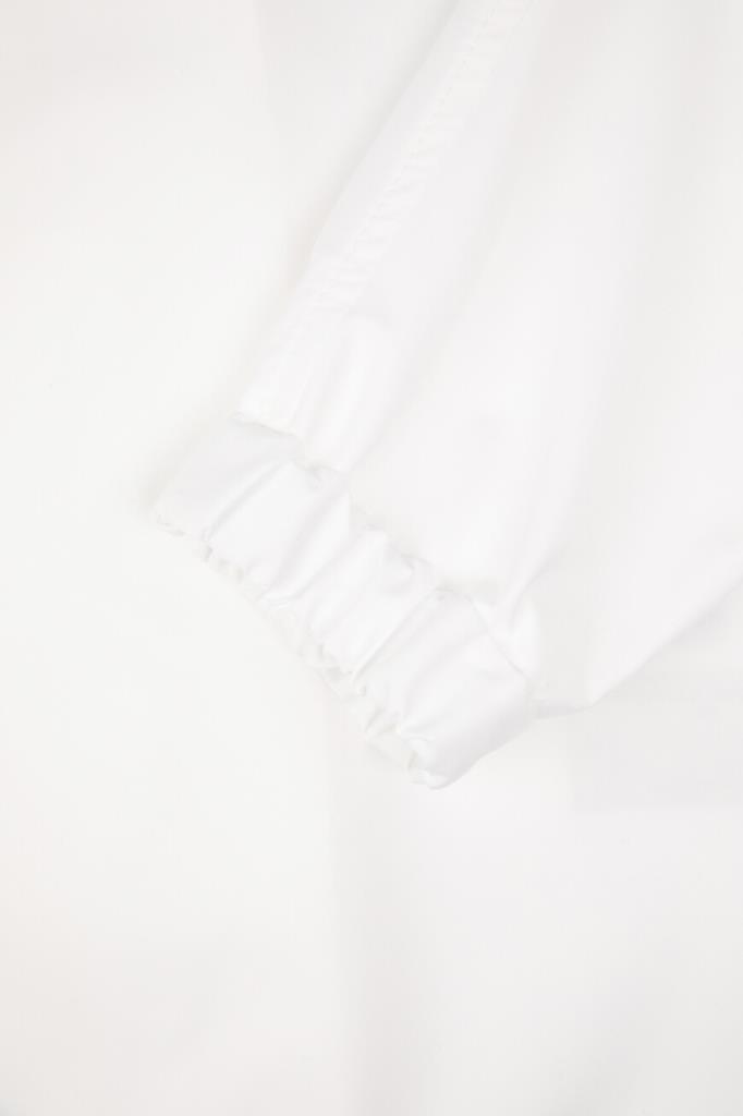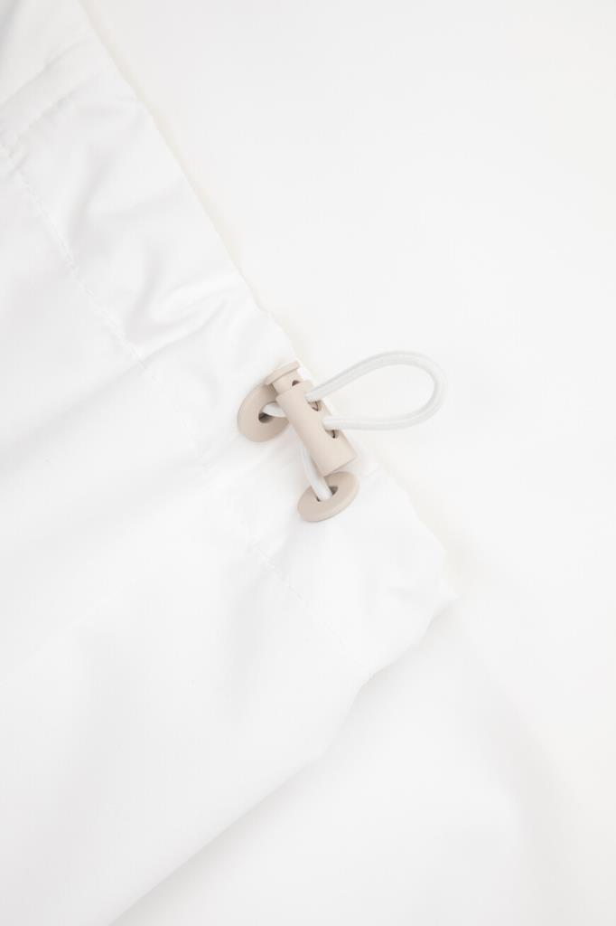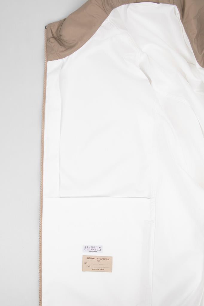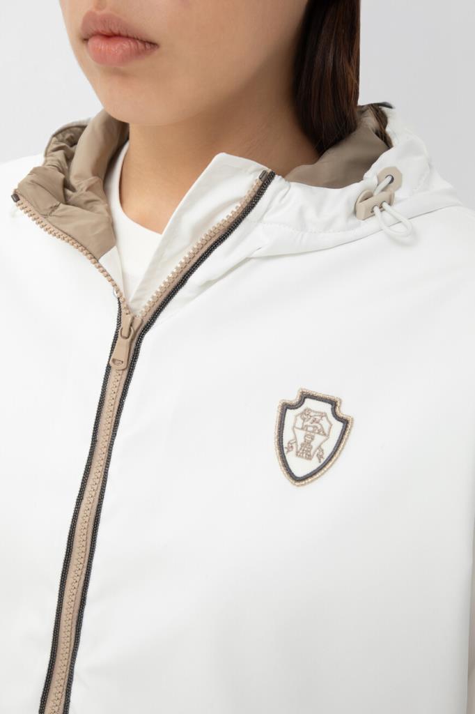 Куртка с глубоким капюшоном на кулисках от BRUNELLO CUCINELLI. Изделие выполнено из высокопрочного полиэфира белого цвета. Для оптимальной посадки свободной модели по фигуре предусмотрены эластичный пояс на кулисках и манжеты-резинки. Атрибутами Дома являются полосы из рядов ценной цепочки Мониль по обе стороны застёжки, а также знаковая эмблема-герб с лого-монограммой слева на груди.