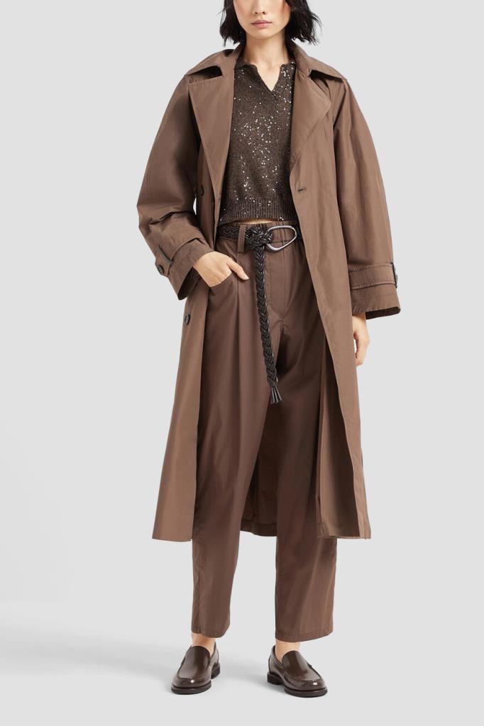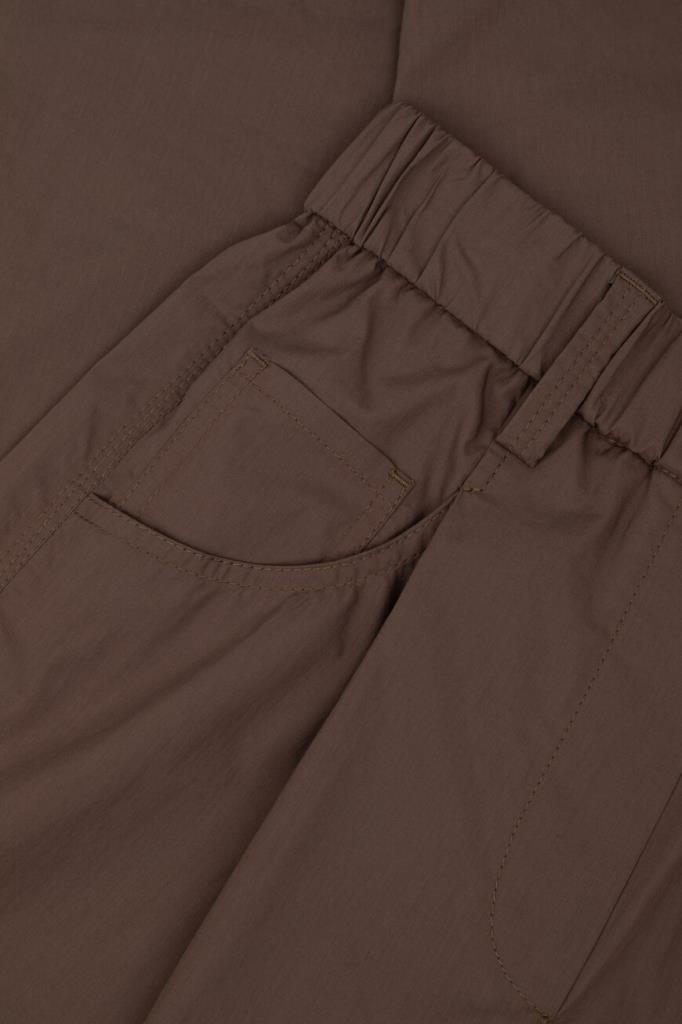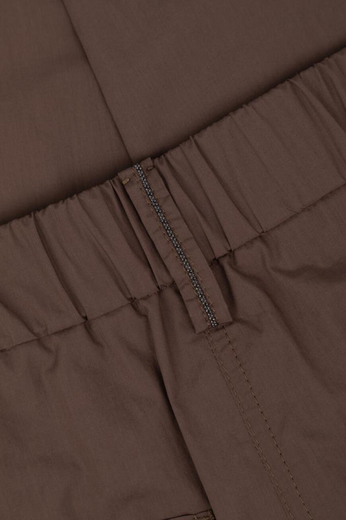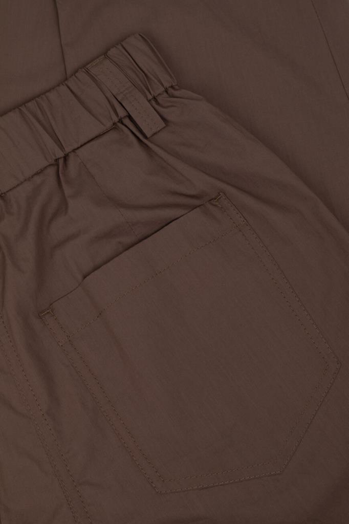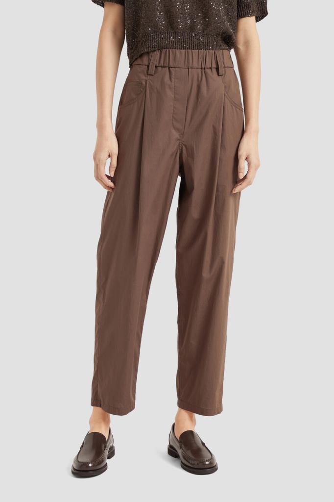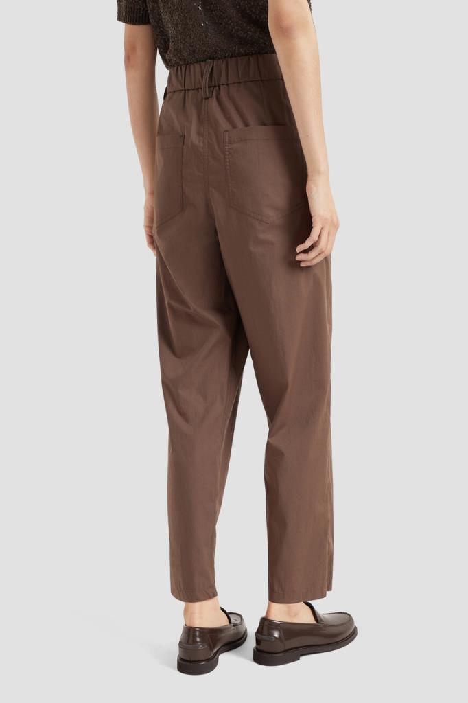 Брюки Track из лёгкого хлопкового поплина от BRUNELLO CUCINELLI. Классическая рубашечная ткань тёмно-коричневого цвета подчёркивает неформальный стиль модели, характеризующейся мягким кроем и практичным эластичным поясом-резинкой на уровне талии. Изделие укороченного силуэта дополнено защипами спереди оснащено пятью карманами. О принадлежности брюк Дому деликатно напоминает вышивка из рядов ценной цепочки Мониль на шлевке сзади.