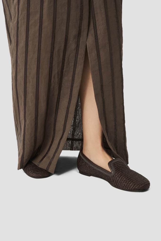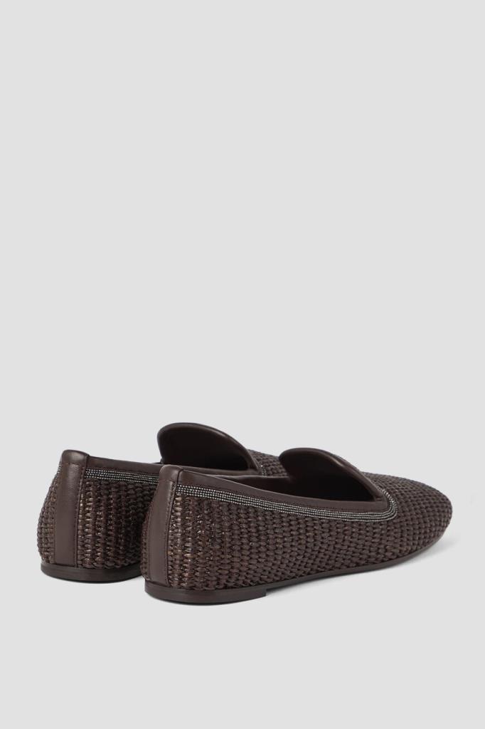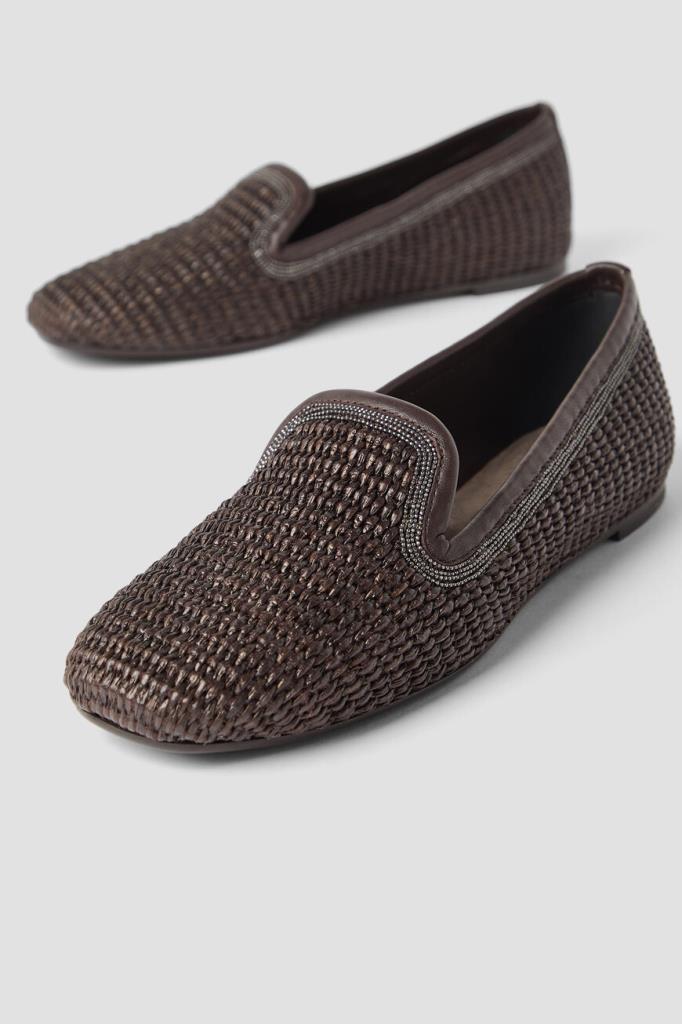 Слиперы Brunello Cucinelli из высокотехнологичной тёмно-коричневой рафии. Плетёная текстура придаёт изделию натуральный вид, а кожаные кант и деталь на заднике, а также подкладка из бархатистой замши образуют фактурный контраст. Атрибутом Дома выступает полоса-окантовка из рядов блестящей серебристой цепочки Мониль — легендарный декор коллекций Дома.