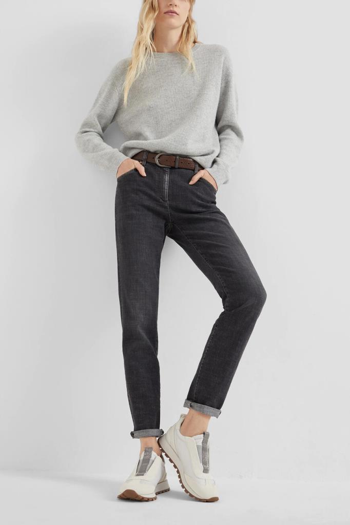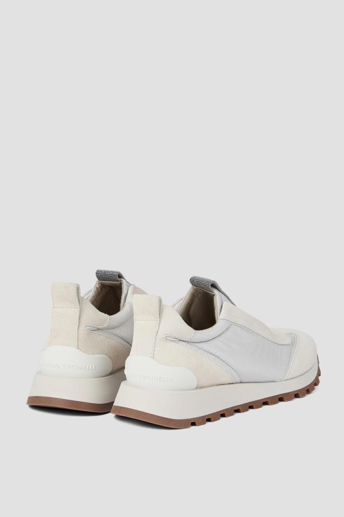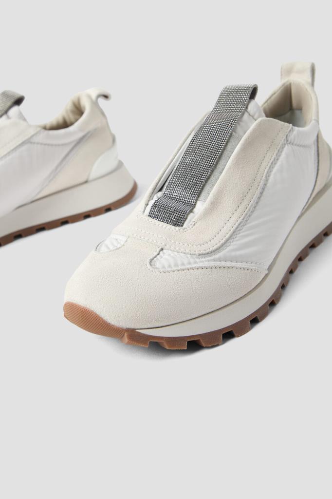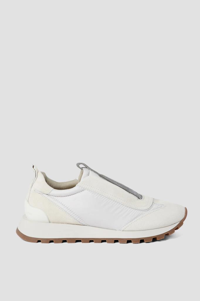 Белые сникеры BRUNELLO CUCINELLI выполнены без шнуровки. Для создания комбинированной пары обуви используются плотный нейлон и бархатистая замша. Модель установлена на двухцветную подошву из лёгкого материала ЭВА с протектором из ТПУ для надёжного сцепления с дорогой. Отличительной деталью является лента-полоса из рядов блестящей цепочки Мониль, размещённая на язычке.