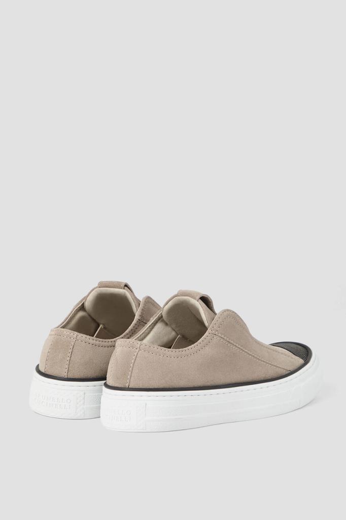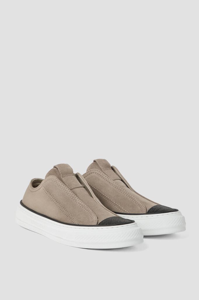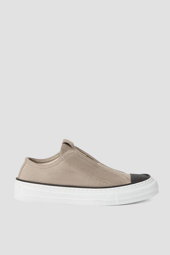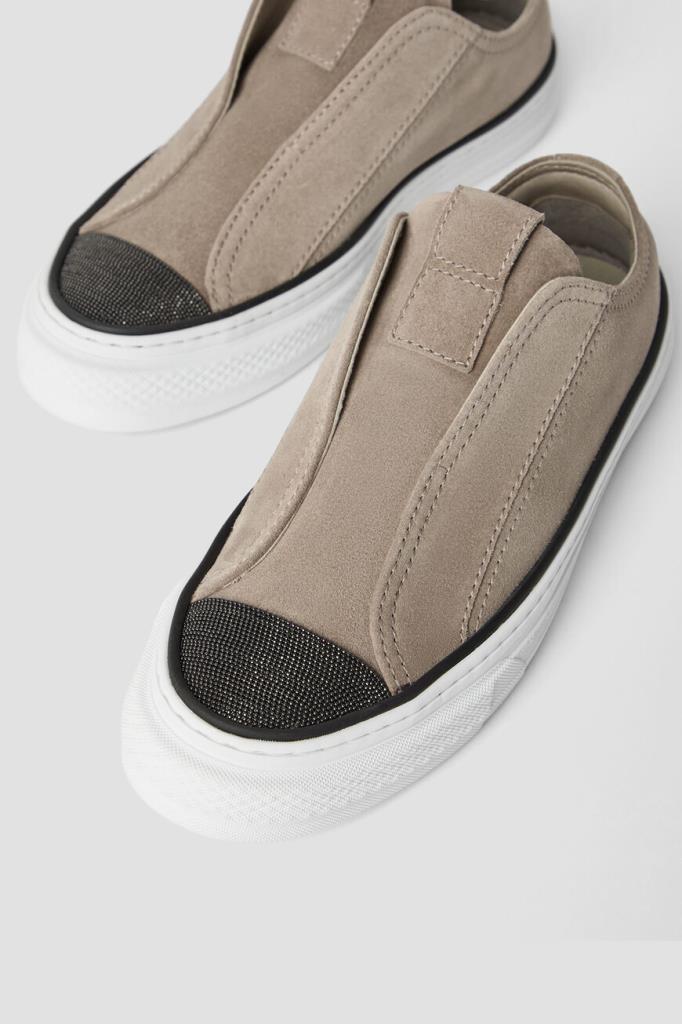 Замшевые сникеры-слипоны BRUNELLO CUCINELLI с вышивкой на носке. Изделие без шнуровки отличается наличием эластичных потайных вставок под язычком и ленты для удобства надевания, а также заниженной задней частью. Декором выступают вставка из рядов ценной цепочки Мониль на союзке, рельефный чёрный кант у основания и тиснёный лого Дома сзади на подошве.