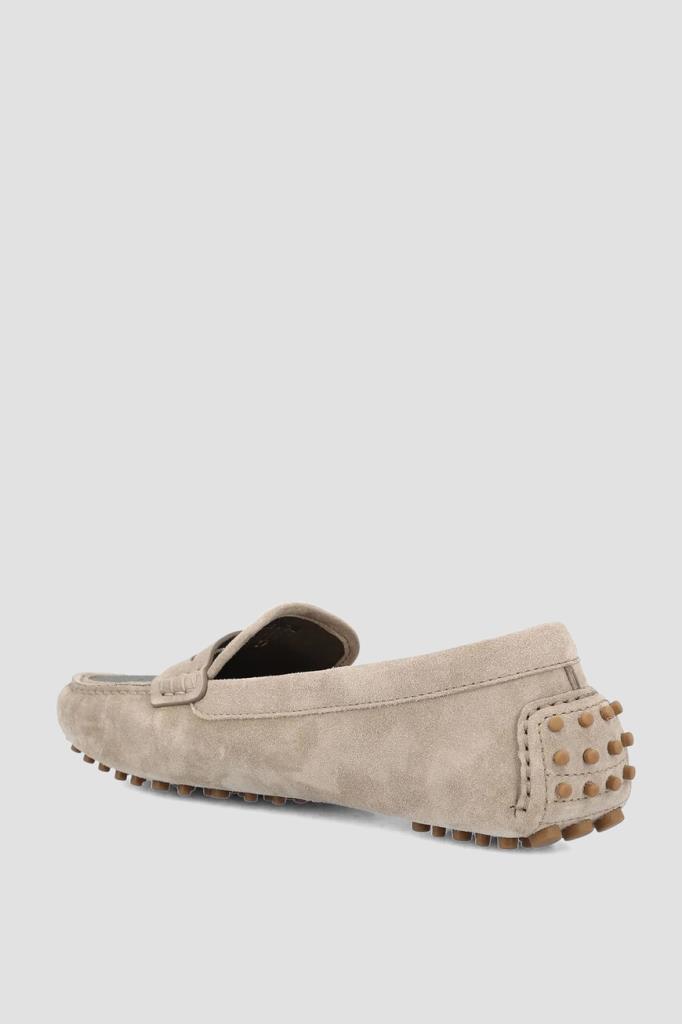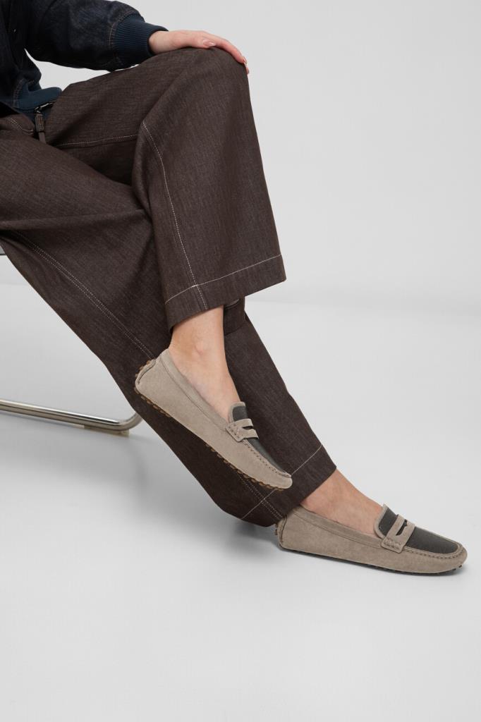 Замшевые мокасины Brunello Cucinelli классическим поперечным ремешком с прорезью. Изделие серо-коричневого оттенка отличается наличием знакового декора-вышивки из рядов серебристой цепочки Мониль на союзке, а также светло-коричневыми фигурными накладками-деталями из резины в задней части и на подошве. Удобная пара с двойной прострочкой на носке станет идеальным завершением Ваших casual-комплектов.