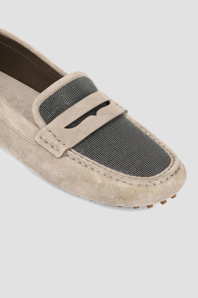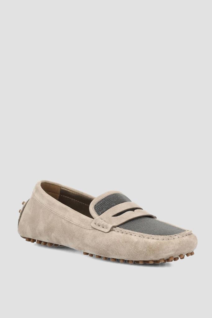 Замшевые мокасины Brunello Cucinelli классическим поперечным ремешком с прорезью. Изделие серо-коричневого оттенка отличается наличием знакового декора-вышивки из рядов серебристой цепочки Мониль на союзке, а также светло-коричневыми фигурными накладками-деталями из резины в задней части и на подошве. Удобная пара с двойной прострочкой на носке станет идеальным завершением Ваших casual-комплектов.