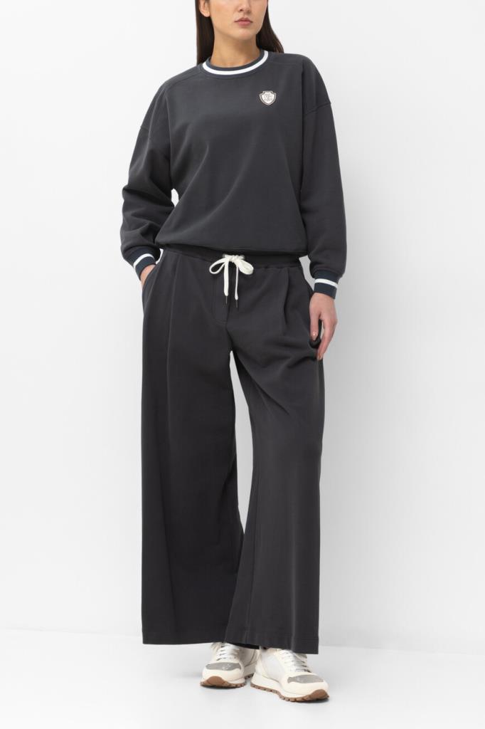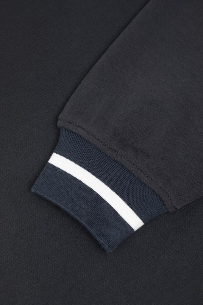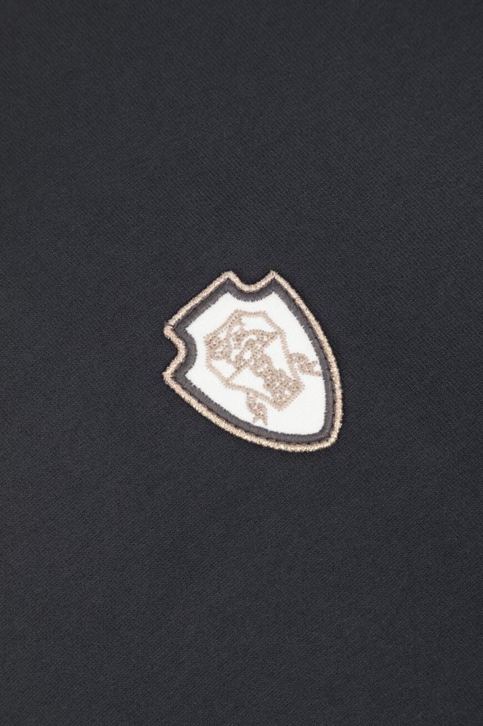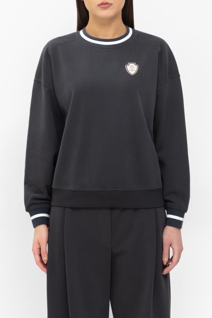 Свитшот BRUNELLO CUCINELLI выполнен из мягкого хлопкового флиса. Модель свободного силуэта интересна длинными рукавами со спущенной линией плечевого шва, широким эластичным поясом и манжетами-резинками для комфортной посадки. На принадлежность изделия Дому указывает знаковая эмблема-герб с лого-монограммой, расположенная слева на груди. Круглый вырез горловины и манжеты рукавов на несколько тонов светлее фона обрамлены белой полосой посередине.