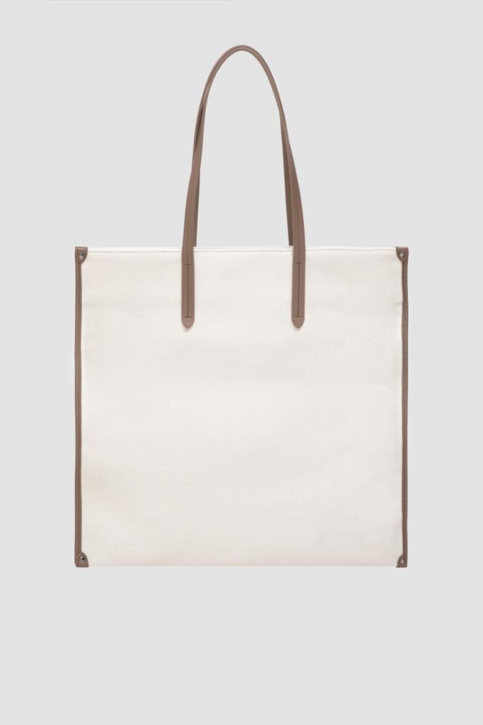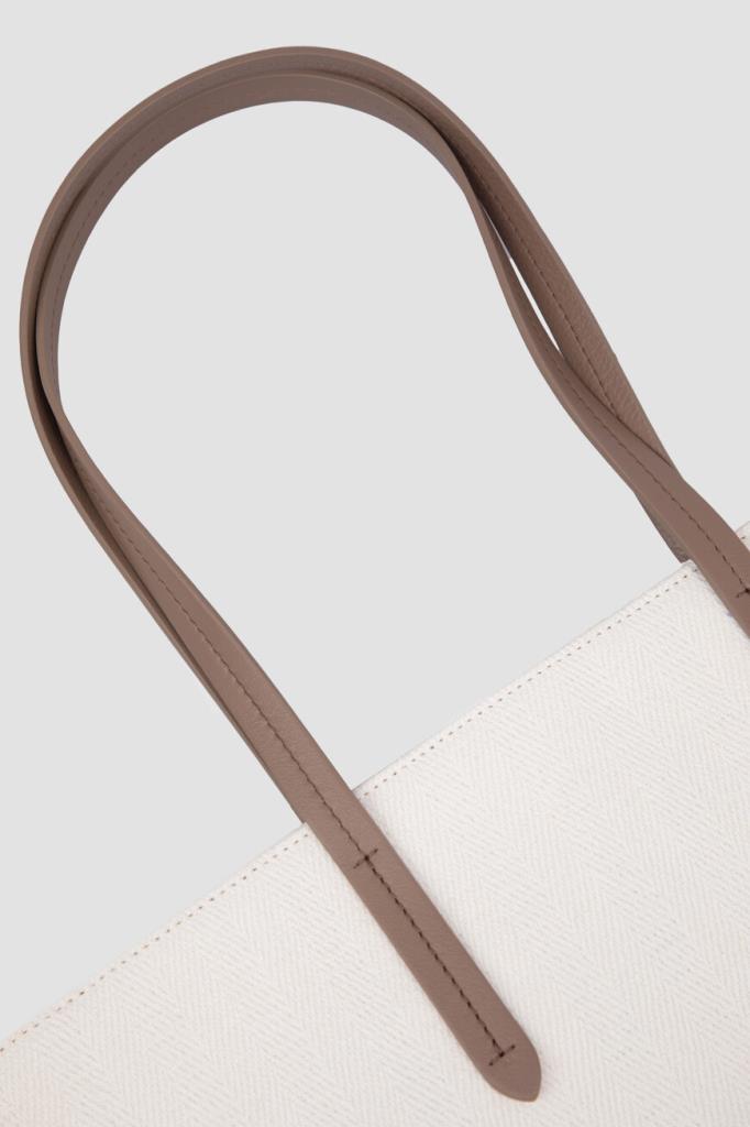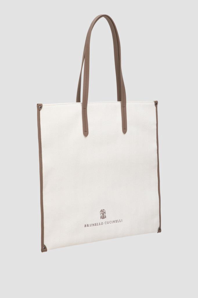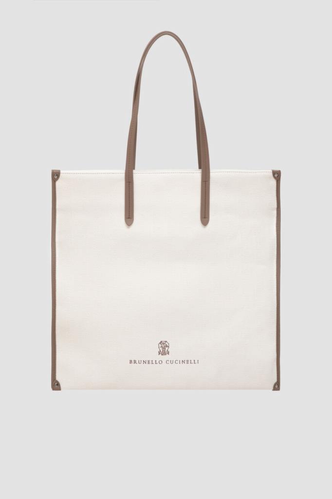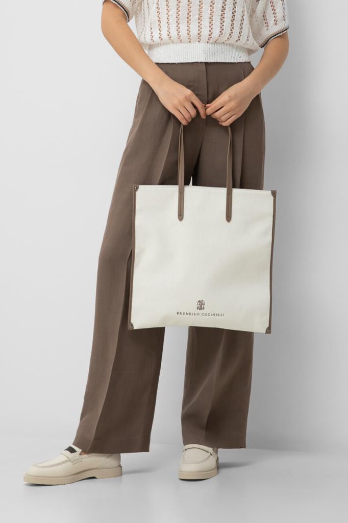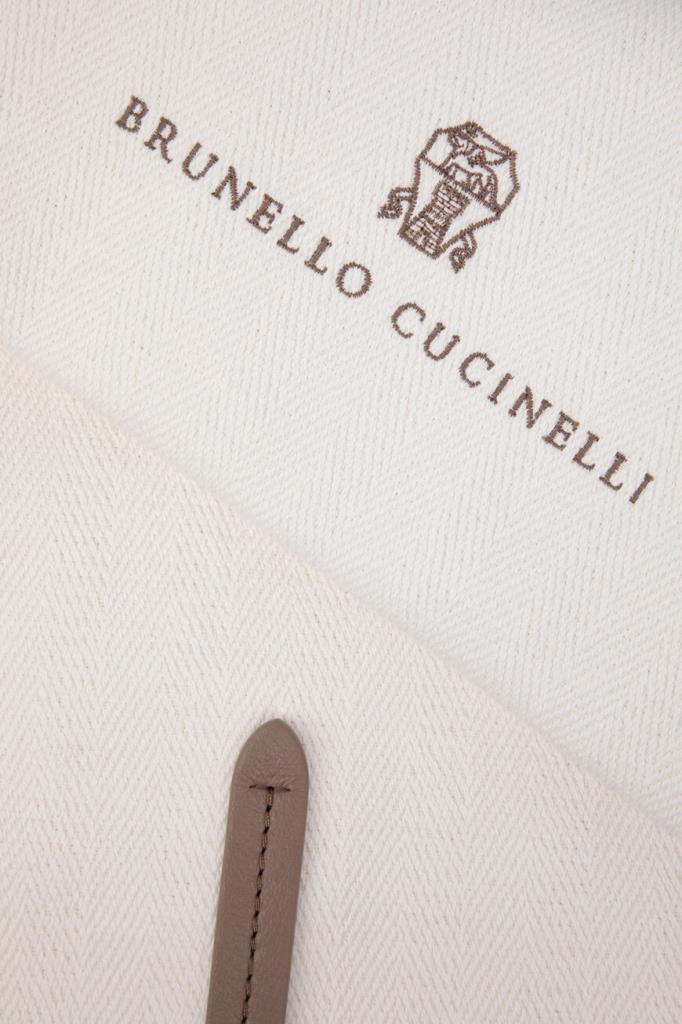 Сумка-шоппер BRUNELLO CUCINELLI с геометрическим узором в «ёлочку». Вместительная плоская модель квадратного формата, сшитая из мягкого трикотажа на основе хлопка и льна, хорошо держит заданную форму. Боковины отделаны мягкой телячьей кожей, а спереди расположены вышитые логотип и монограмма Дома.