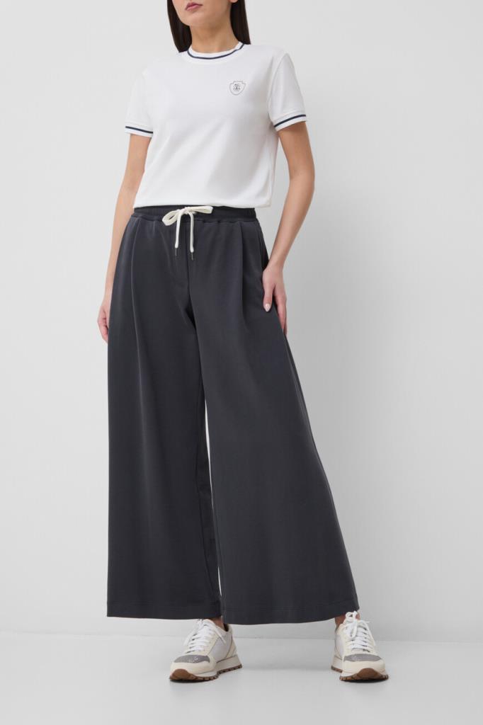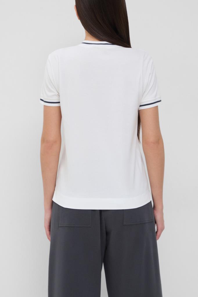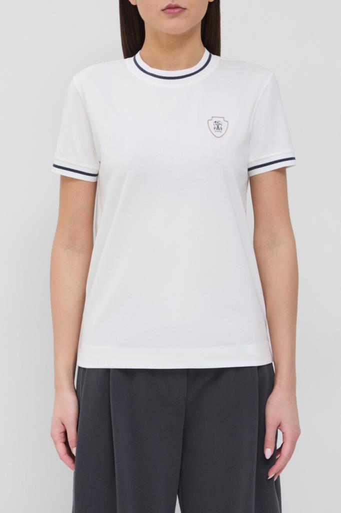 Хлопковая футболка BRUNELLO CUCINELLI с неглубокими боковыми разрезами. Фирменная эмблема Solomeo на модели белого базового цвета помещена в центр щита с прошитым рельефным кантом. Круглый вырез горловины и манжеты рукавов подчёркнуты полосами посередине и оформлены резинкой.