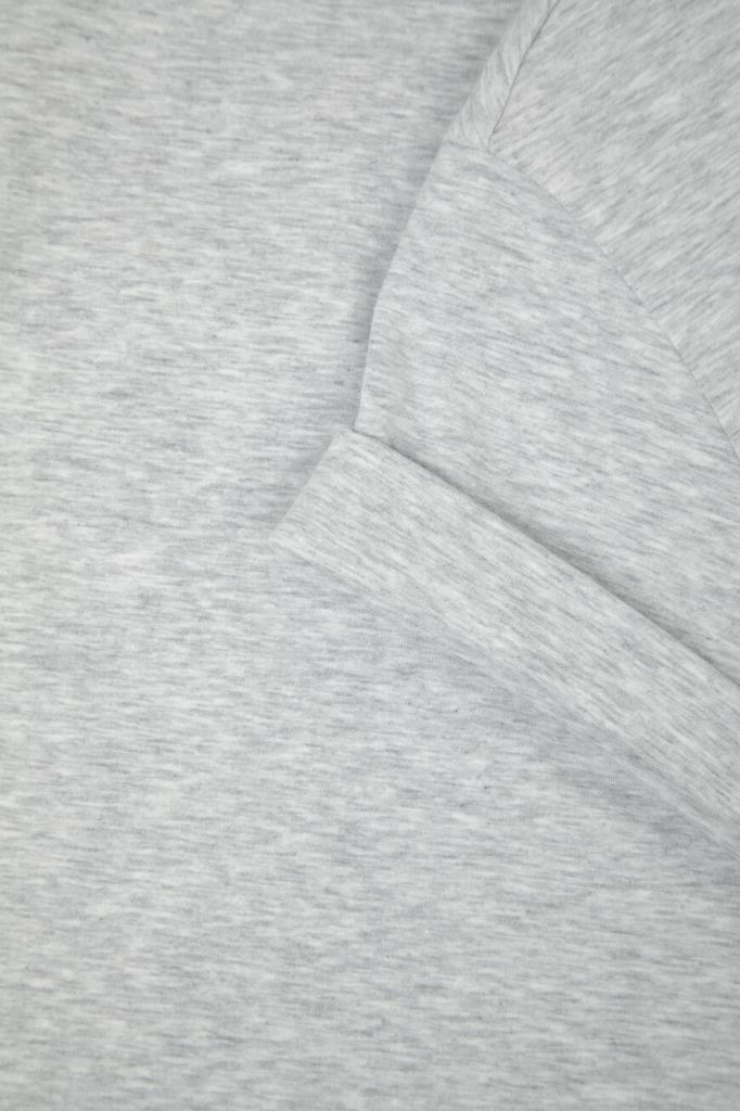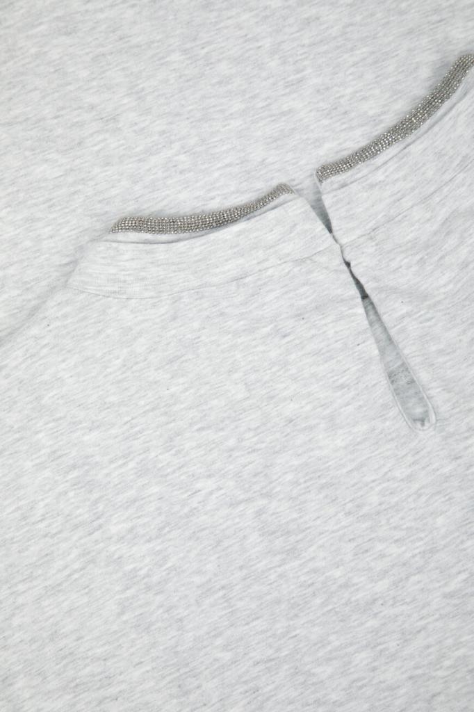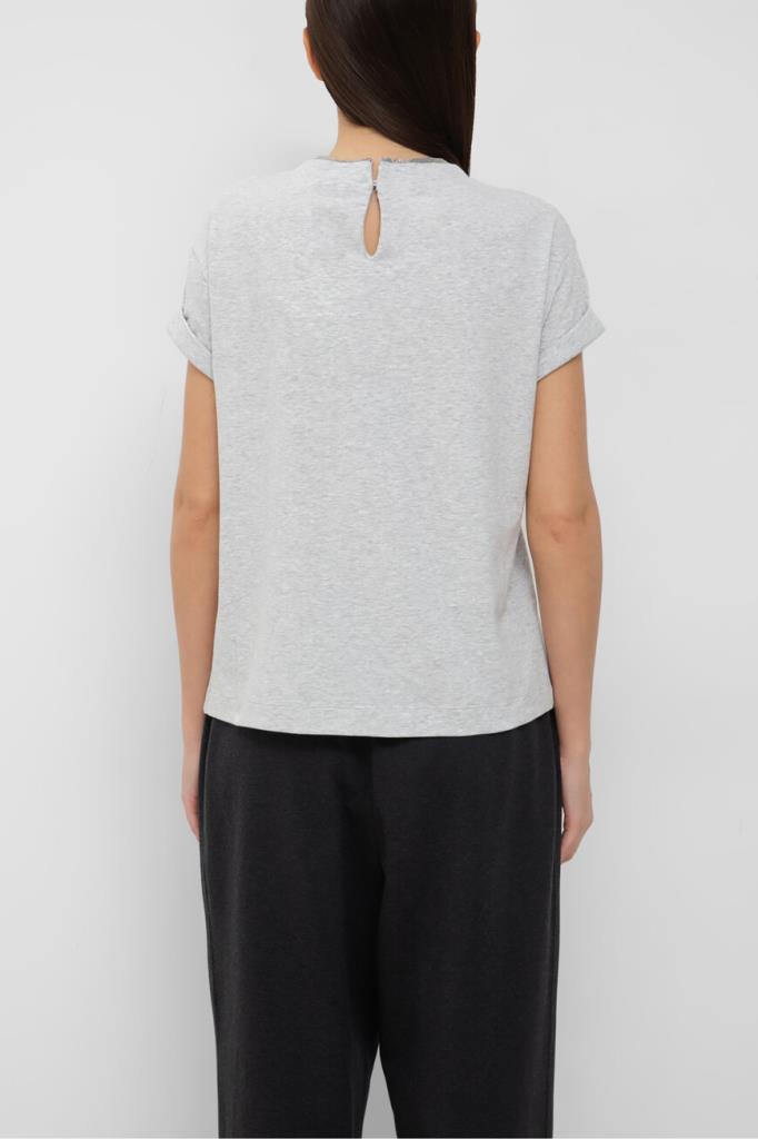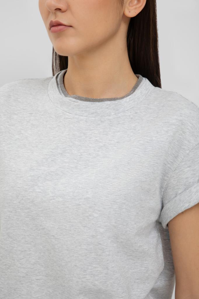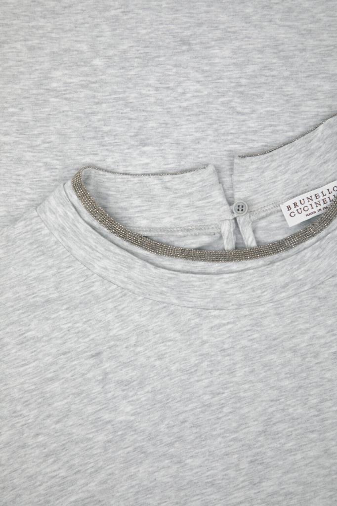Футболка BRUNELLO CUCINELLI с многослойным воротником. Фасон повседневной модели из эластичного хлопкового трикотажа светло-серого цвета, характеризуется свободным силуэтом и наличием подворотов на манжетах. На принадлежность меланжевого изделия Дому указывает вышивка из рядов блестящей серебристой цепочки Мониль вдоль круглого выреза горловины.