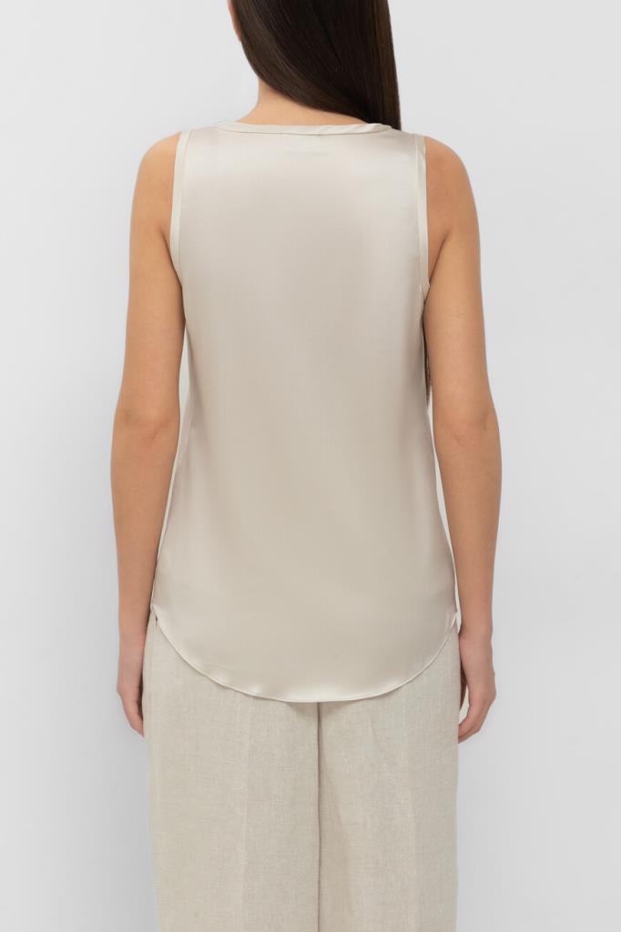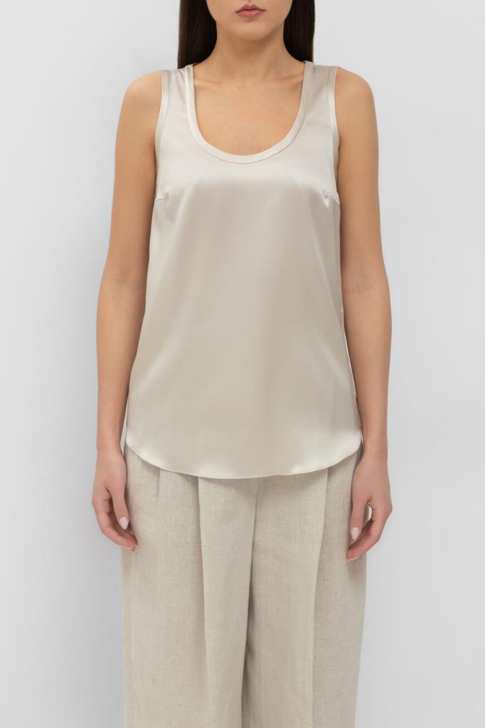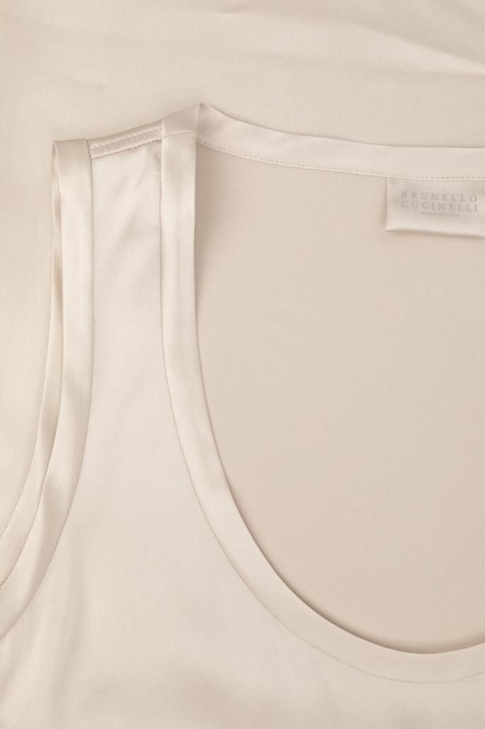 Струящийся топ BRUNELLO CUCINELLI с глубоким U-образным вырезом. Модель изготовлена из эластичного шелкового атласа с характерным деликатным блеском на поверхности. Почти невесомый материал нежно скользит по коже, оставляя на ней ощущение лёгкой прохлады. Изделие закруглённого прилегающего силуэта, стилизованное под майку, станет универсальным решением в гардеробе.