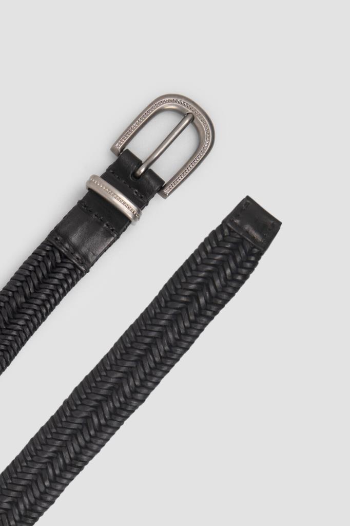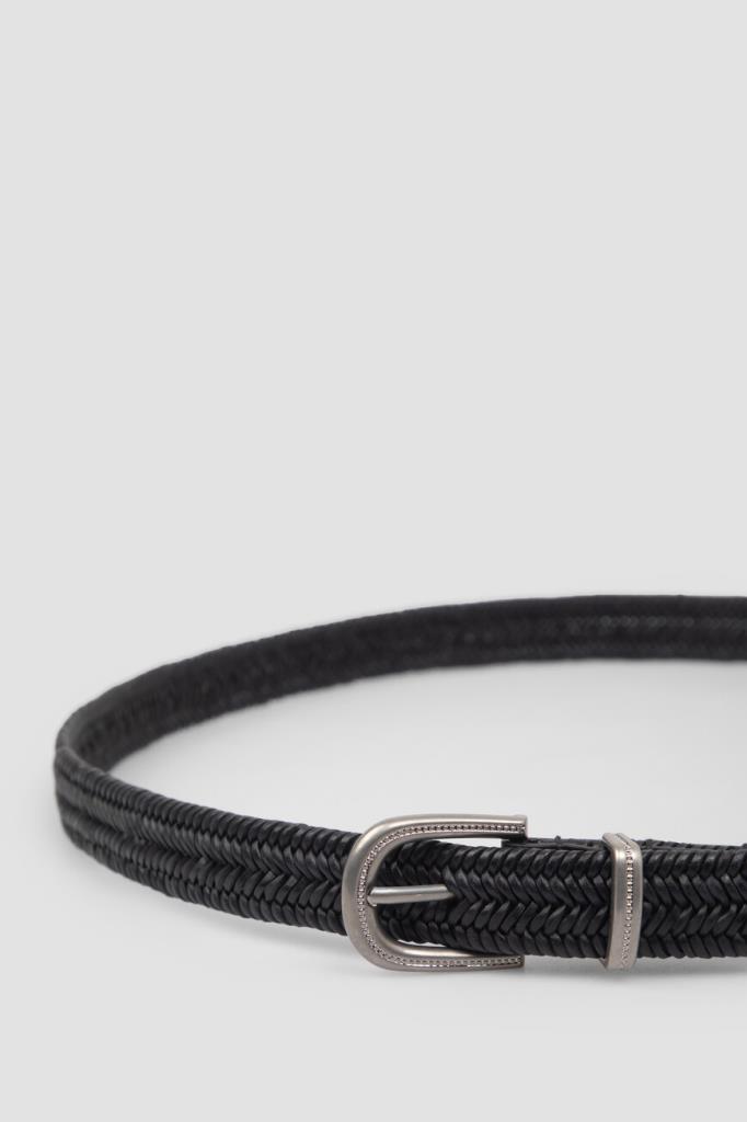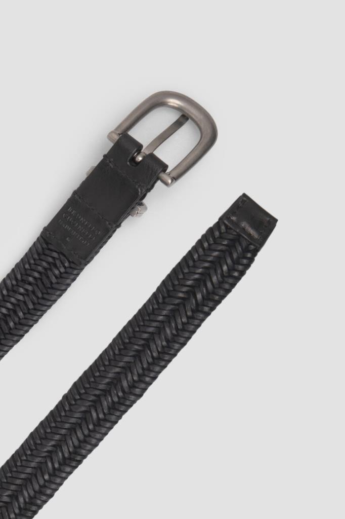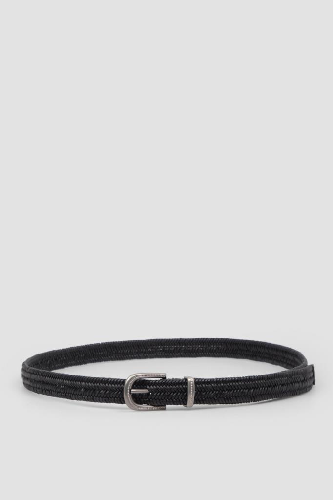 Плетёный ремень чёрного цвета от BRUNELLO CUCINELLI. Модель состоит из полос мягкой телячьей кожи, образующих между собой геометрический узор с трёхмерным эффектом. Добавление небольшого количества вискозного волокна в состав материала делает кожу более эластичной. Отличительными деталями являются закруглённая пряжка и тренчик из металла серебристого оттенка с декорацией.