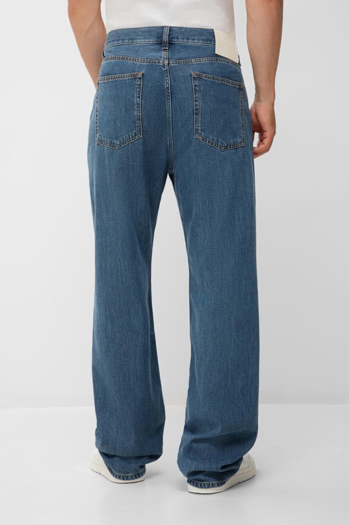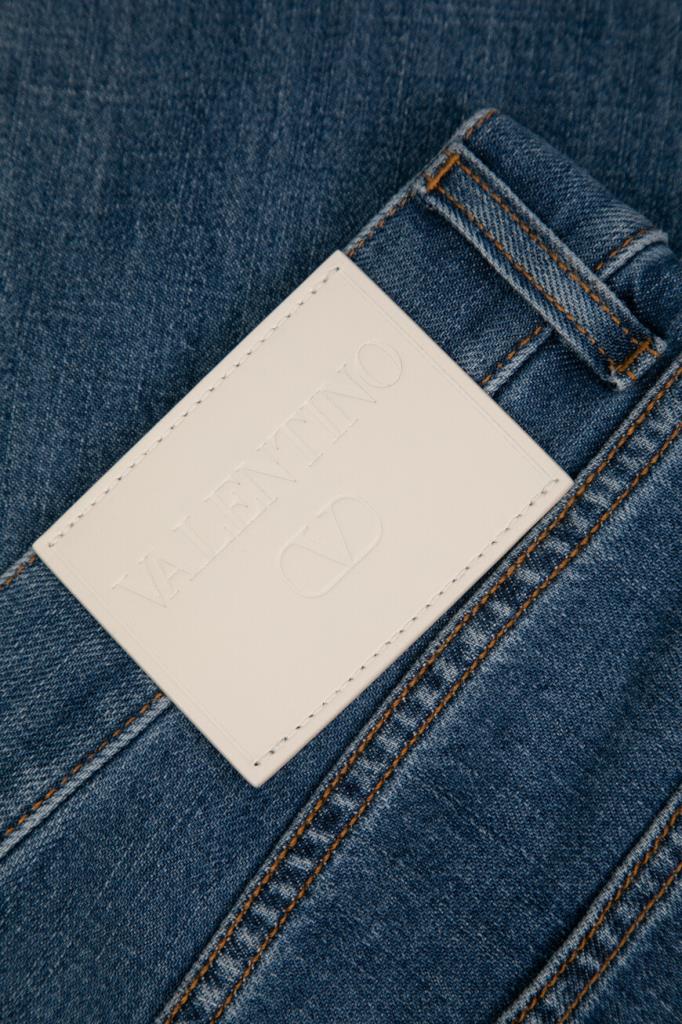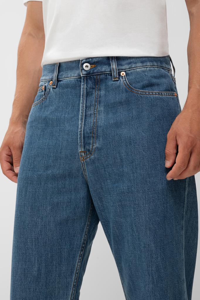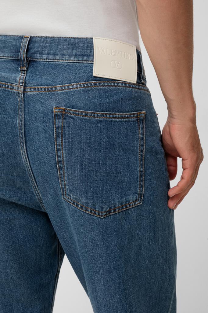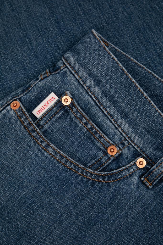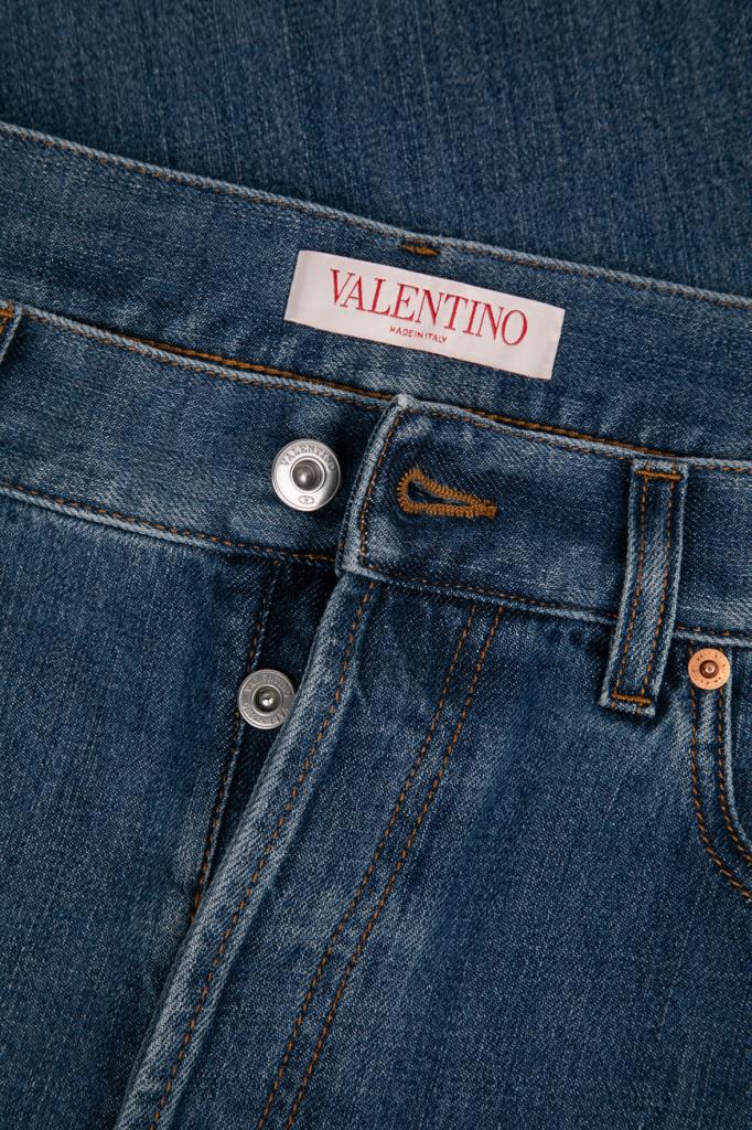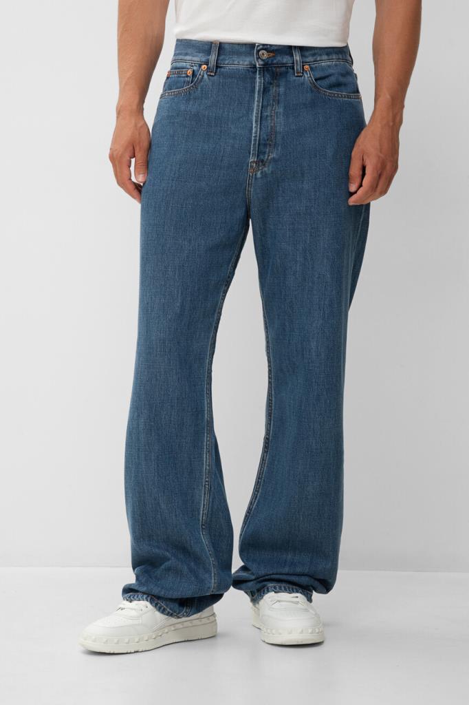 Джинсы VALENTINO с оранжевой прострочкой на швах. Модель из мягкого денима на основе хлопка и лиоцелла выполнена в синем цвете с дизайнерскими потёртостями. Фасон изделия предполагает мешковатый крой и пять карманов. О принадлежности джинсов бренду напоминает белая кожаная нашивка с тиснёными логотипом и монограммой на поясе сзади. Модель смотрится гармонично в комплекте с хлопковой футболкой и синей курткой с эффектом делаве из той же коллекции.