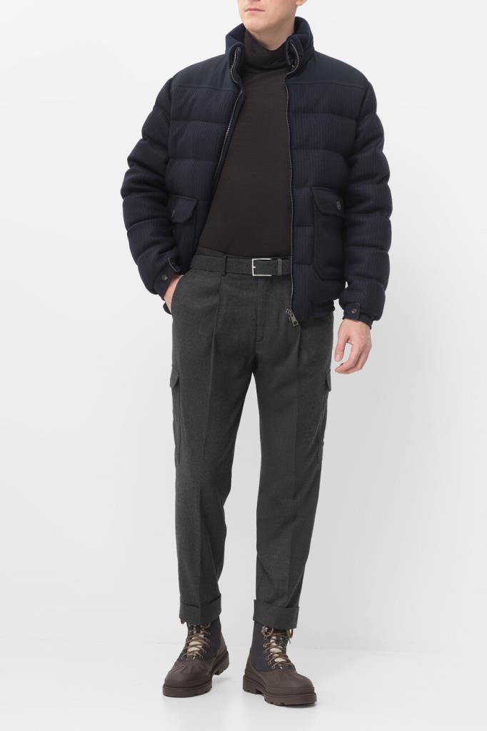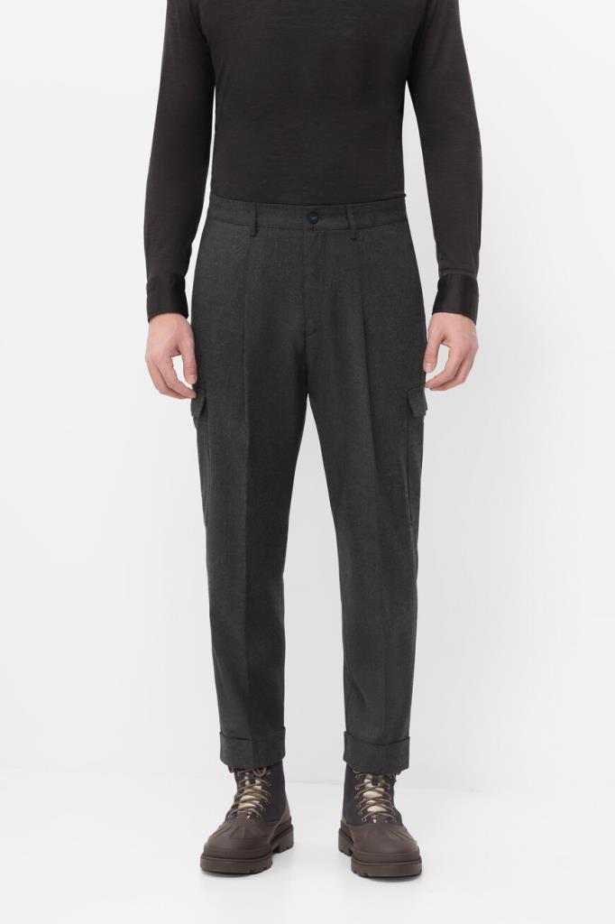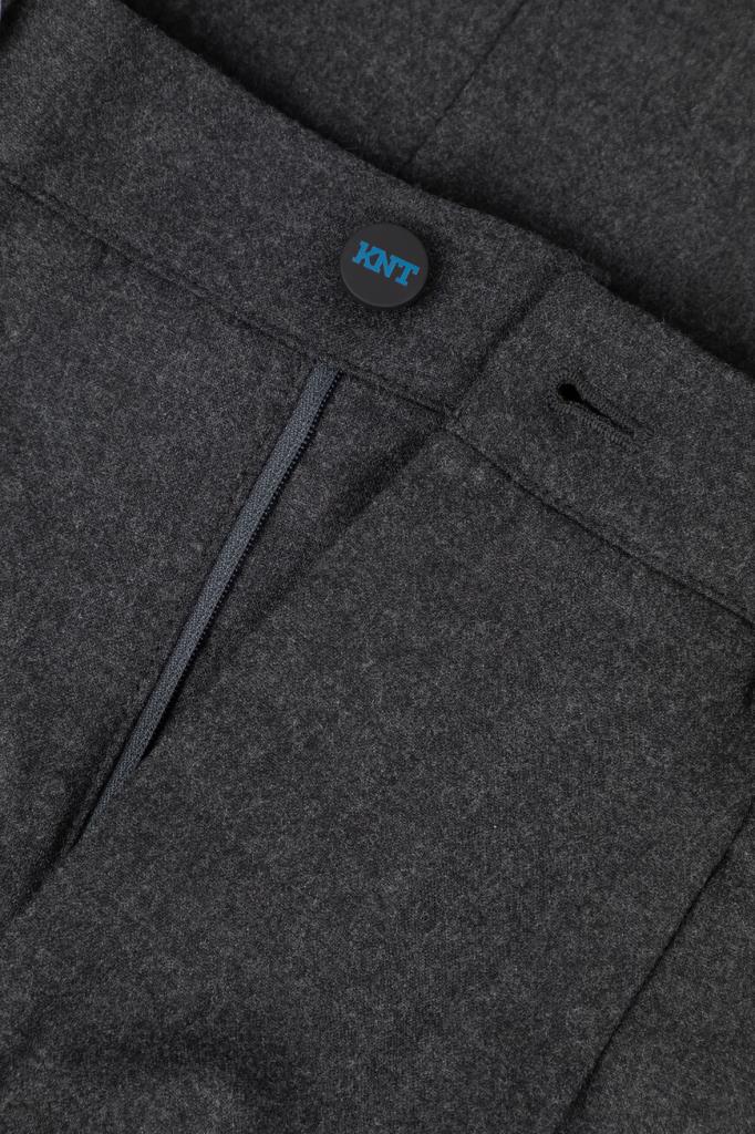 Прямые брюки Kiton с классическими стрелками и защипами сверху. Модель с пятью карманами изготовлена из мягкой шерсти тёмно-серого цвета с добавлением эластичных волокон. Отличительными особенностями изделия являются накладка с рельефной надписью-названием коллекции KNT и белым логотипом на поясе сзади и наличие подворотов. Брюки с застёжкой на потайную молнию и брендированную матовую пуговицу с планкой станут основой Ваших повседневных комплектов.