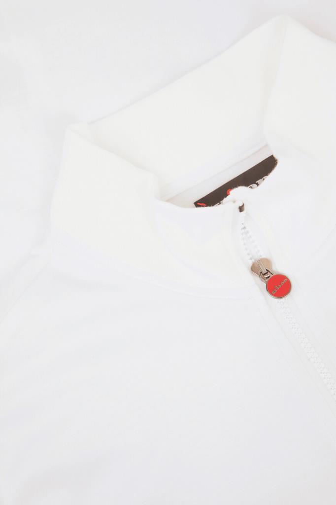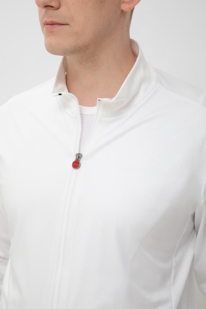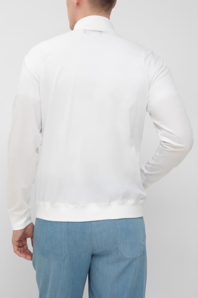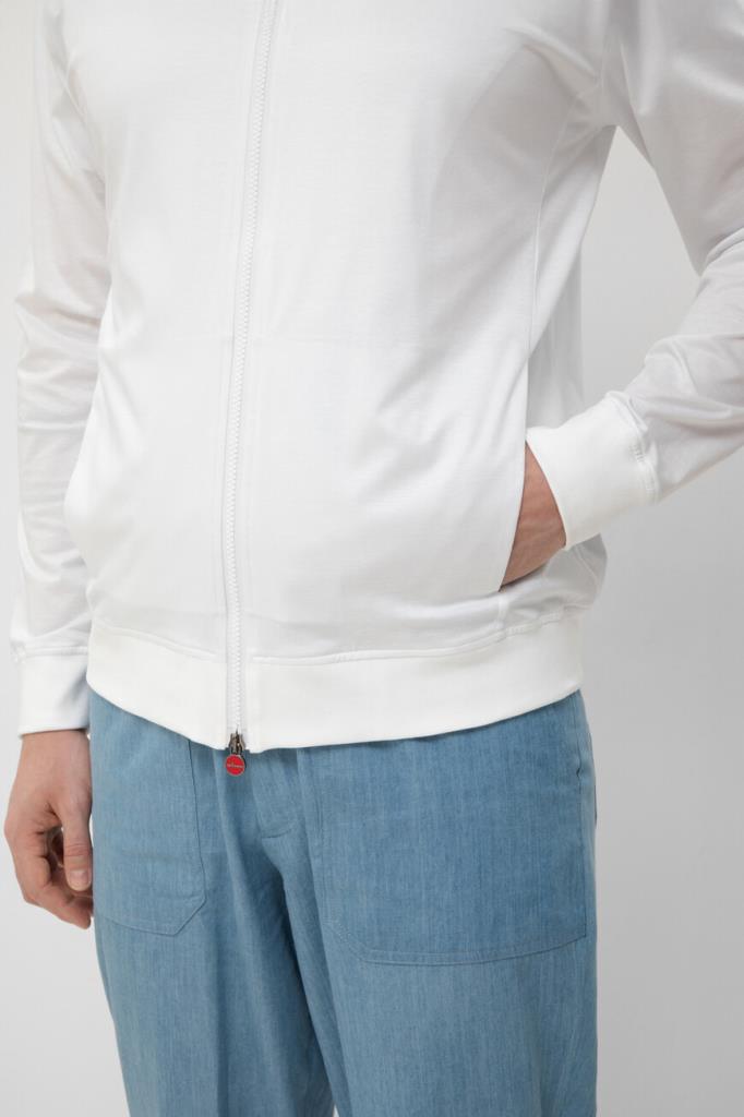 Белая толстовка Kiton с невысоким воротником-стойкой. Модель, изготовленная из мягкого хлопкового трикотажа, застёгивается на встречную молнию в тон с двумя брендированными эмалированными пуллерами. Изделие без броского декора комфортно садится по фигуре благодаря широкому эластичному поясу и манжетам-резинкам. Толстовка прямого силуэта выглядит органично в тандеме с брюками из той же коллекции.