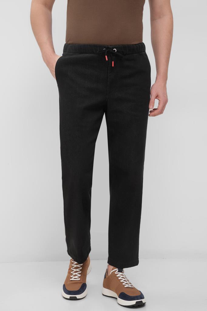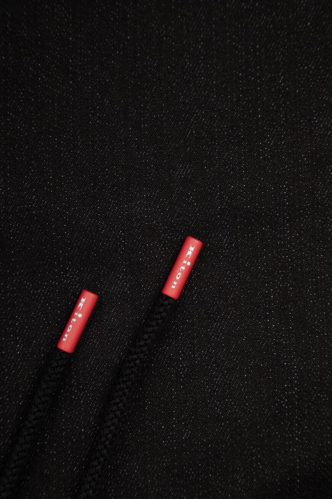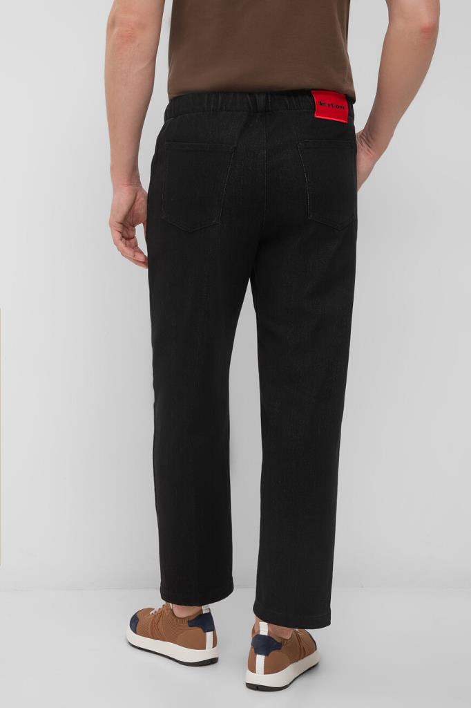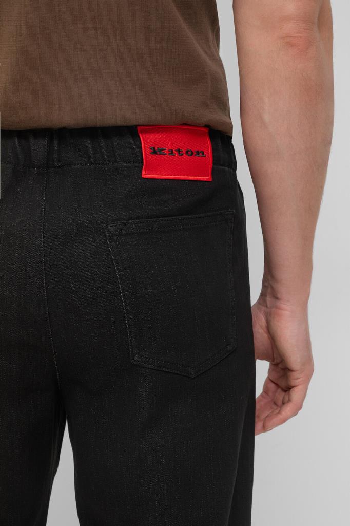 Чёрные джинсы Kiton с элементами спортивного стиля. Для создания модели прямого силуэта выбран мягкий эластичный деним на основе хлопка и полиэфира с эффектом делаве. Изделие отличается наличием двух прорезных боковых и задних накладных карманов и плотным эластичным поясом на брендированной кулиске. На принадлежность джинсов Дому также указывает ярко-красный текстильный патч с вышитым чёрным логотипом.