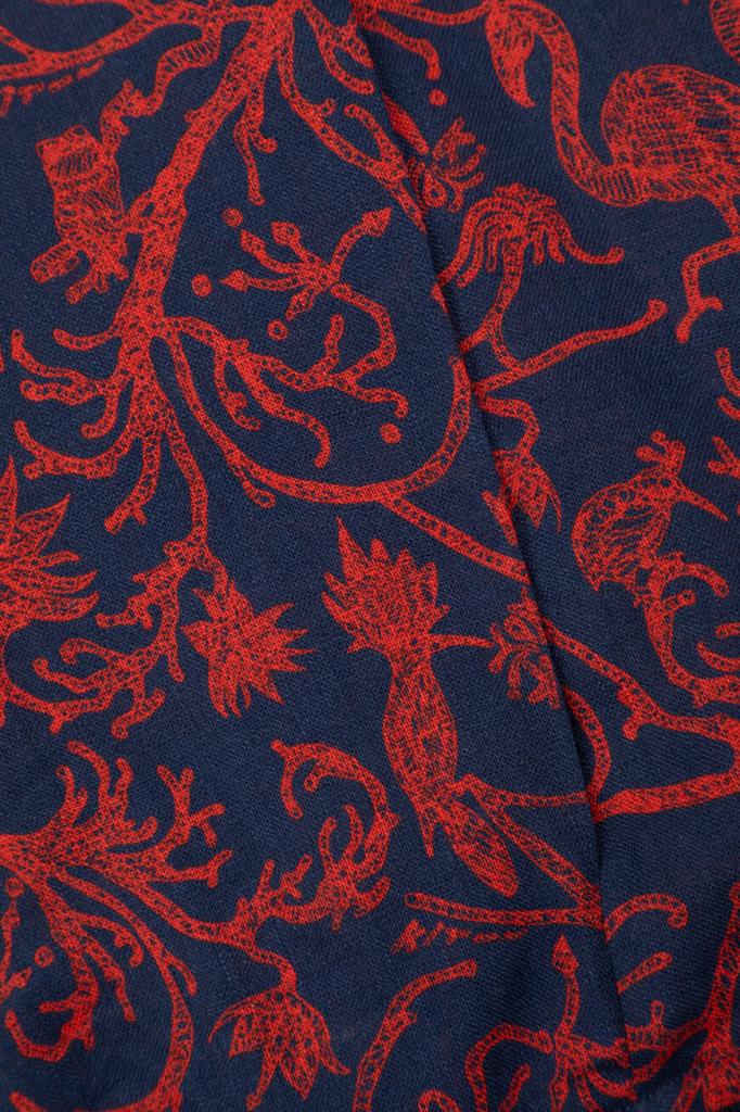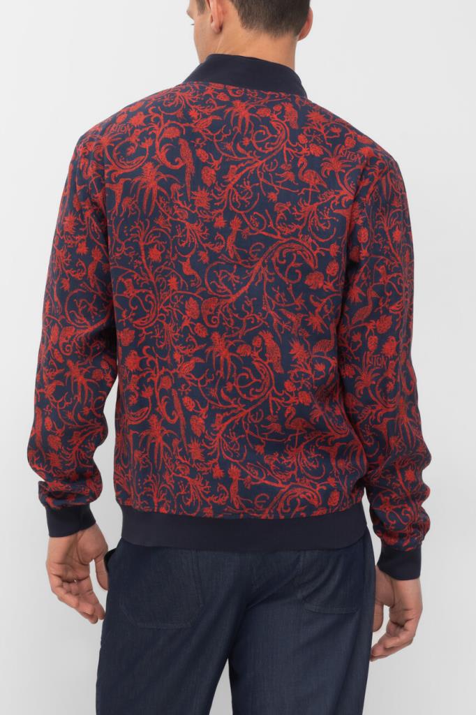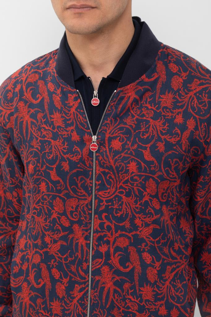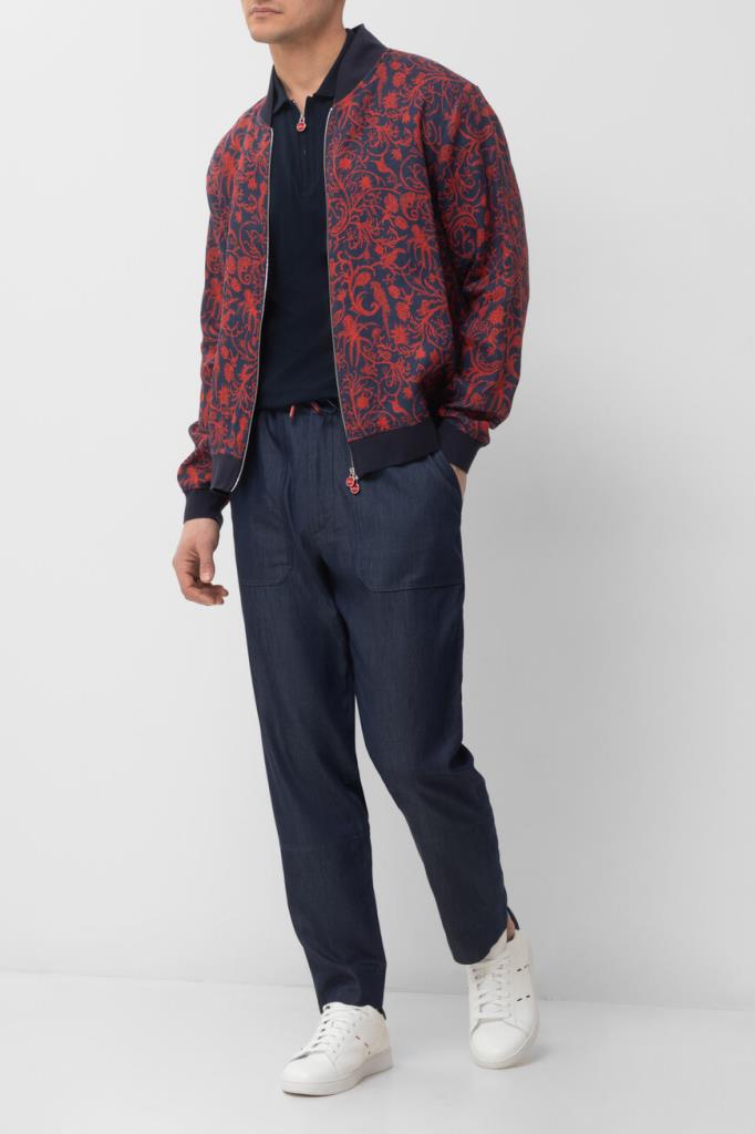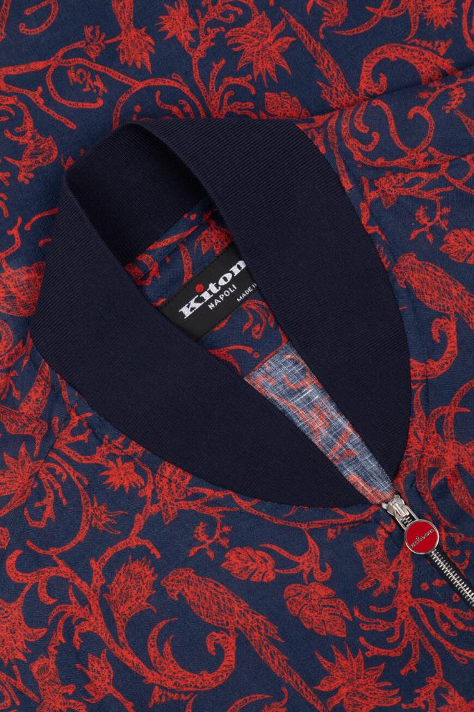 Принтованный блузон Kiton в красно-синей гамме. Фасон изделия из лёгкого мягкого льна характеризуется наличием невысокого воротника-стойки и застёжкой на встречную молнию с двумя брендированными пуллерами. Лубяные волокна обладают терморегулирующими свойствами, поэтому бомбер обеспечивает оптимальный микроклимат. Сложный процесс создания каждой куртки состоит из множества операций, большая часть которых выполняется вручную. Поверхность модели прямого силуэта покрыта растительным мотивом, дополненным изображениями экзотических птиц и животных. Однотонные трикотажные манжеты рукавов и широкий пояс оформлены резинкой для оптимальной посадки.