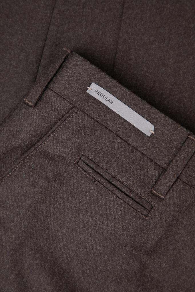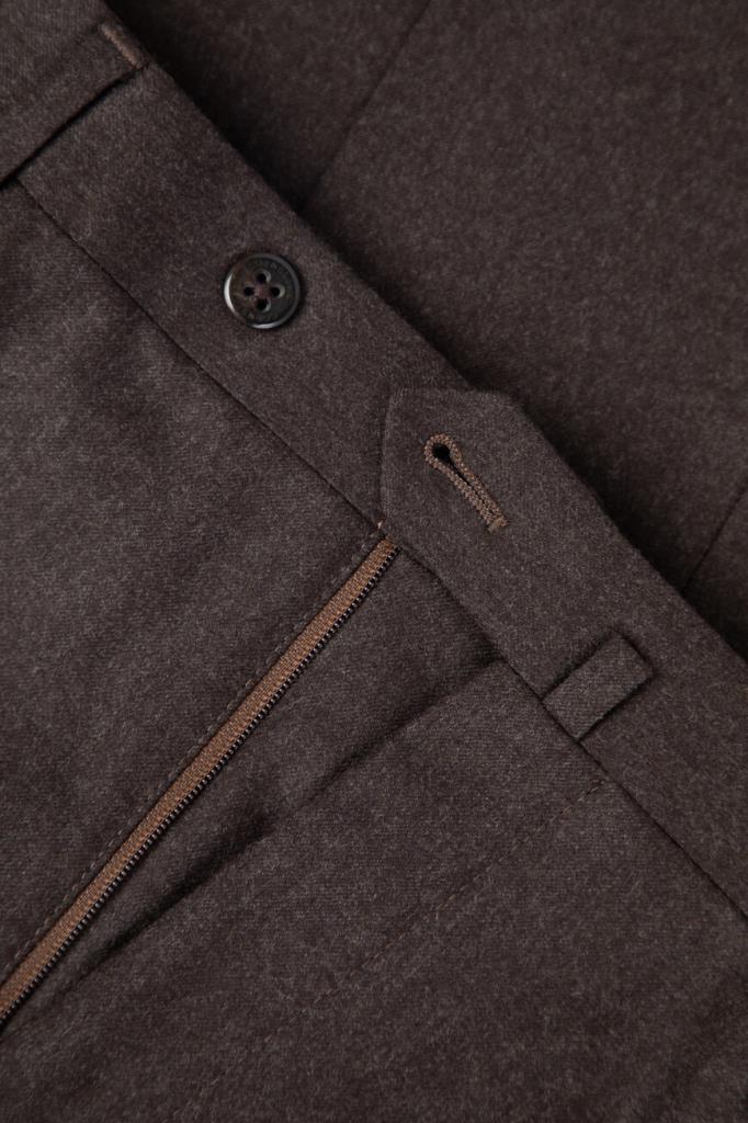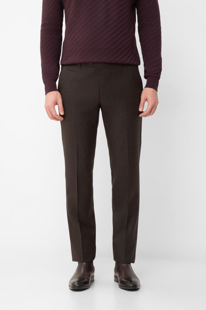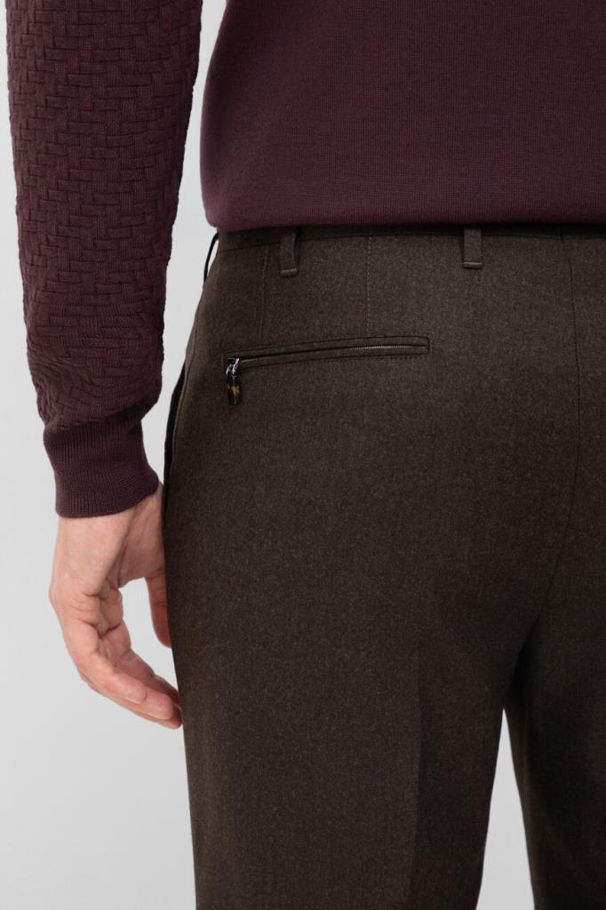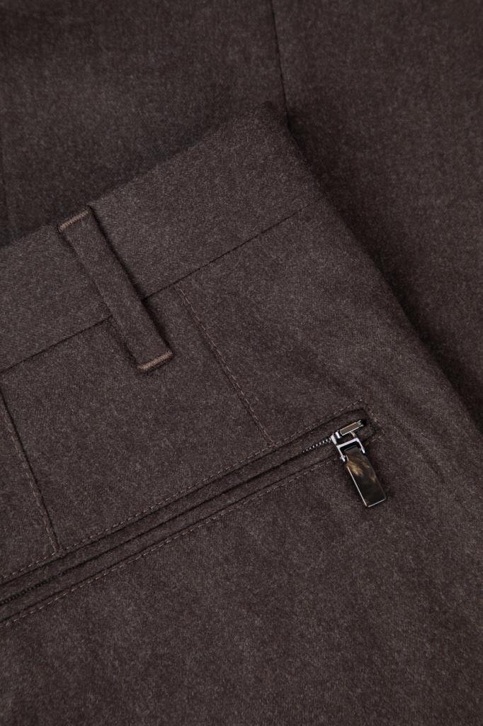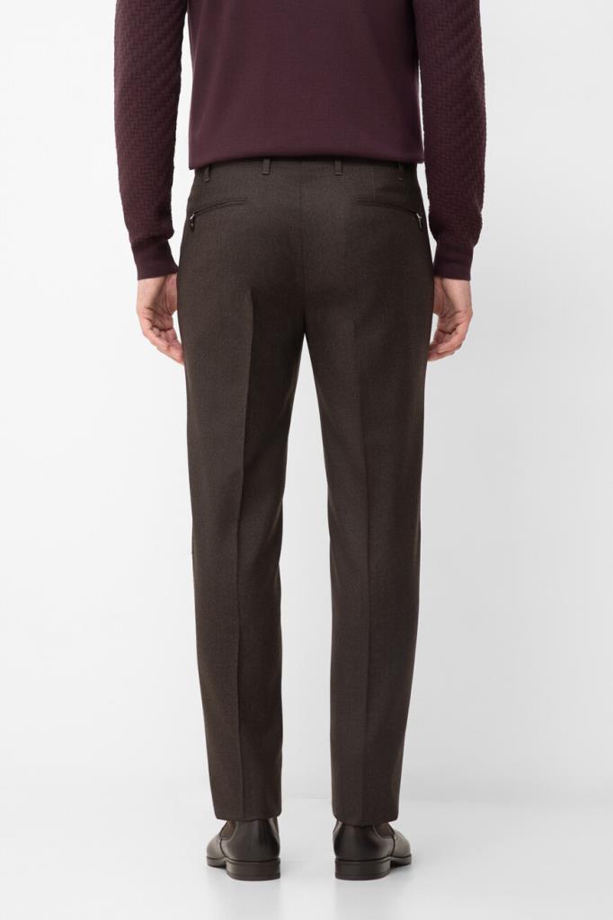 Классические брюки Corneliani на молнии и роговой пуговице с планкой. Конструкция прямой модели тёмно-коричневого оттенка предполагает наличие классических стрелок и пяти прорезных карманов: двух с диагональным входом по бокам, дополнительного небольшого кармана спереди справа и карманов на молнии сзади. Для создания органичного комплекта носите изделие с фиолетовым поло с длинными рукавами из той же коллекции.