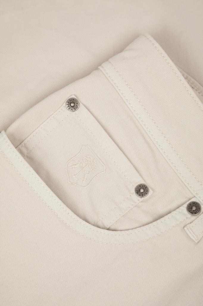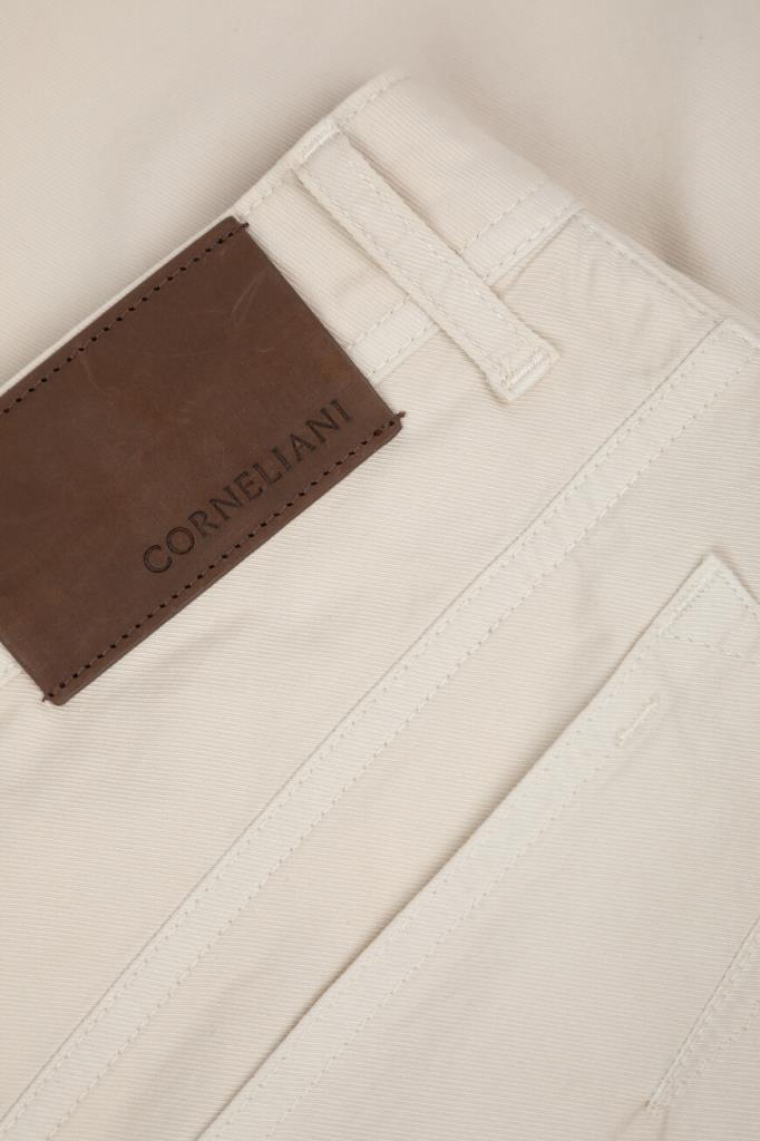 Стрейчевые джинсы Corneliani с пятью карманами. Изделие прямого силуэта выполнено из мягкого хлопкового габардина, окрашенного в готовом виде, и оснащено застёжкой на молнию, покрытую планкой, и брендированную металлическую пуговицу. Роль знакового декора отдана прямоугольной кожаной накладке с тиснёным логотипом сзади и вышитому тональному гербу Дома на маленьком кармане спереди.