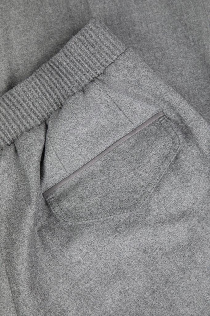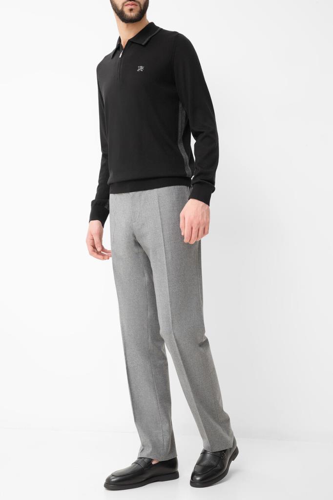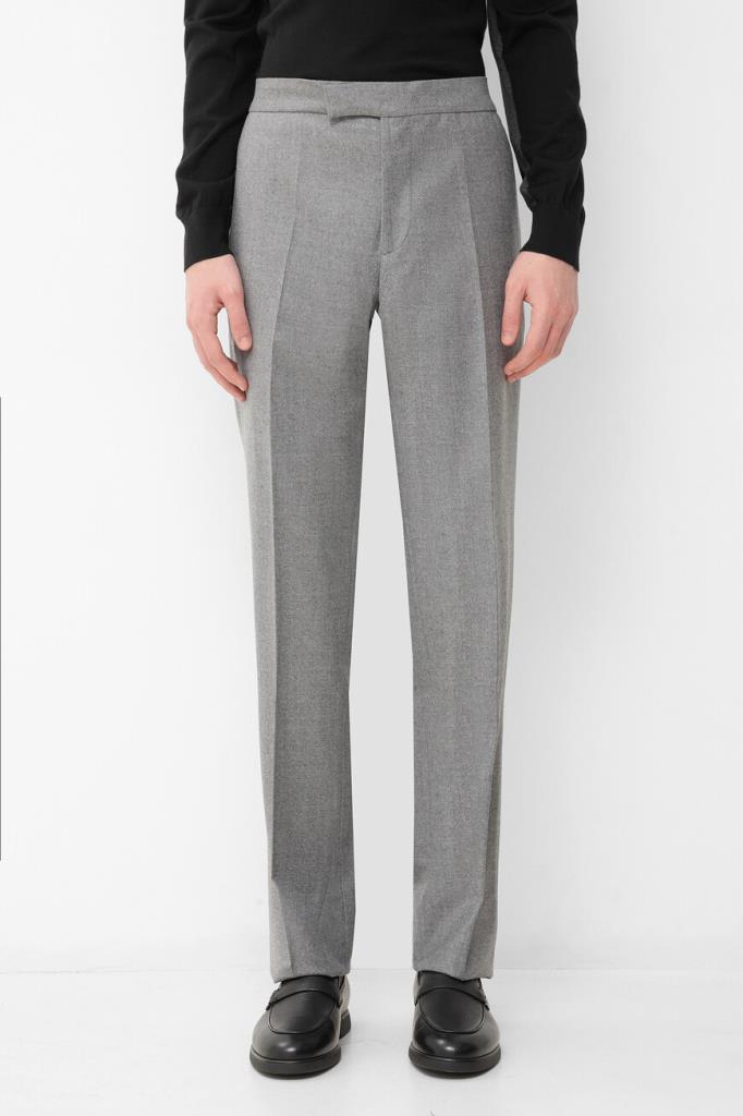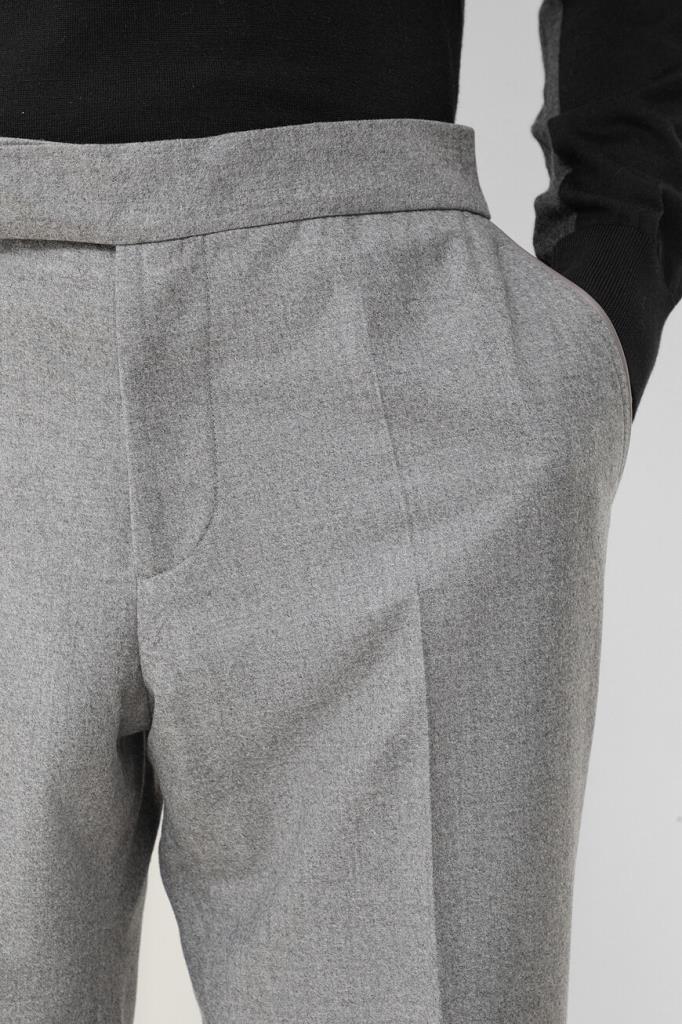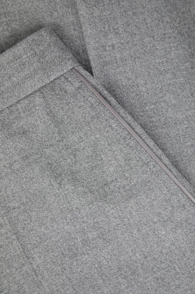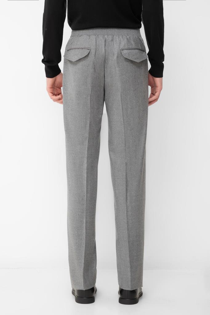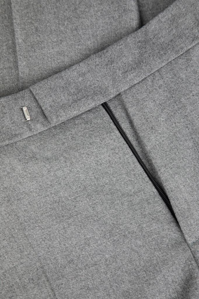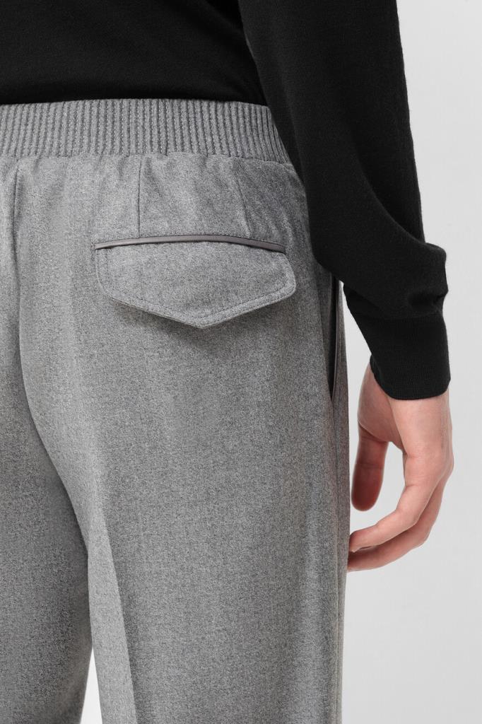 Фланелевые брюки серого цвета от Zilli. Изделие выполнено на основе мягкой вирджинской шерсти и оснащено плотным поясом с эластичной вставкой сзади и застёжкой на потайную молнию и крючок с планкой. Декором выступает кант из гладкой телячьей кожи в тон на прорезных карманах.