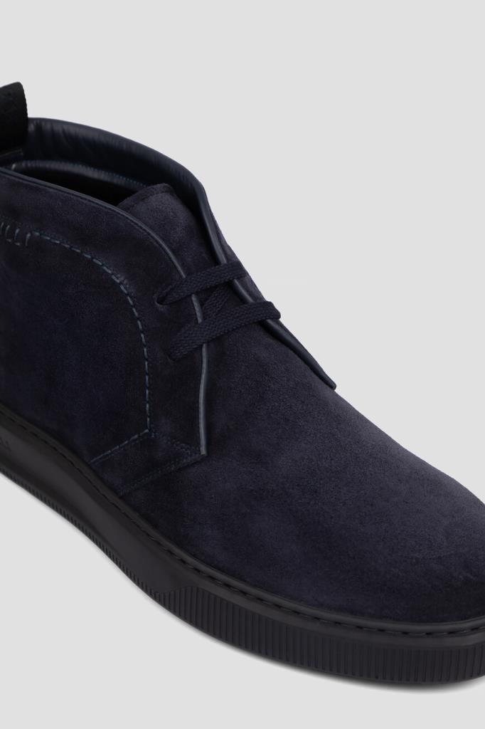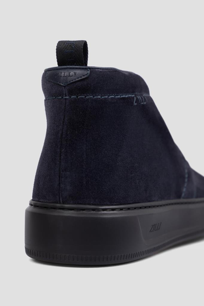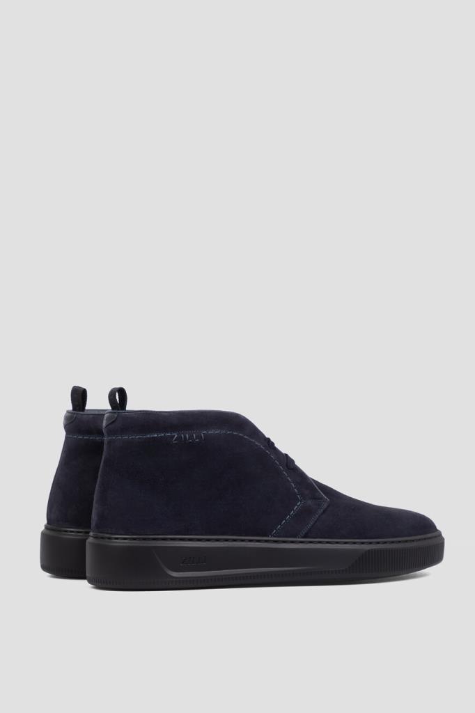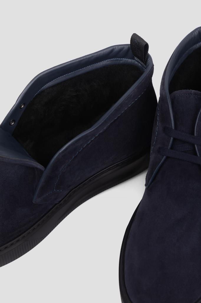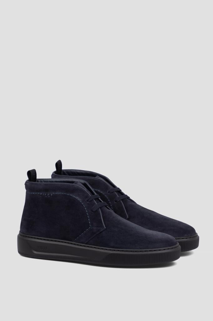 Утеплённые дерби с открытой шнуровкой от Zilli. Удобная пара изготовлена из мягкой замши тёмно-синего цвета с бархатистой поверхностью. Отличительными деталями являются кант, вставка на заднике и окантовка сверху во внутренней части модели, выполненные из гладкой телячьей кожи в тон. Атрибутами Дома стали вышитая надпись-лого на боковинах и тиснёный логотип на кожаной вставкой сзади. Обувь с внутренней отделкой из меха овчины станет неотъемлемой частью Вашего сезонного гардероба.