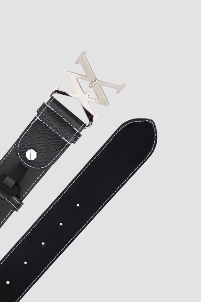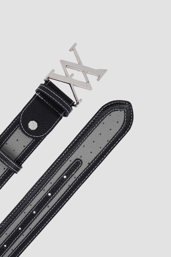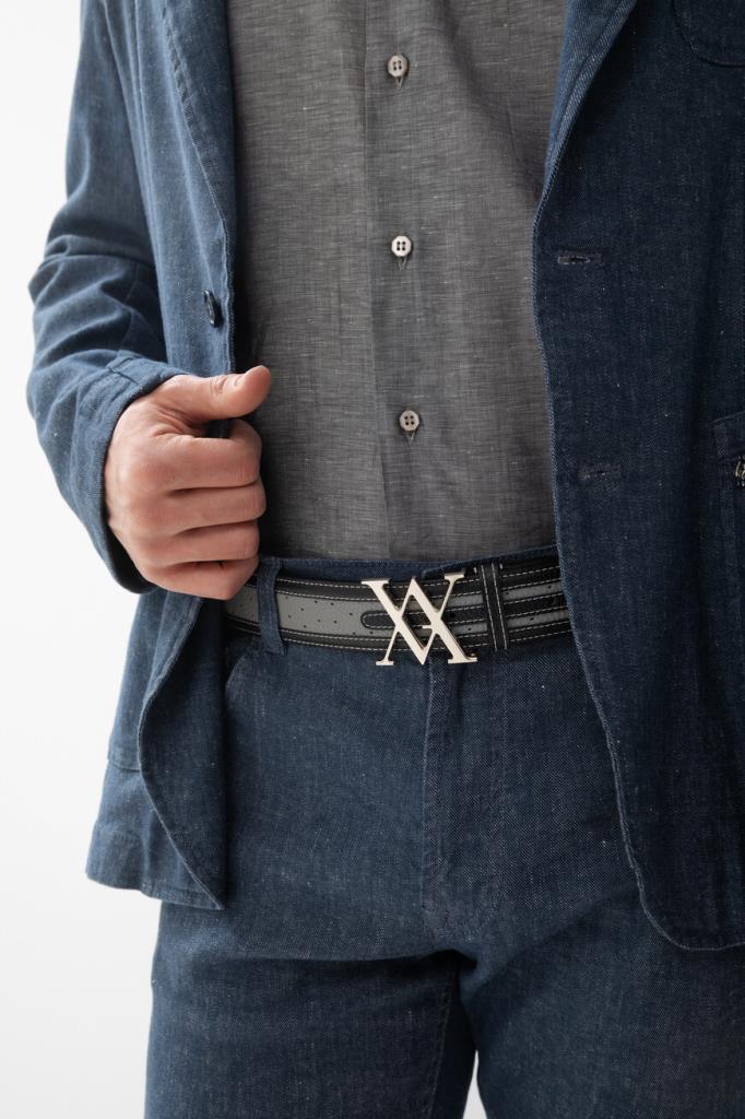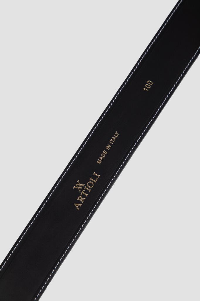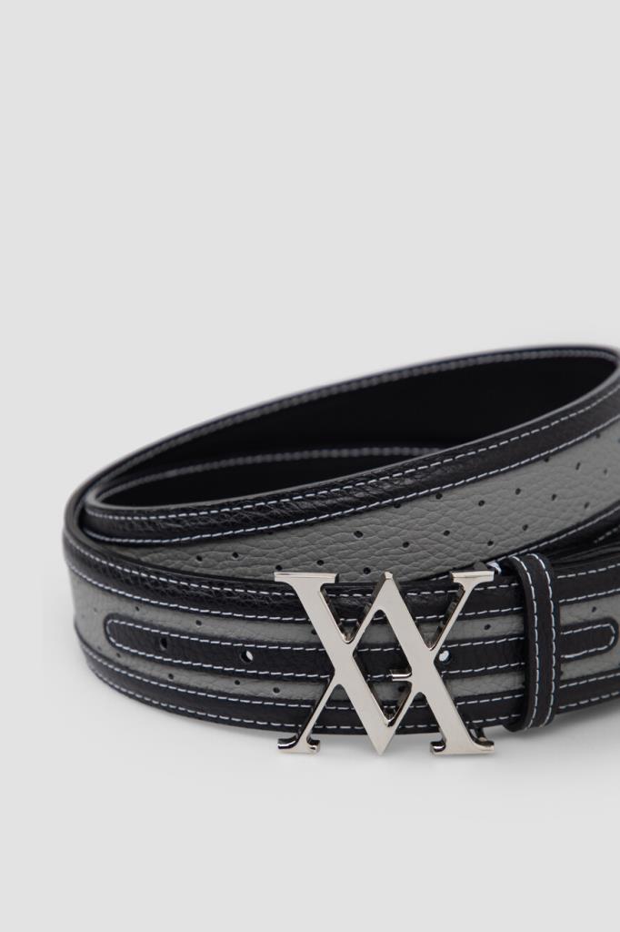 Ремень Artioli с крупной дизайнерской пряжкой из серебристого металла. Модель изготовлена из комбинации перфорированной кожи телёнка серого цвета со вставками из кожи чёрного цвета с зернистой текстурой и белой прострочкой-швом по краям, на узкой полосе с прорезями, подвижных тренчиках и обратной стороне аксессуара. Пряжка выполнена в виде лого-монограммы Дома со штифтом.