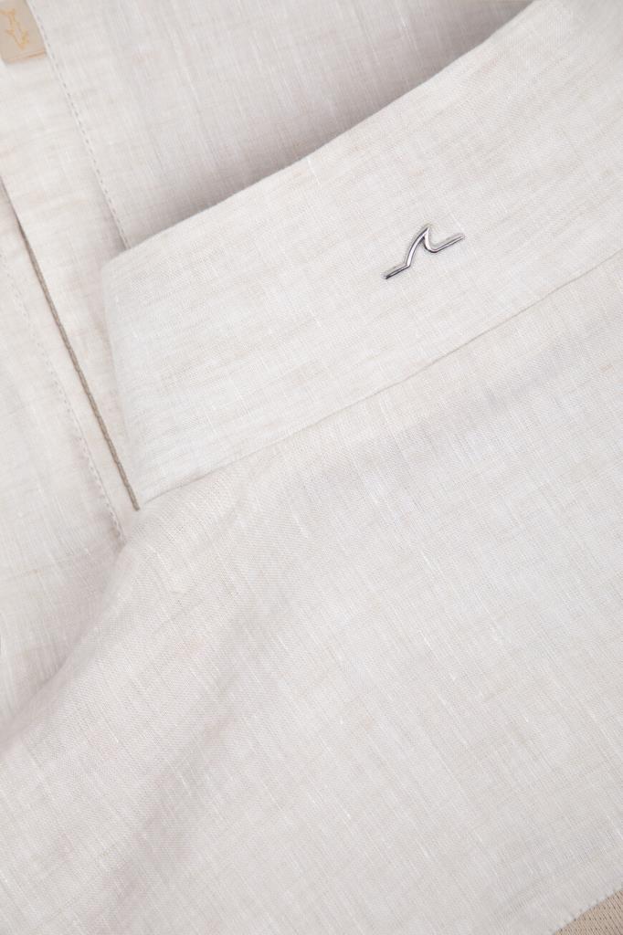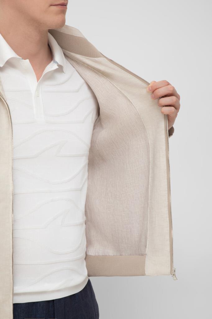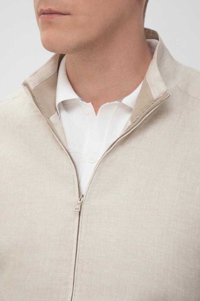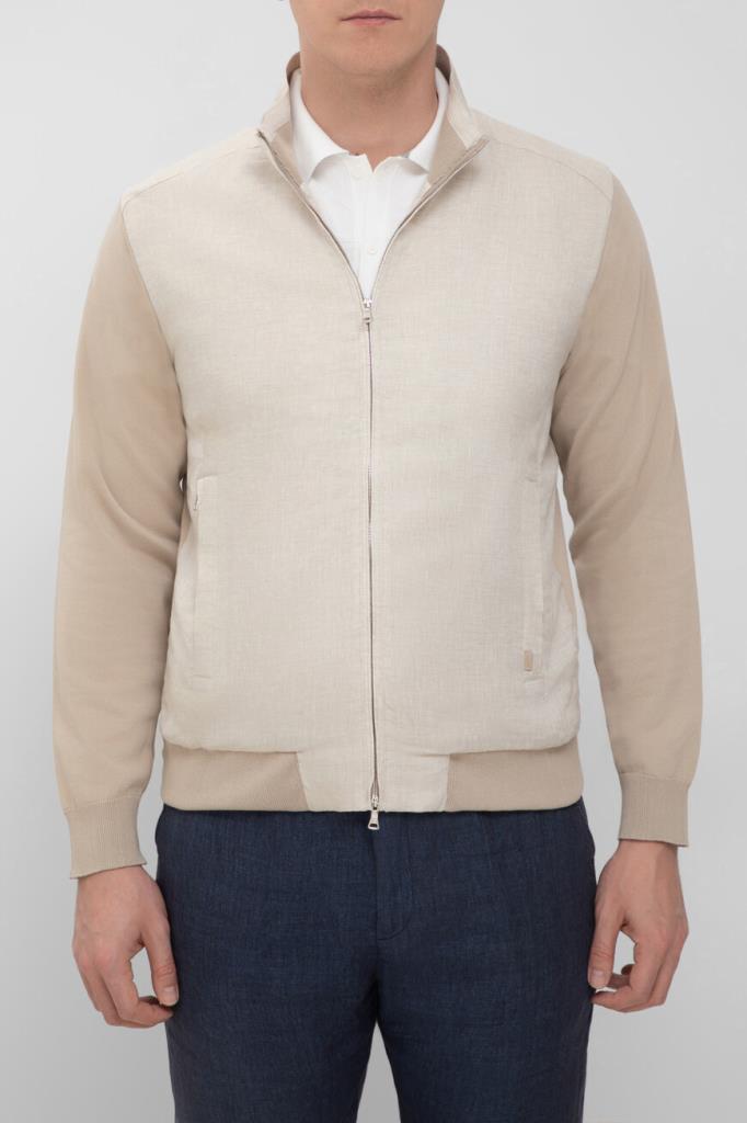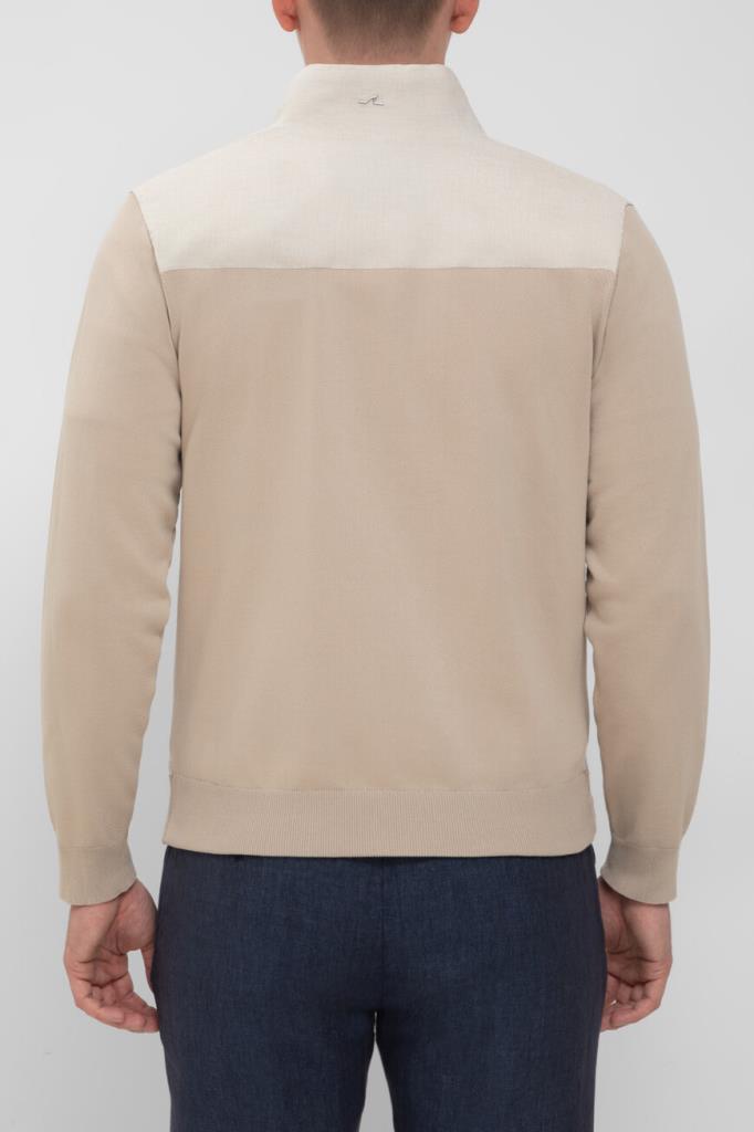 Комбинированный кардиган Paul&Shark выполнен в бежевых тонах. Изделие из прочного тонкого хлопка Fresco дополнено вставками из льна спереди и на кокетке. Фасон современной модели предполагает прямой силуэт и застёжку на встречную молнию с двумя брендированными пуллерами. За надёжную защиту от порывов ветра отвечает высокий воротник-стойка. Атрибутами Дома являются минималистичная вставка с изображением акулы на левом прорезном кармане и серебристая металлическая деталь в виде острого плавника акулы сзади на воротнике.