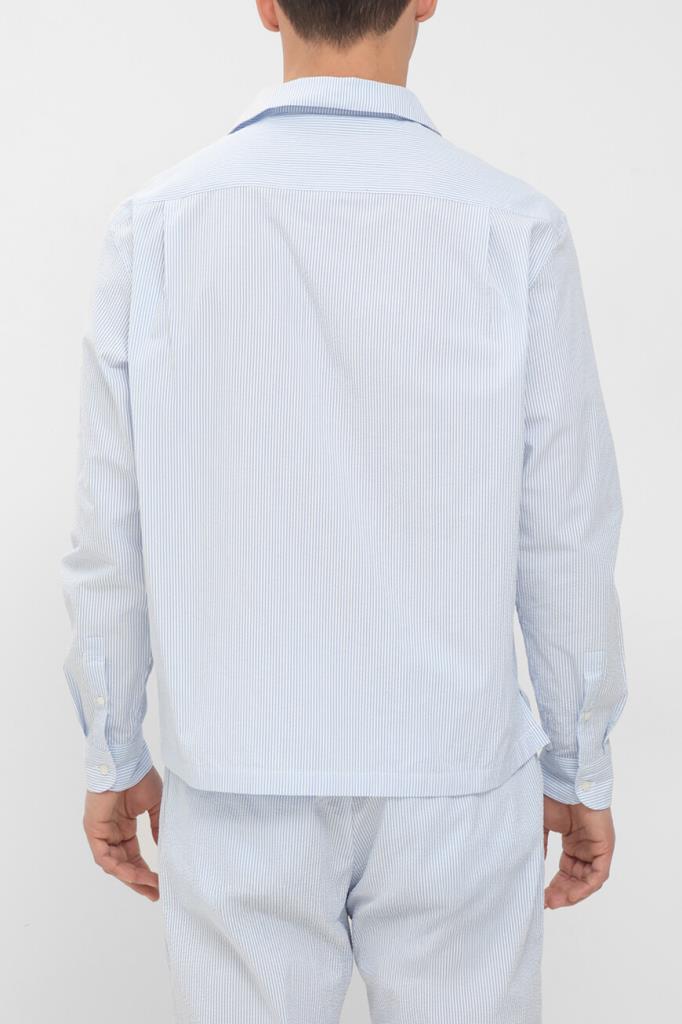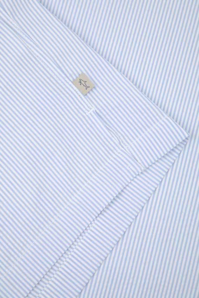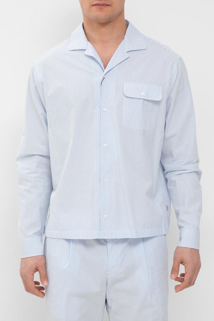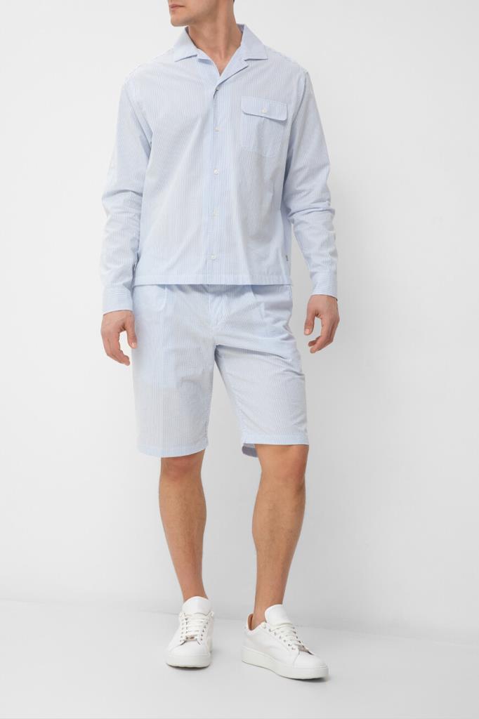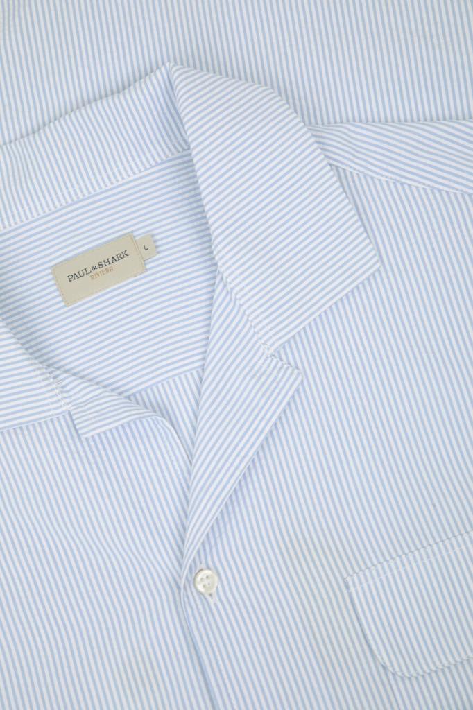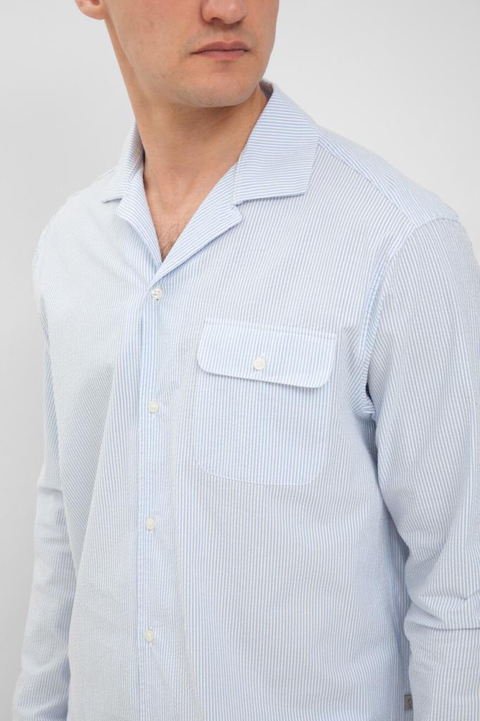 Рубашка Paul&Shark входит в коллекцию одежды Riviera для тёплых летних дней. Дышащая модель изготовлена из мягкого хлопкового трикотажа белого и голубого оттенков и декорирована геометрическим мотивом в виде тонких вертикальных полос. Изделие отличается гавайским воротником и наличием нагрудного накладного кармана с клапаном на перламутровой пуговице. Рубашка будет выглядеть органично в тандеме с бермудами со стрелками и защипами сверху из той же коллекции.