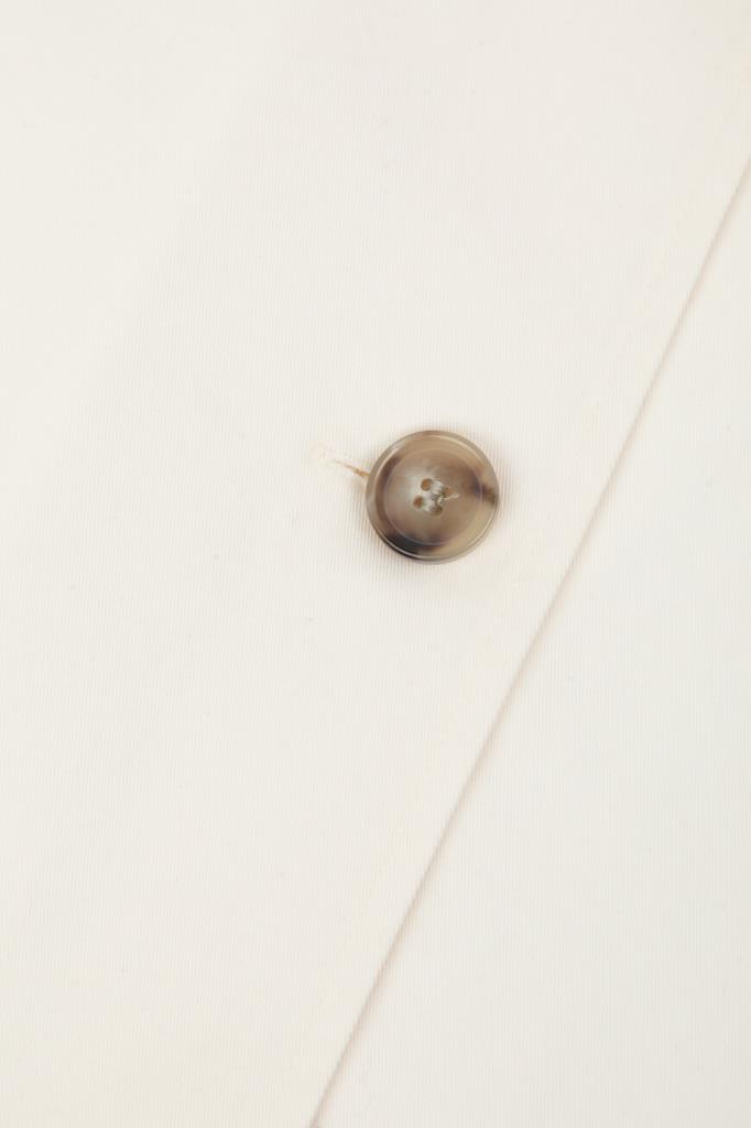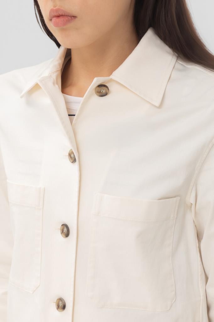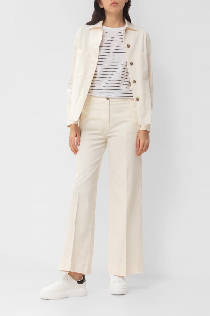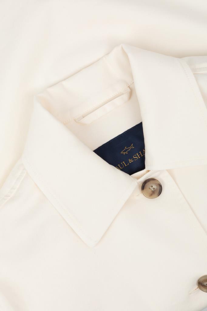 Белый жакет Paul&Shark с отложным воротником. Для создания модели прямого силуэта используется эластичный хлопковый твил. Фасон изделия характеризуется наличием четырёх карманов и застёжкой на крупные роговые пуговицы. О принадлежности жакета Дому деликатно напоминает серебристый прямоугольный лейбл с гравировкой спереди. Образ можно дополнить полосатой футболкой и парными брюками-клёш из той же коллекции.
