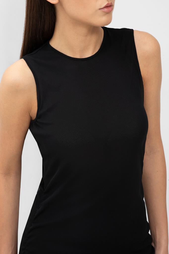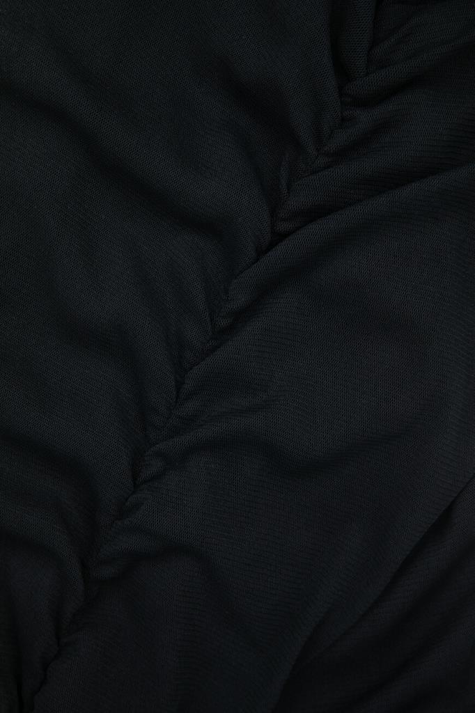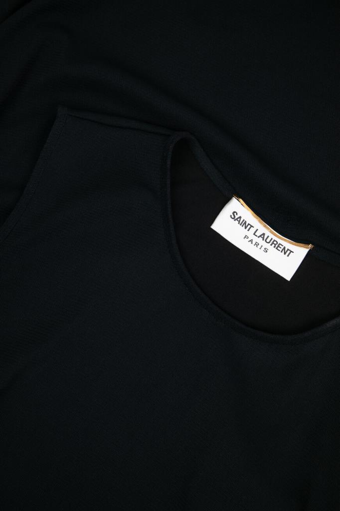 Короткое полупрозрачное платье чёрного цвета от бренда Saint Laurent. Модель изготовлена из гладкого тюля без рукавов и интересна сборками по бокам в нижней части. Чтобы снизить градус провокации, изделие дополнено слоем из прочного вискозного волокна в тон. Образ можно дополнить аксессуарами Дома: кожаной сумкой Le 5 à 7 Hobo и босоножками TRIBUTE на высоком каблуке-шпильке.