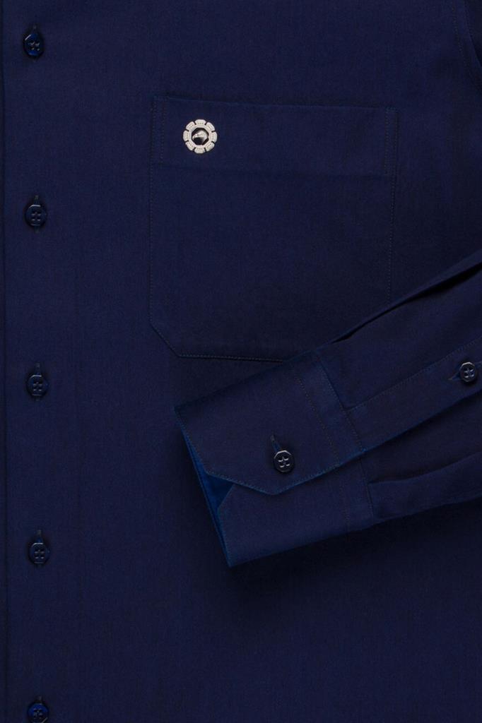 Хлопковая рубашка Stefano Ricci с нагрудным накладным карманом слева. Повседневная модель изготовлена вручную из тёмно-синей ткани, напоминающей деним, с эффектом делаве. Фасон изделия прямого силуэта характеризуется наличием отложного воротника Melk и длинных рукавов со скошенными французскими манжетами на восьмиугольных пуговицах. Декором выступает вставка из серебристого металла с культовой головой орла в центре.