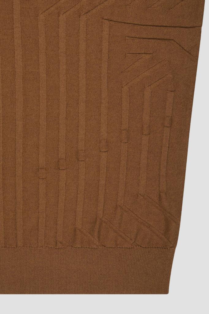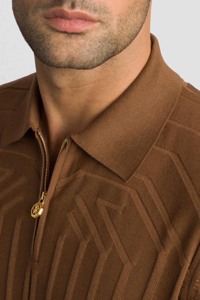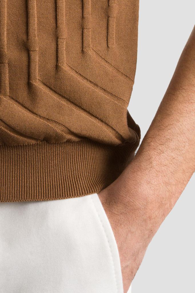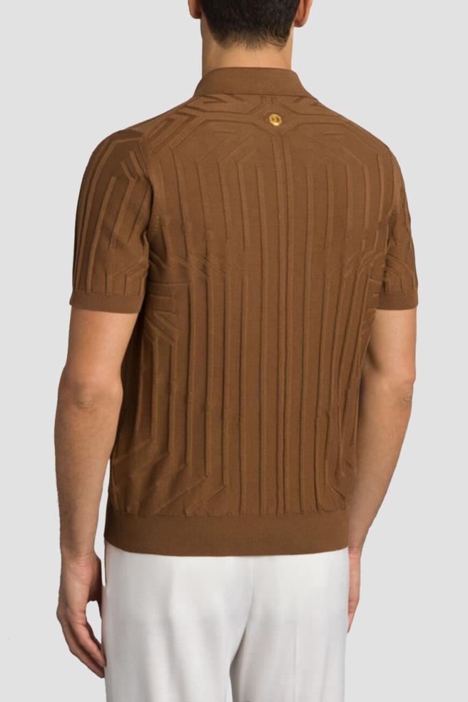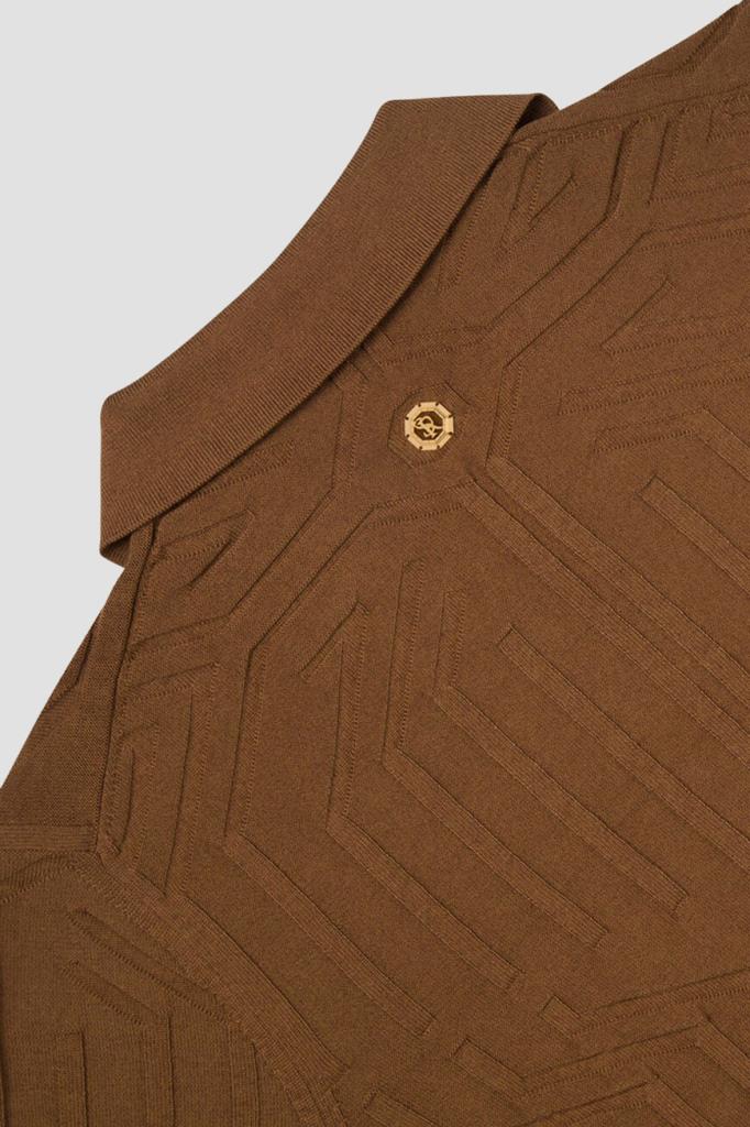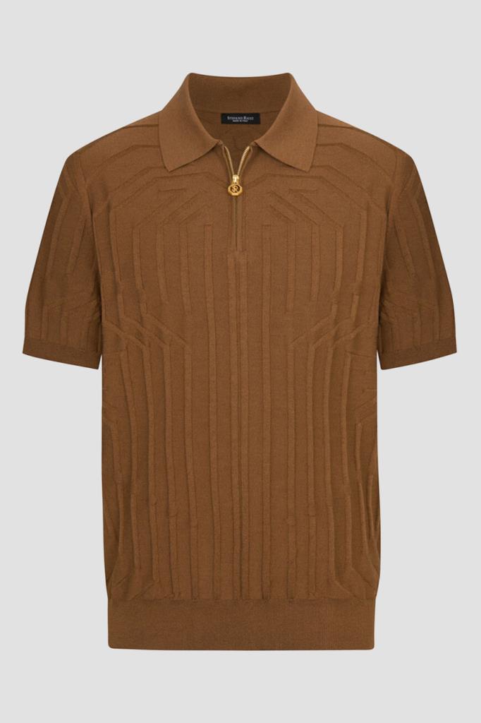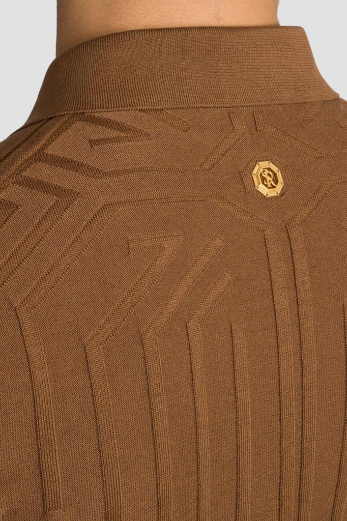 Коричневое поло Stefano Ricci с короткими рукавами. Изделие выполнено из мягкого трикотажа на основе хлопка и гладкого шёлка. Поверхность современной модели декорирована рельефным графическим узором, отсылающим к знаковому октагону, в тон. Комфорт и оптимальную посадку поло по фигуре обеспечивают широкий эластичный пояс и манжеты-резинки.