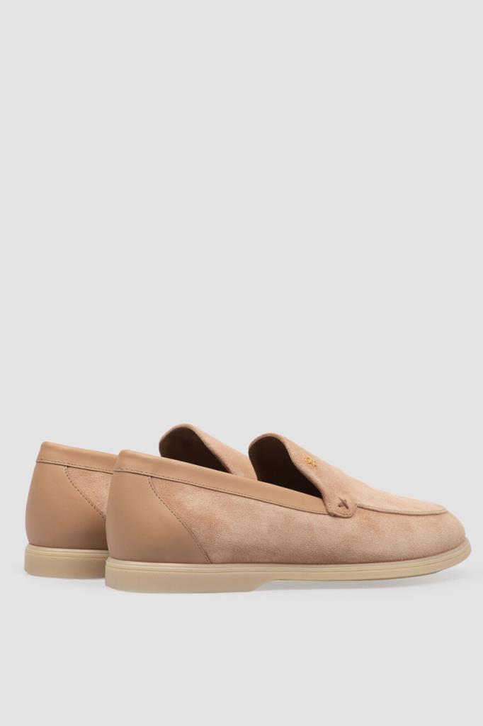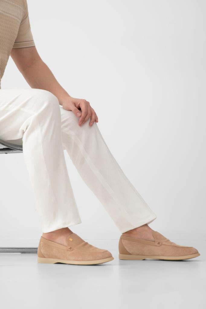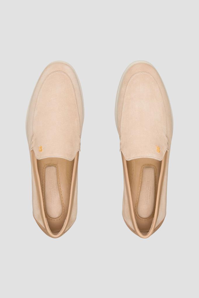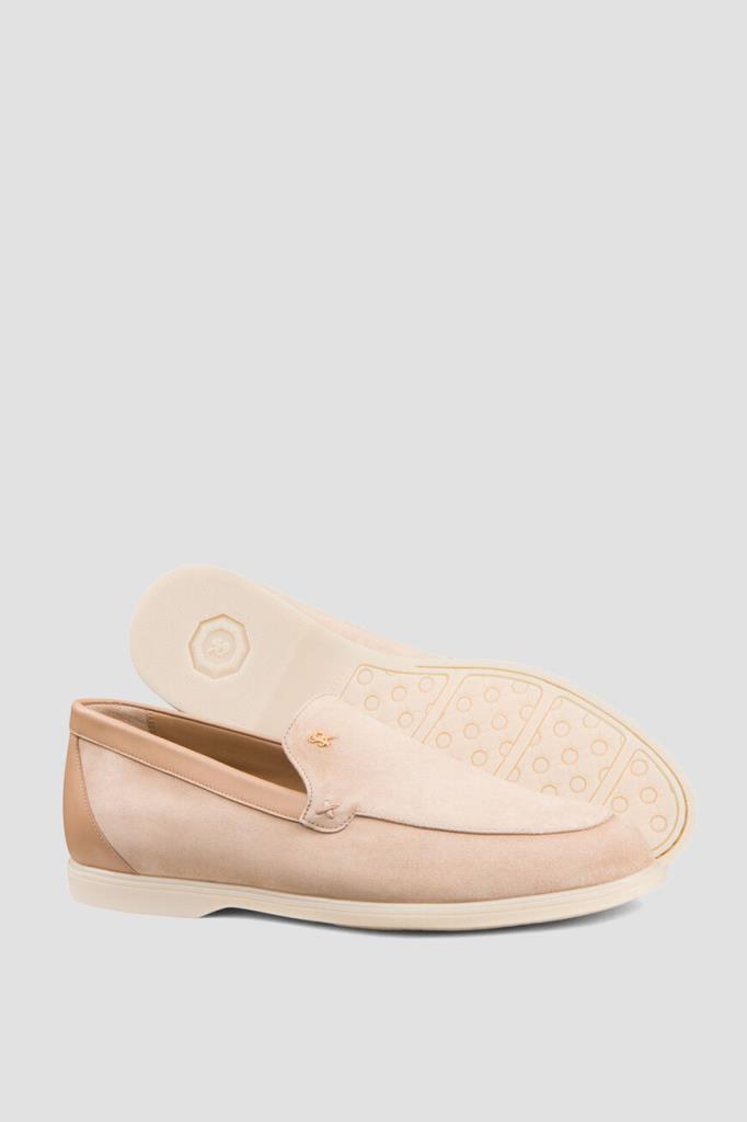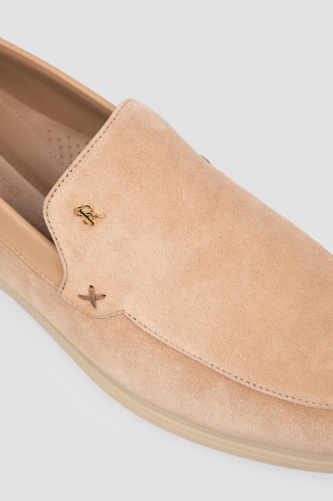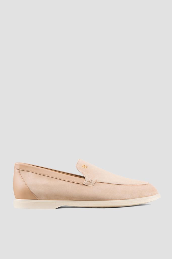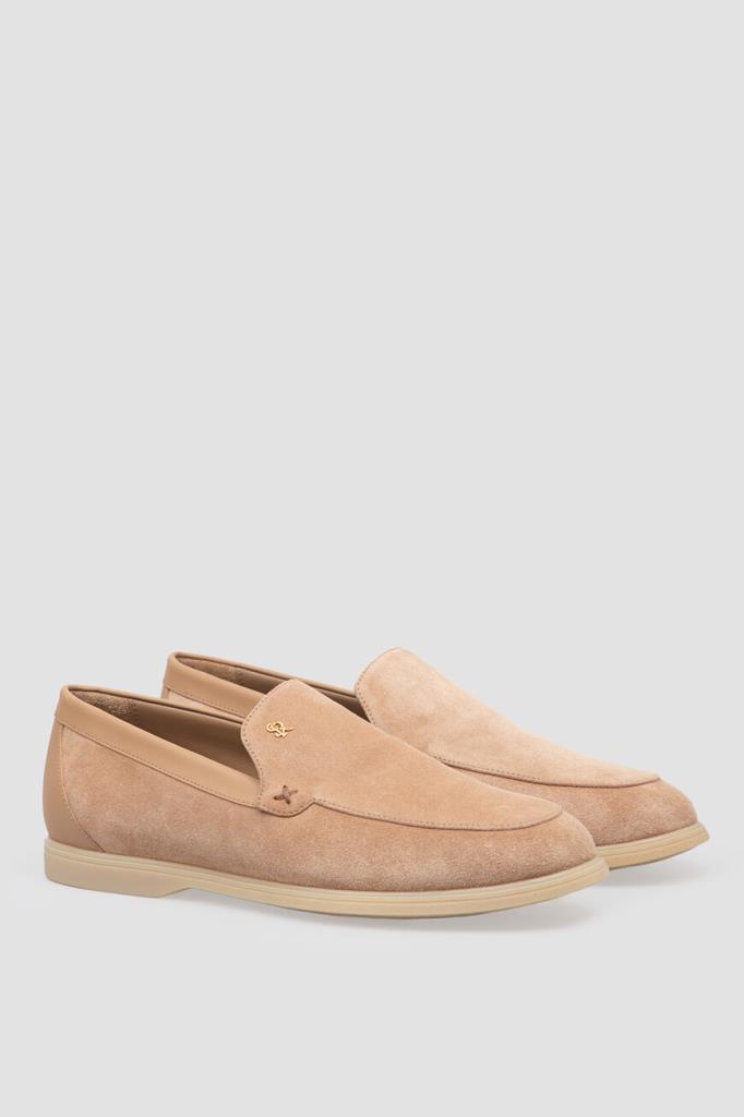Бежевые лоферы Stefano Ricci с минималистичной знаковой символикой. Модель изготовлена из микса бархатистой замши тонкой выделки и вставок из гладкой телячьей кожи сверху (кант) и на заднике в тон. Пластичный материал в точности повторяет контуры стопы, поэтому изделие на гибкой резиновой подошве сидит как влитое. Спереди слева размещён перекрёстный лого-монограмма из металла золотого оттенка. Рельефный декоративный шов на союзке и Х-образные стежки подчёркивают безупречность ручной работы. Пара станет органичным завершением повседневного ансамбля.