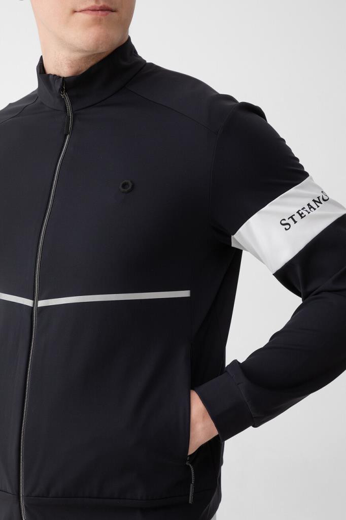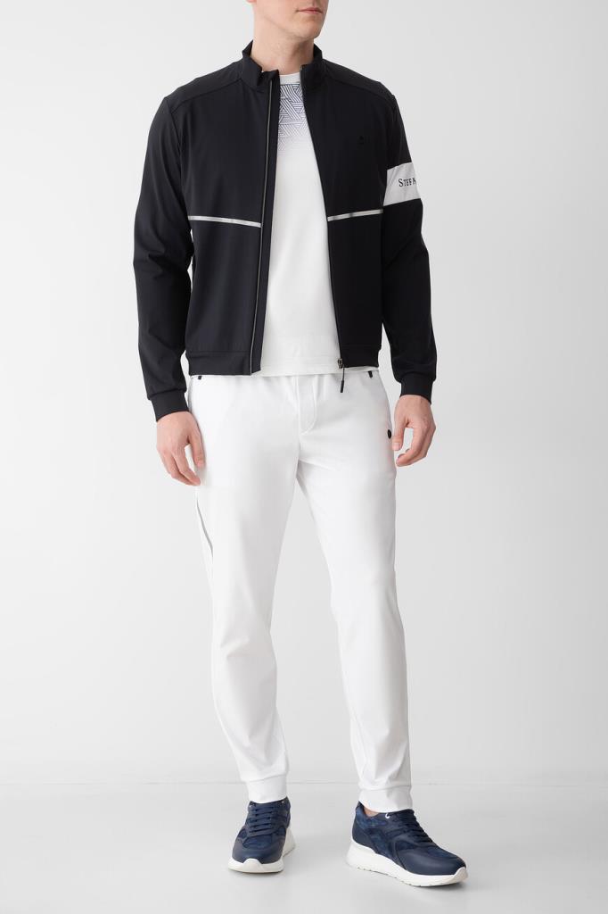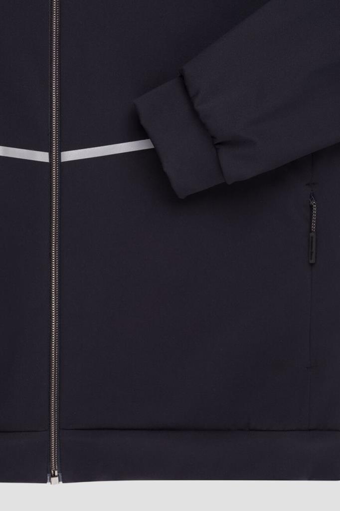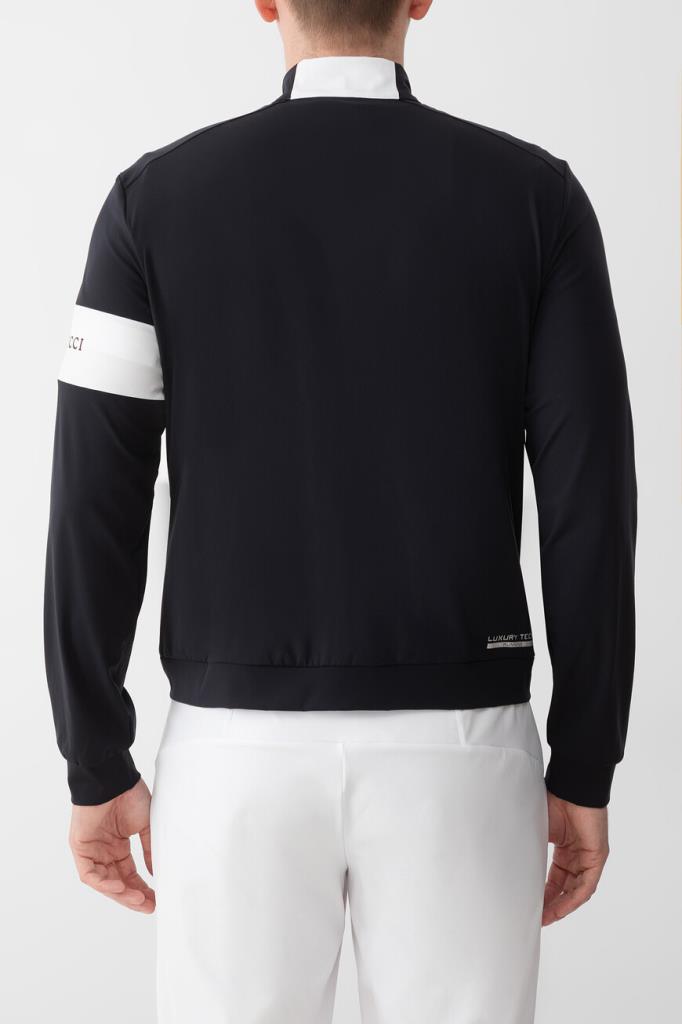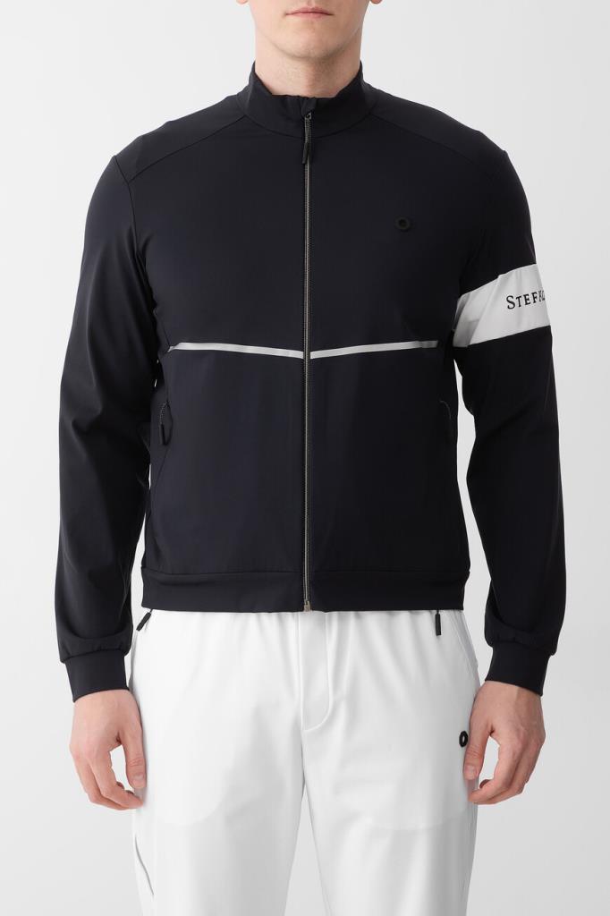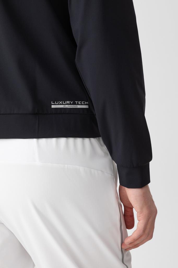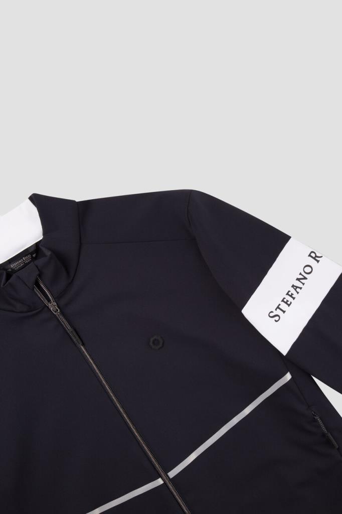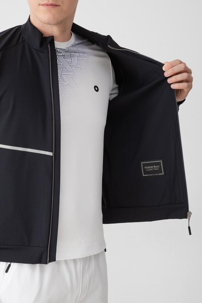 Прямой блузон Stefano Ricci из прочного эластичного нейлона. Синтетический материал тёмно-синего цвета обеспечивает адаптивную регулировку температуры и ветроустойчивость, создавая защитный слой, который реагирует на изменяющиеся условия окружающей среды. Фасон изделия из коллекции SR LUXURY TECH, предназначенного для занятий бегом, характеризуется наличием невысокого воротника-стойки с белой вставкой во внутренней части и застёжки-молнии с удлинённым пуллером. Декором выступает вставка с принтом в виде надписи-логотипа Дома на левом рукаве. Модель можно носить в тандеме со спортивными брюками из той же линейки.