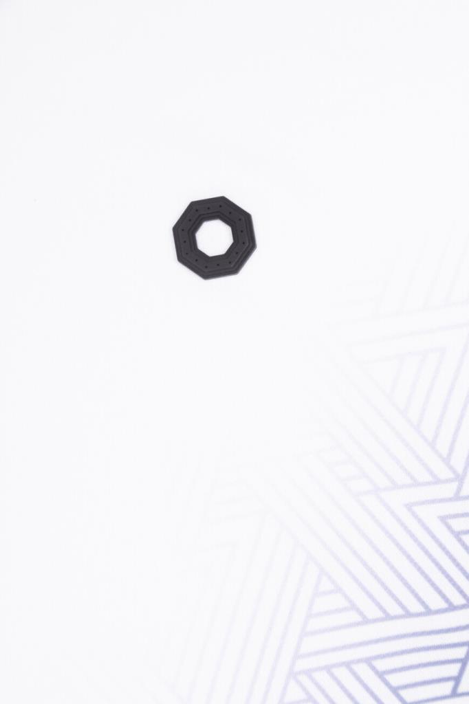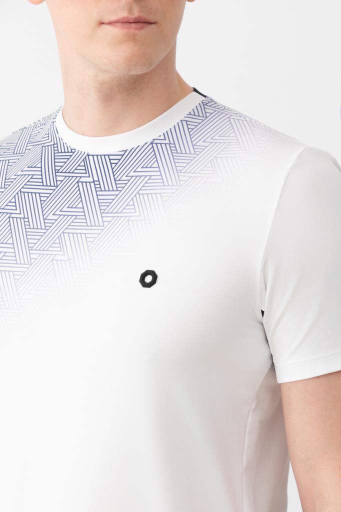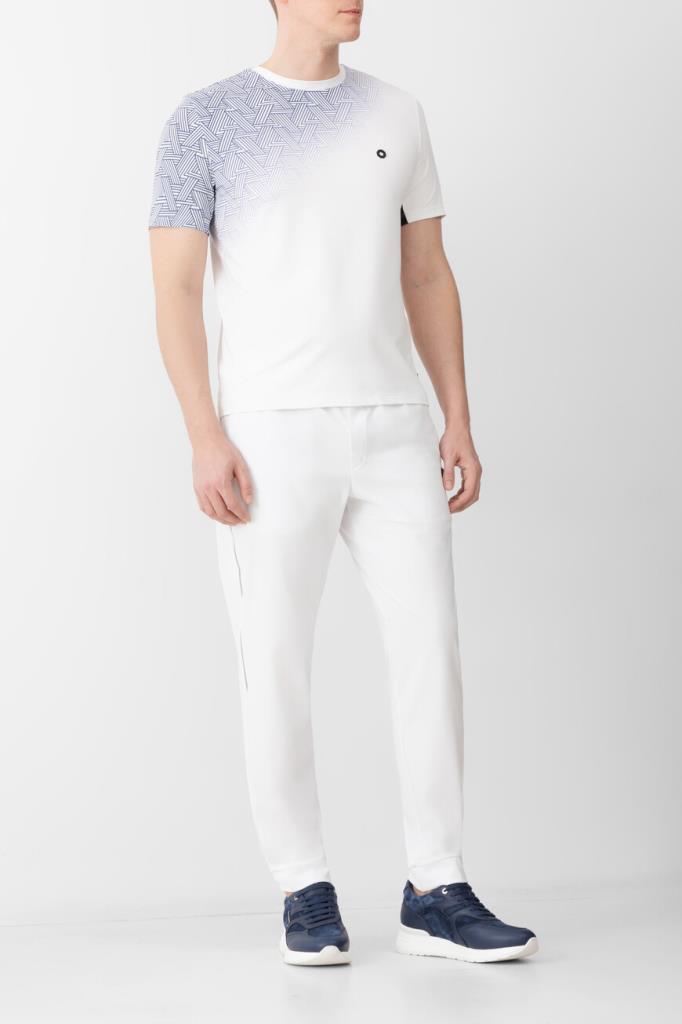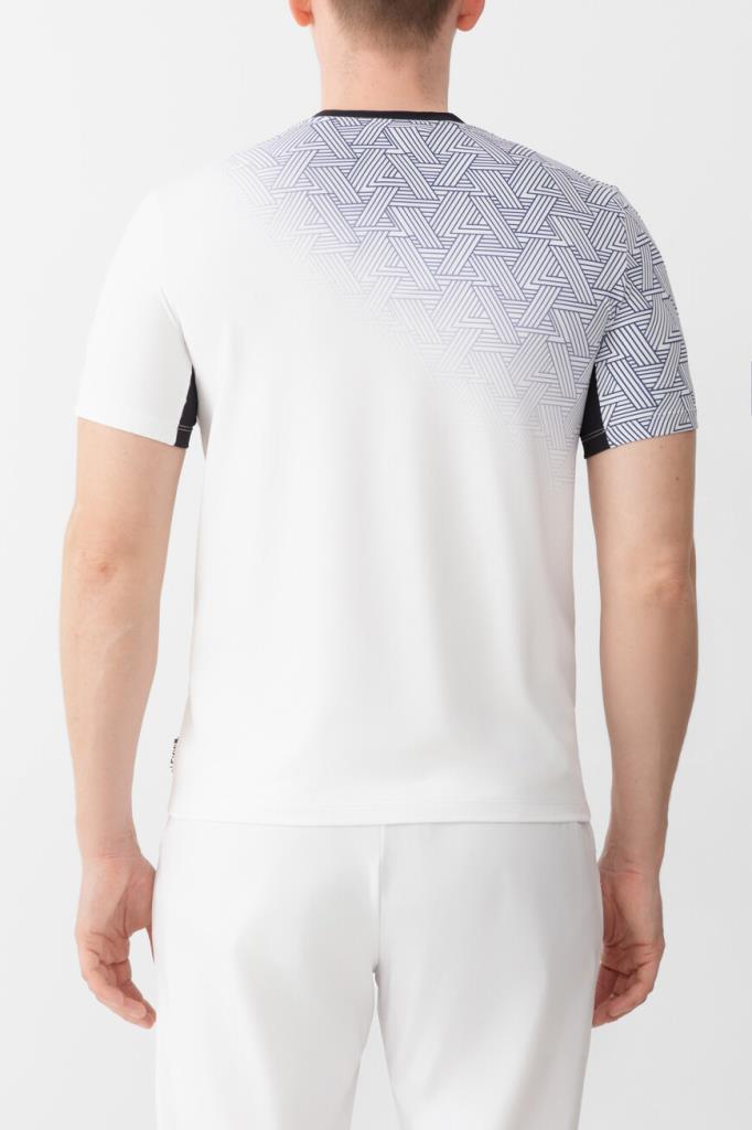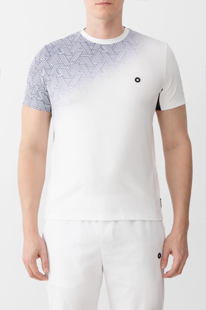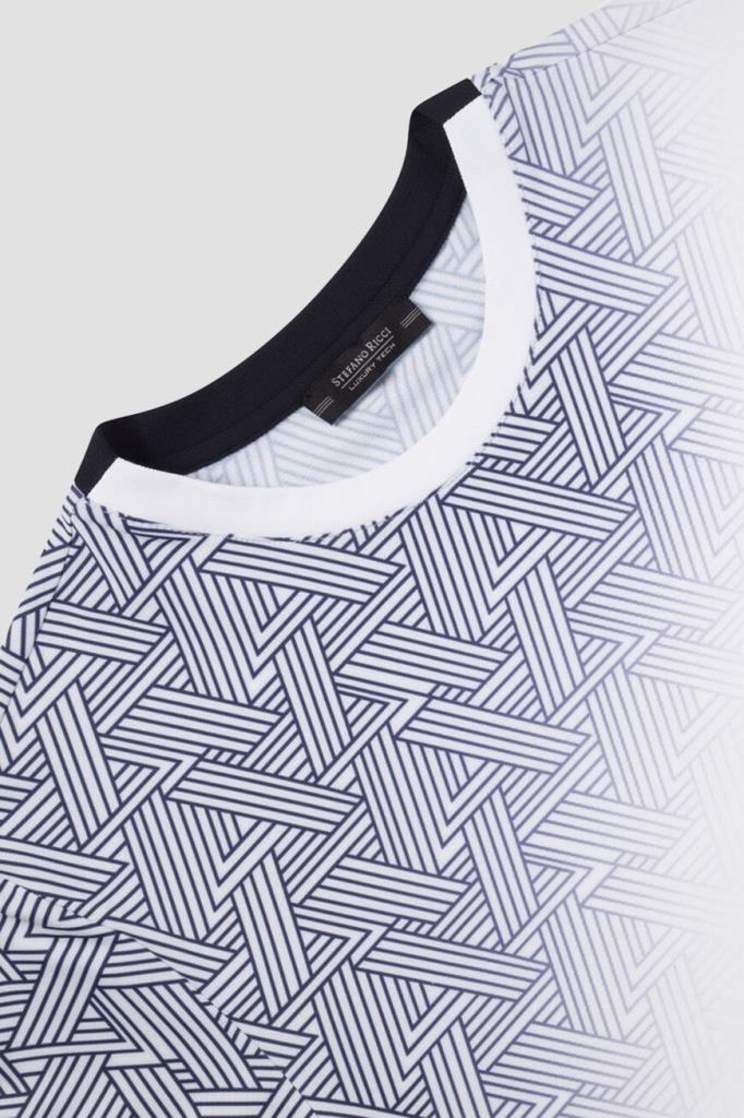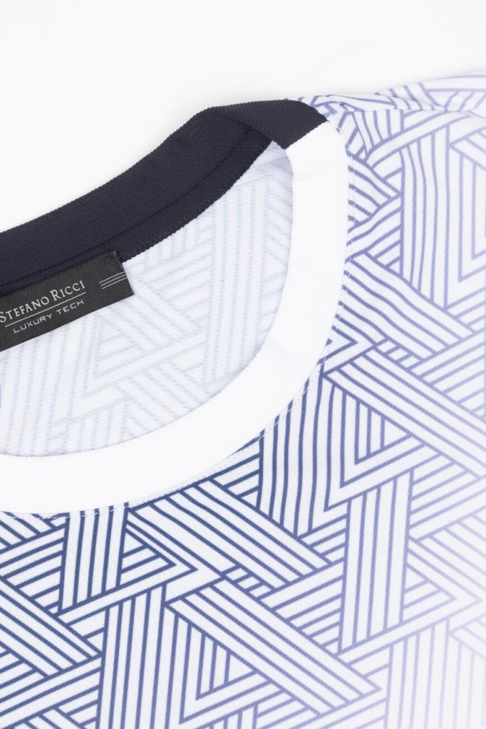 Теннисная футболка Stefano Ricci воплощает спортивную эстетику. Для изготовления модели прямого силуэта используется прочный эластичный нейлон. Изделие белого цвета украшают динамичный геометрический принт в виде тёмно-синих треугольников с эффектом выцветания и контрастная вставка-восьмигранник слева на груди. Футболка из коллекции SR LUXURY TECH идеально подходит для путешествий, занятий спортом и отдыха.