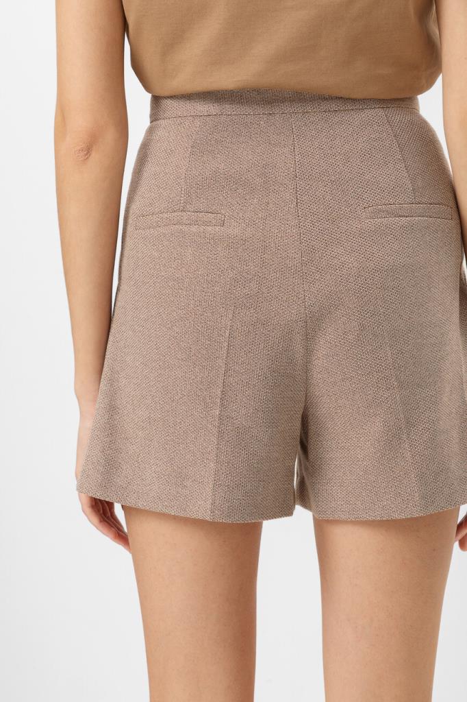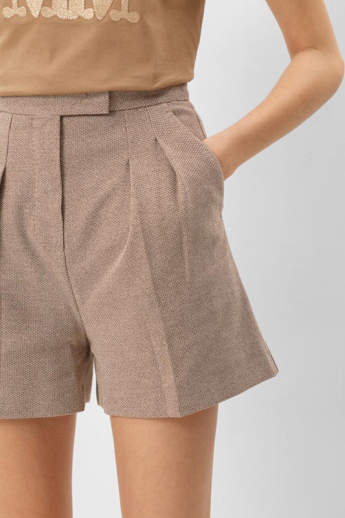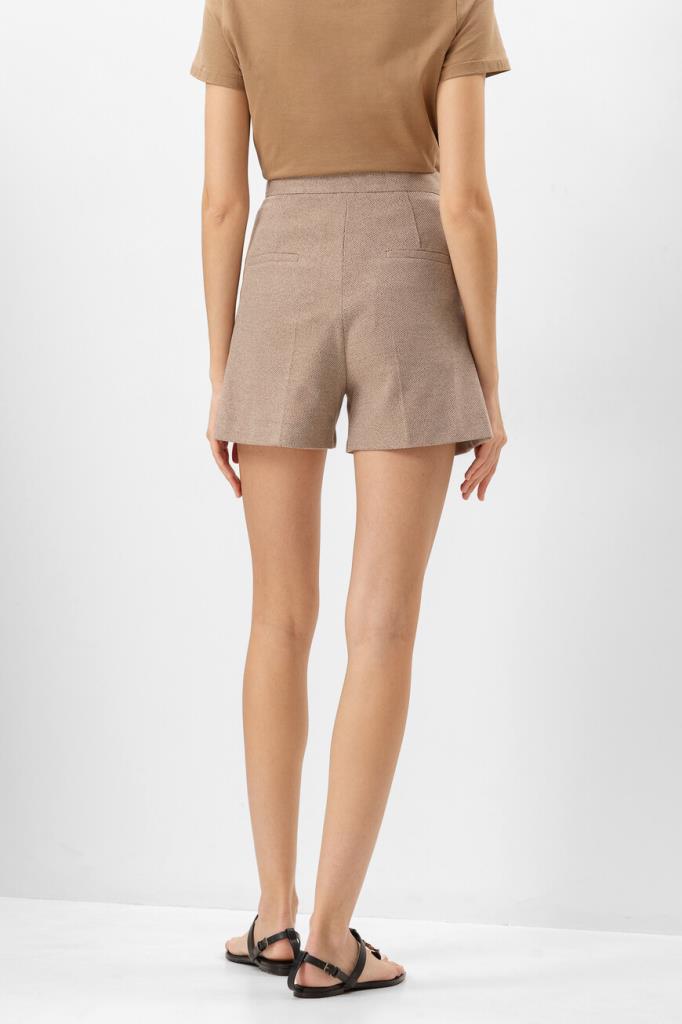 Шорты с классическими стрелками и двойными защипами сверху от Max Mara. Для изготовления повседневной модели используется фактурный хлопковый трикотаж в бело-коричневой гамме. Изделие с четырьмя прорезными карманами можно сочетать с брендированной хлопковой футболкой из той же коллекции.
