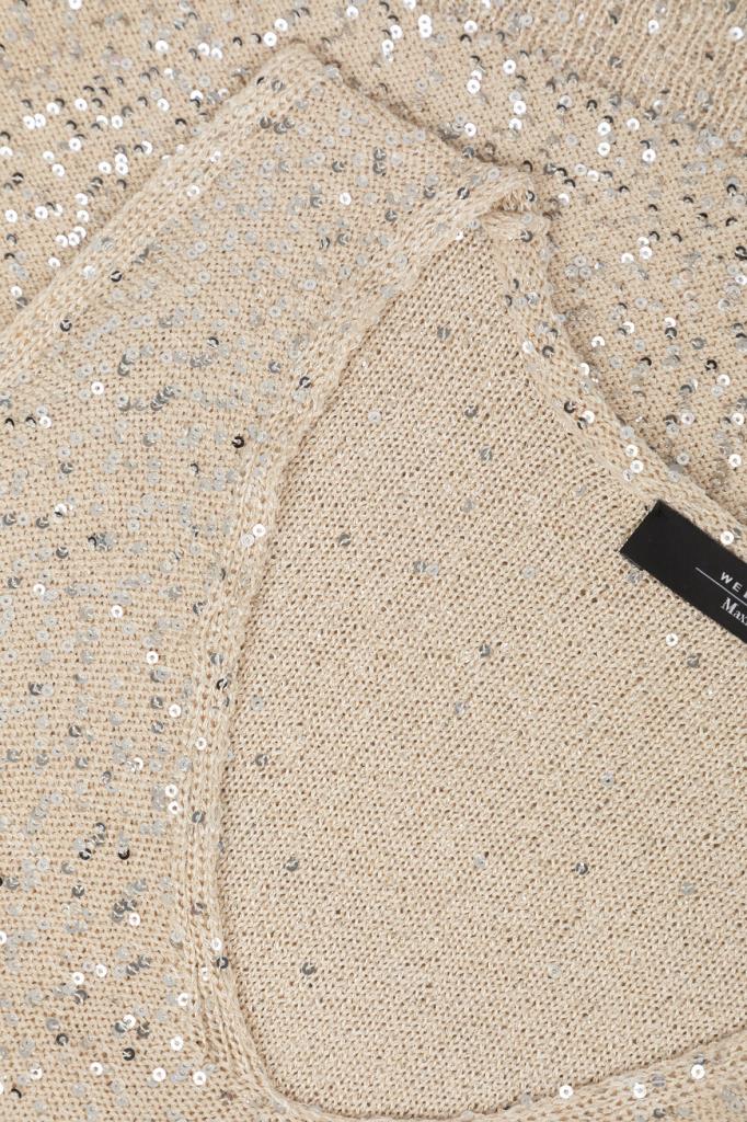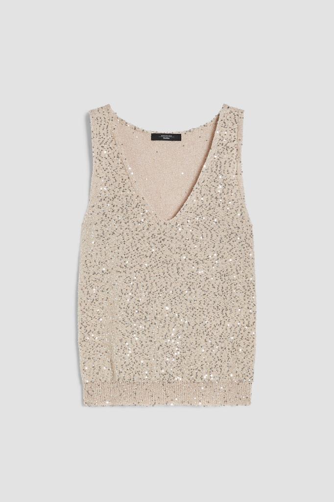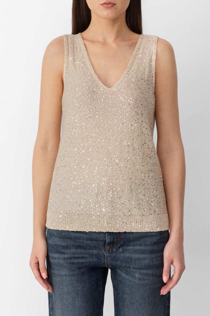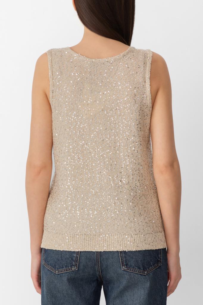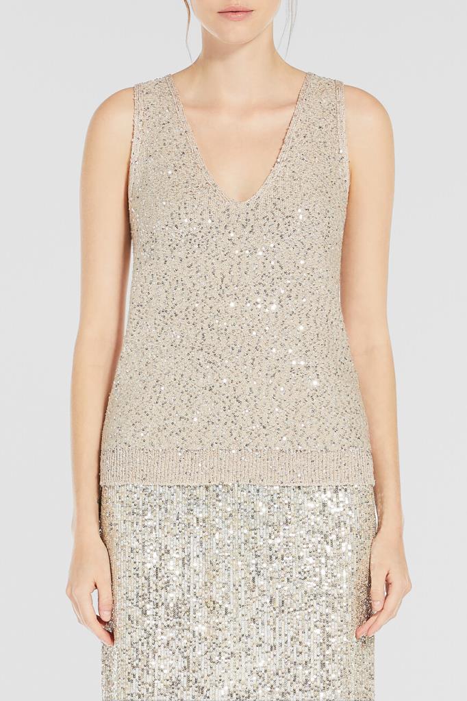 Топ Max Mara без рукавов выполнен из пряжи с пайетками. Свободный крой и глубокий V-образный вырез спереди придают модели элегантность и чувственность. Широкий ребристый край изделия и мерцание переливающихся пайеток добавляют изысканности. Изделие станет ярким акцентом в вашем гардеробе и подойдет для особых случаев.