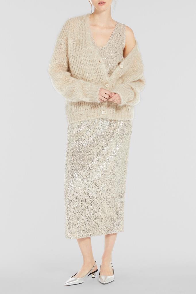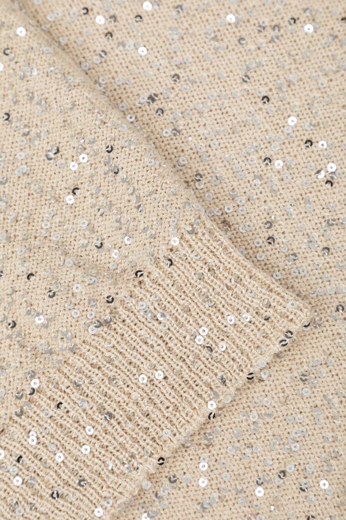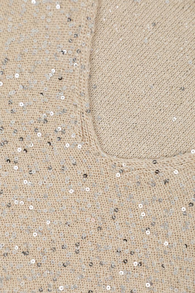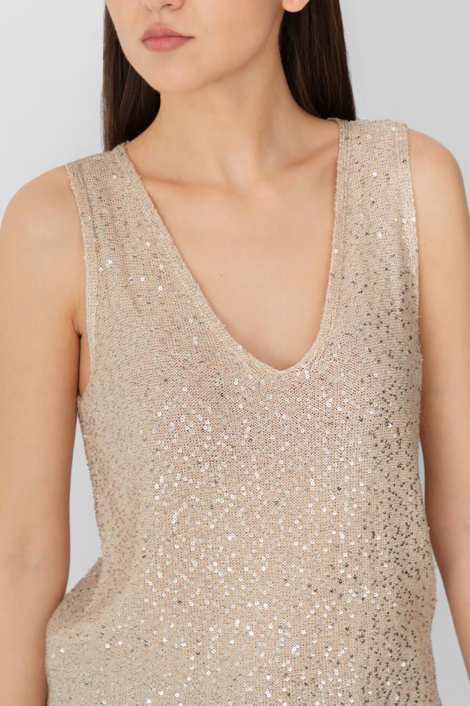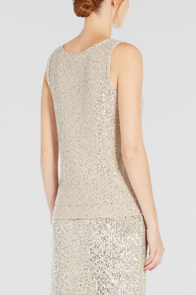 Топ Max Mara без рукавов выполнен из пряжи с пайетками. Свободный крой и глубокий V-образный вырез спереди придают модели элегантность и чувственность. Широкий ребристый край изделия и мерцание переливающихся пайеток добавляют изысканности. Изделие станет ярким акцентом в вашем гардеробе и подойдет для особых случаев.