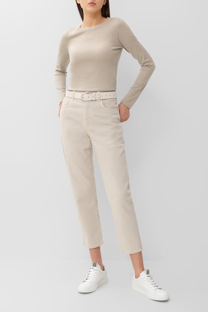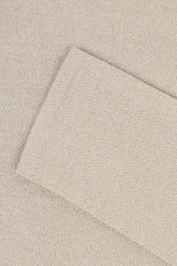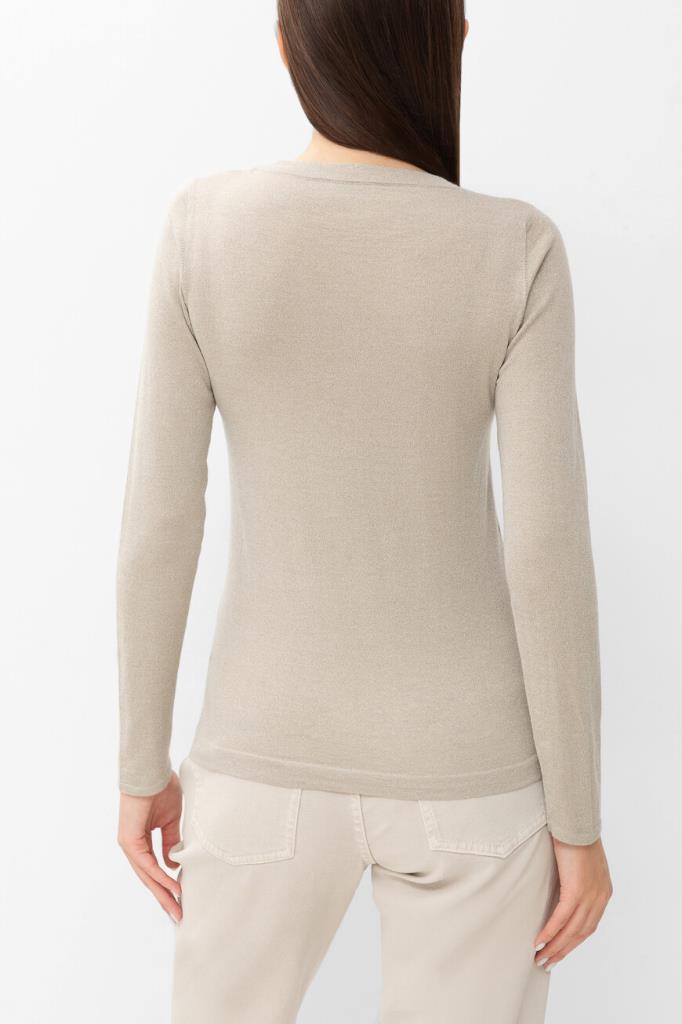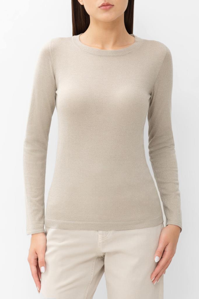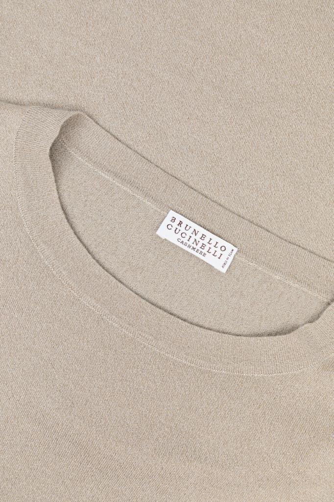 Трикотажный пуловер BRUNELLO CUCINELLI с круглым вырезом горловины на резинке. Для изготовления модели прилегающего силуэта выбраны мягкий кашемир, гладкий шёлк и прочный нейлон. Отличительными особенностями изделия стали чулочная вязка и вплетённая в ткань золотистая люрексовая нить.