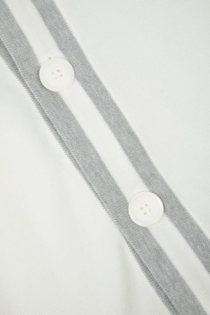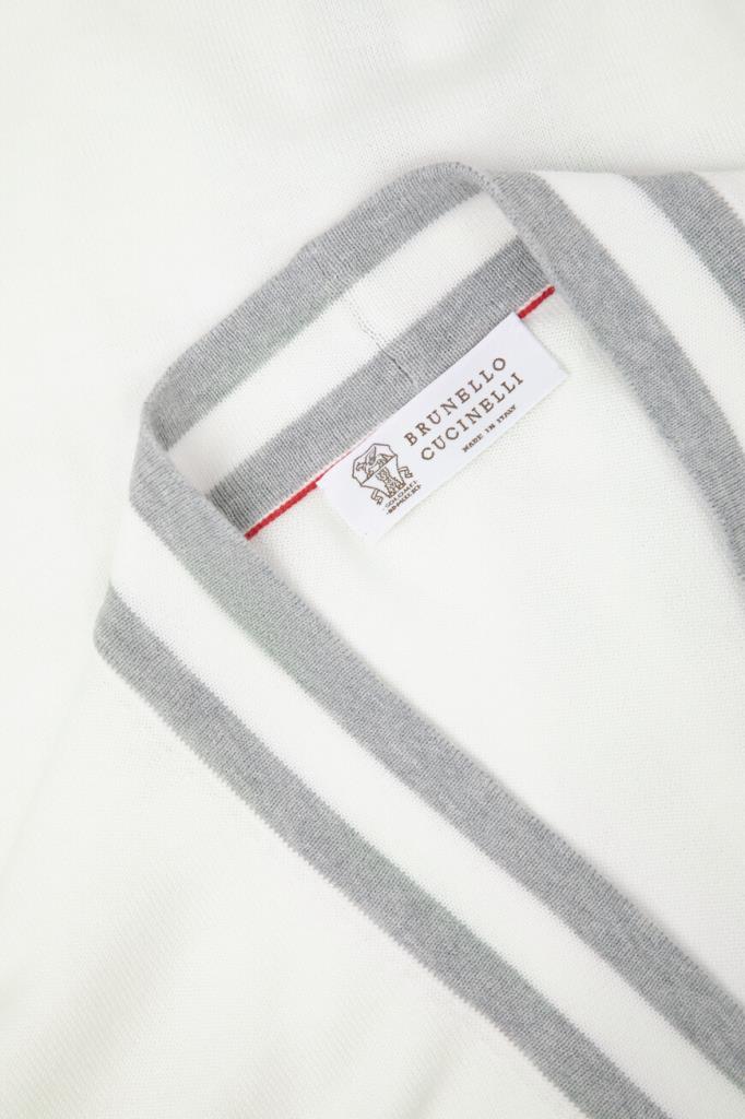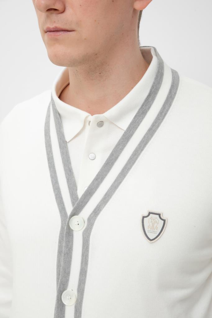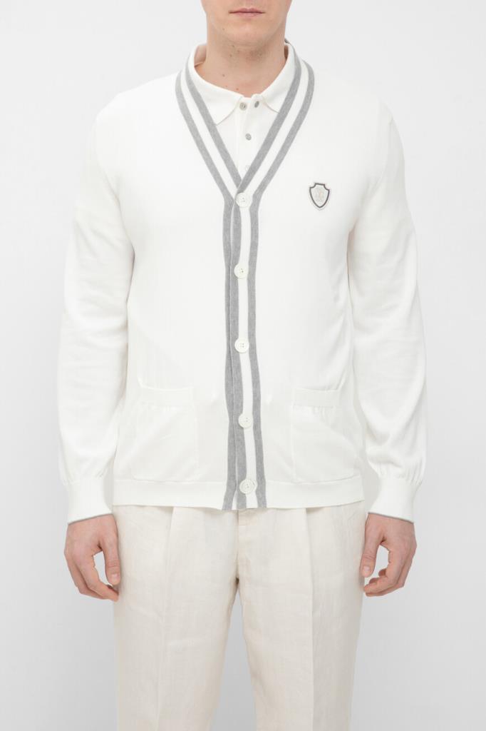 Кардиган BRUNELLO CUCINELLI с двумя накладными карманами. Изделие сшито из мягкого хлопкового трикотажа белого цвета и декорировано серыми полосами-окантовкой на V-образной горловине, вдоль планки застёжки и снизу на манжетах рукавов. Слева на груди размещена знаковая эмблема-герб с лого-монограммой, отсылающая к Дому.