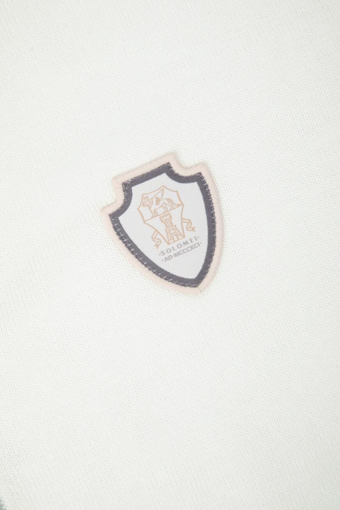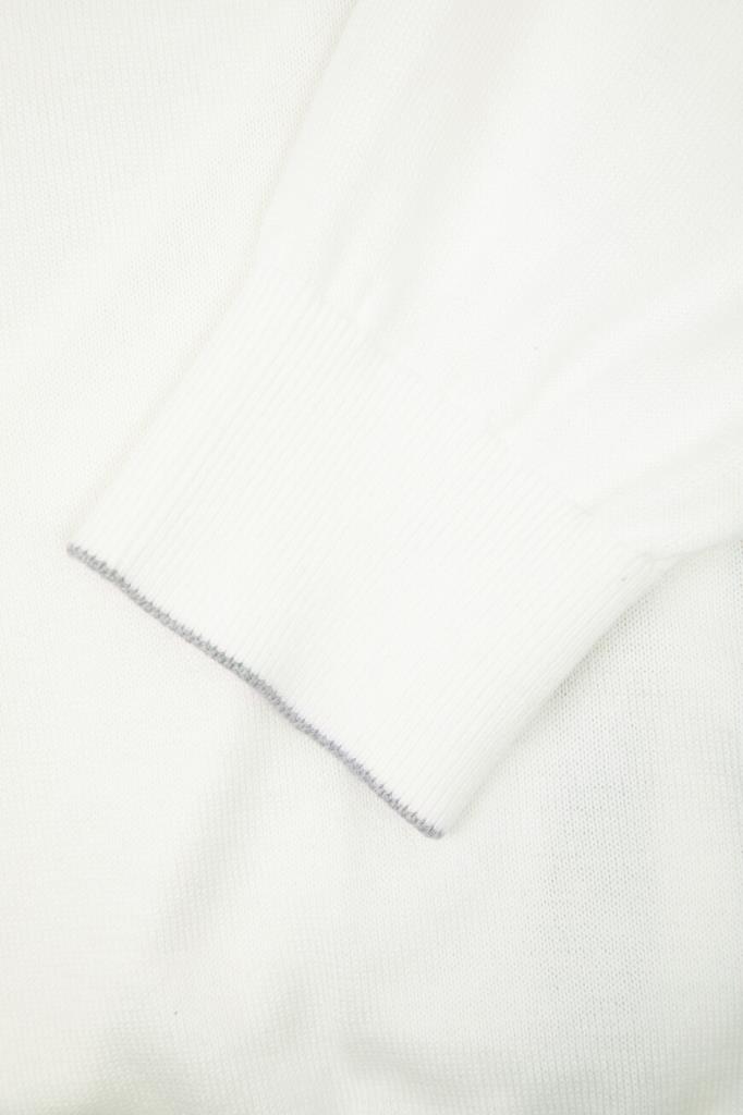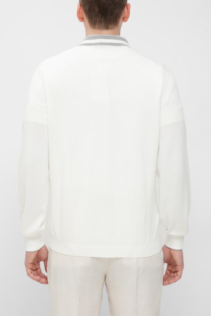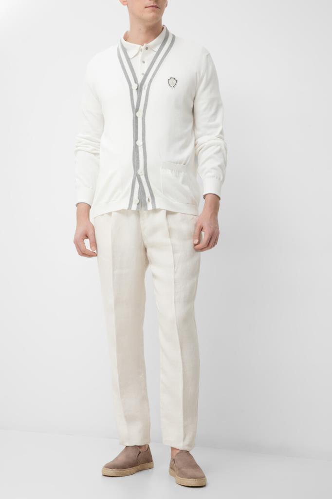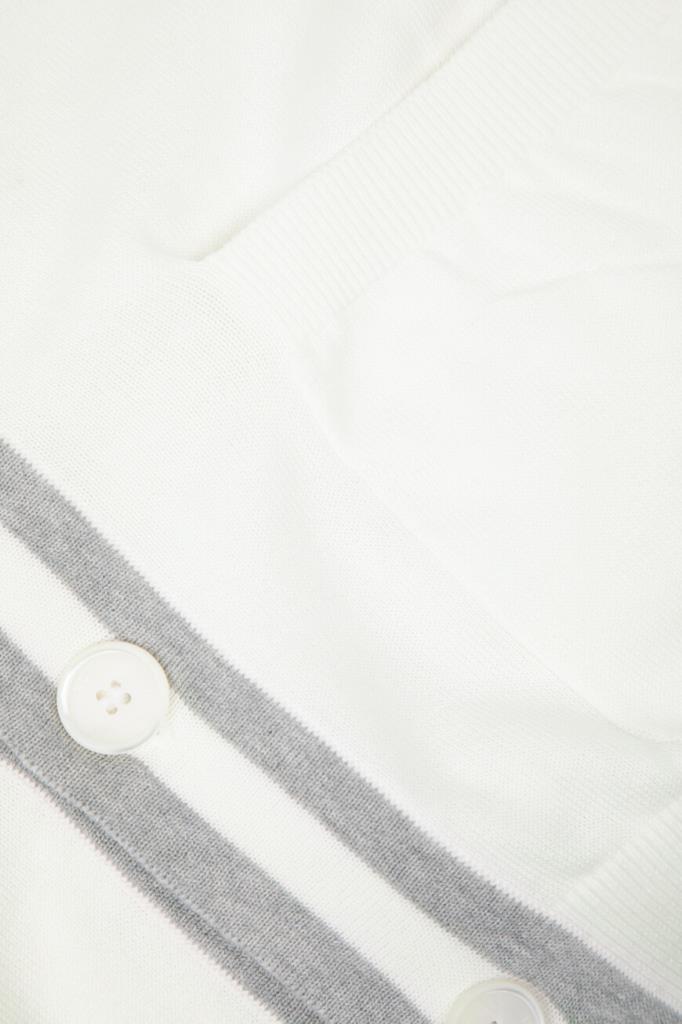 Кардиган BRUNELLO CUCINELLI с двумя накладными карманами. Изделие сшито из мягкого хлопкового трикотажа белого цвета и декорировано серыми полосами-окантовкой на V-образной горловине, вдоль планки застёжки и снизу на манжетах рукавов. Слева на груди размещена знаковая эмблема-герб с лого-монограммой, отсылающая к Дому.