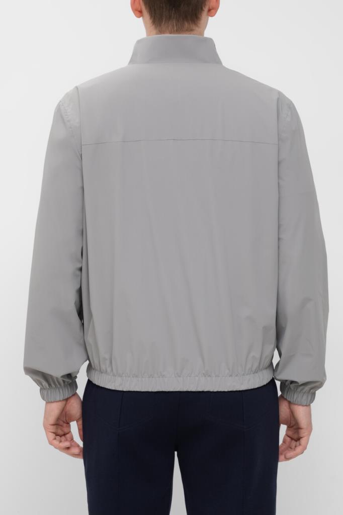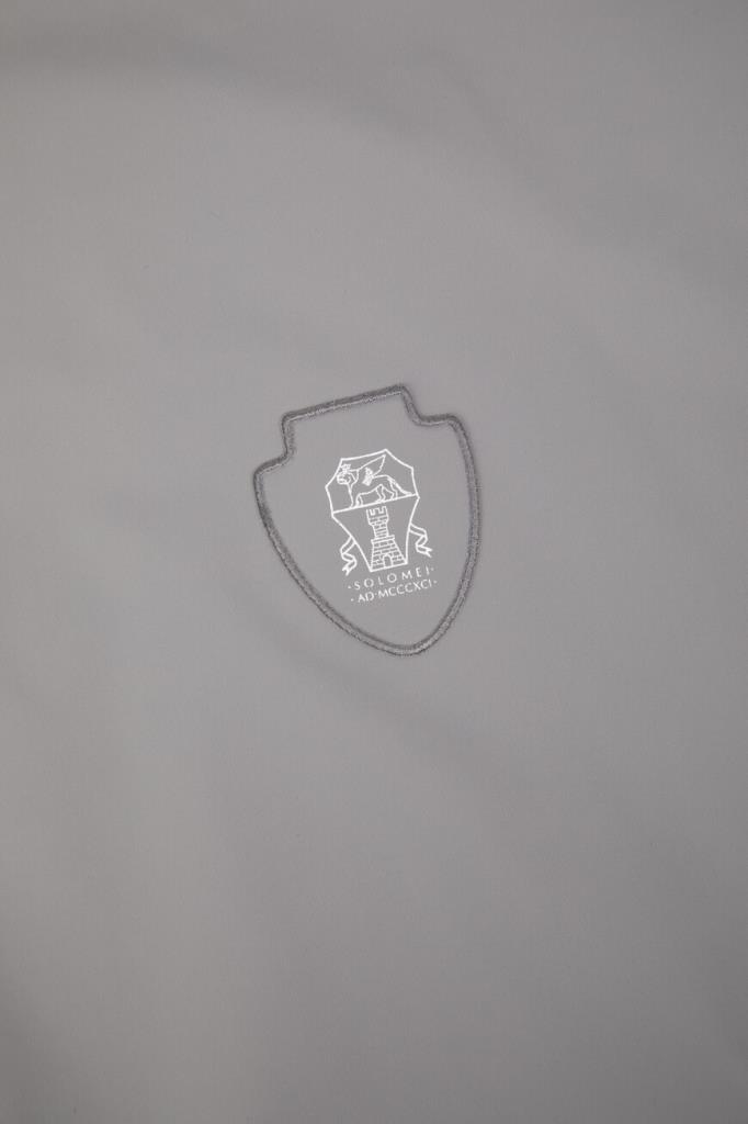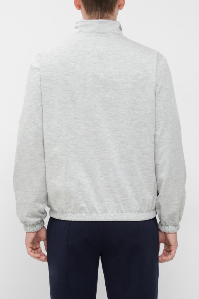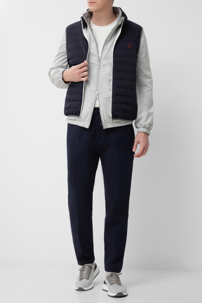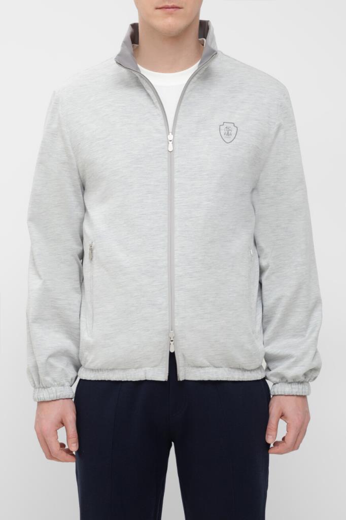 Двусторонняя куртка в спортивном стиле от BRUNELLO CUCINELLI. Одна сторона модели изготовлена из жемчужно-серого водоотталкивающего джерси на основе хлопка и гладкого шёлка, а другая - из прочного эластичного нейлона серого цвета. Изделие застёгивается на встречную молнию с двумя брендированными пуллерами. Декором выступает знаковая эмблема-герб с лого-монограммой Дома, размещённая слева на груди.