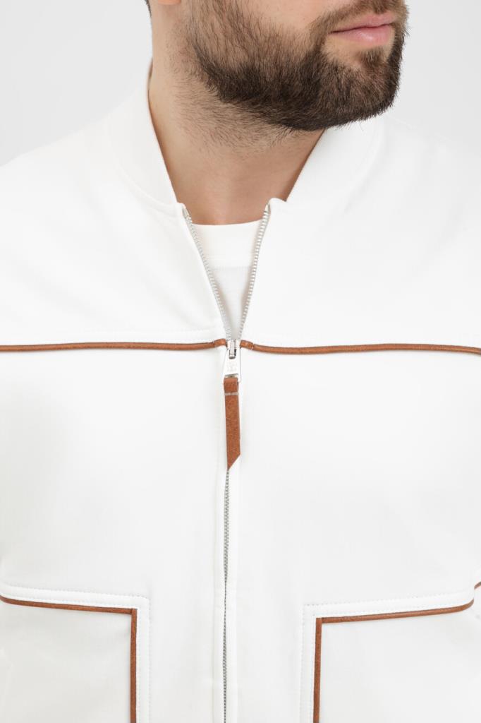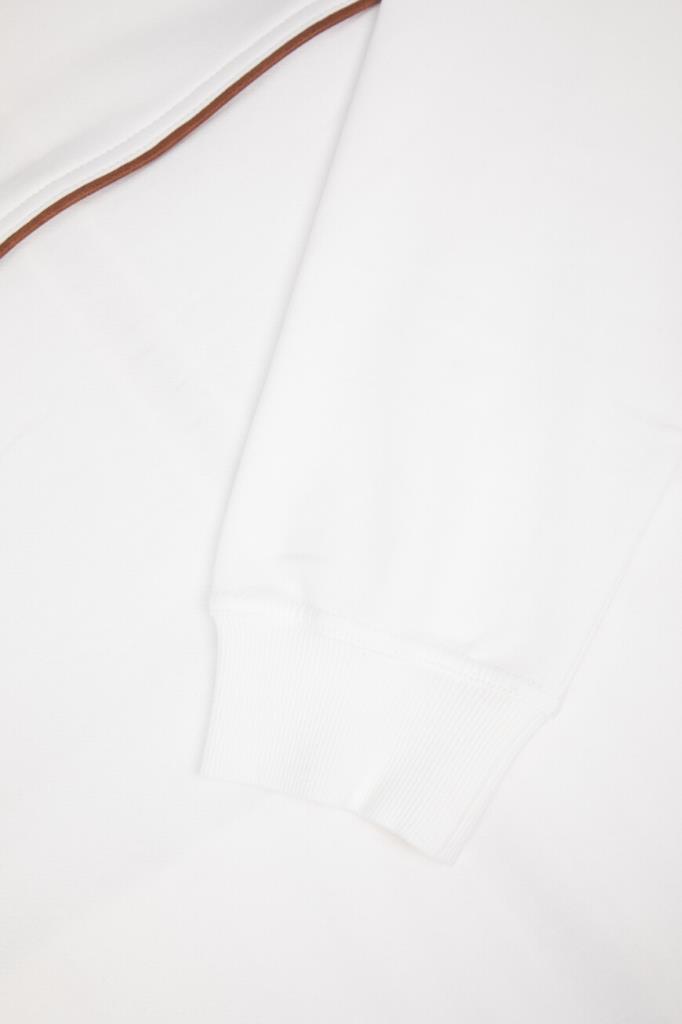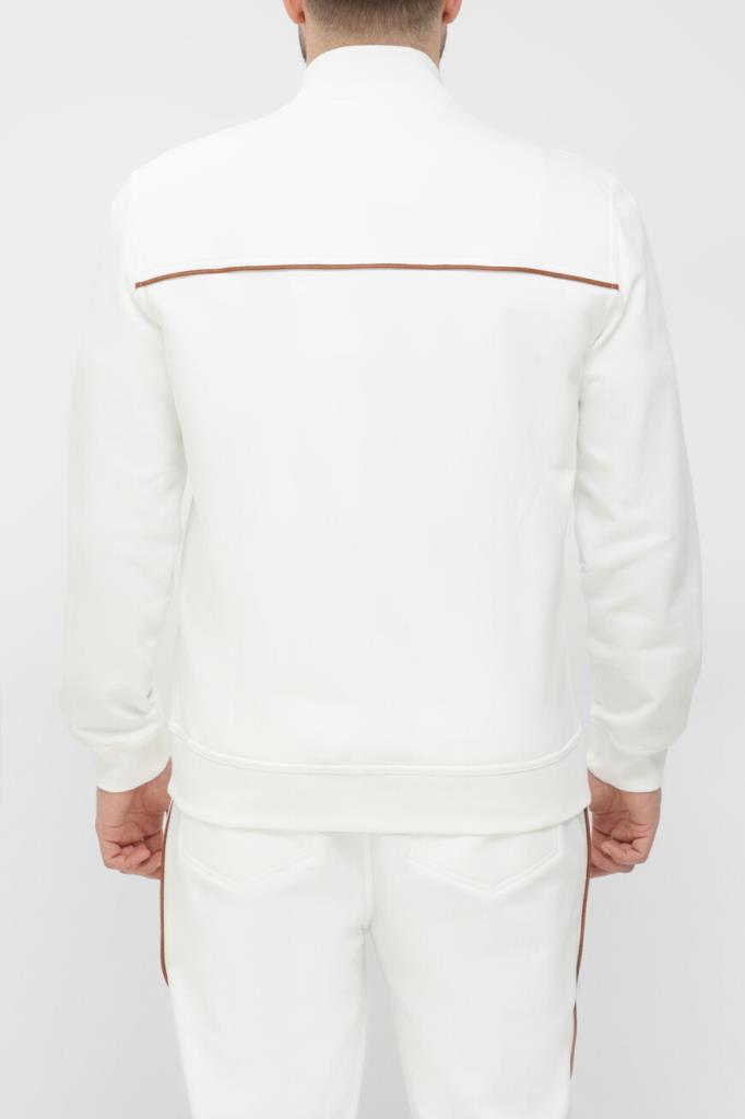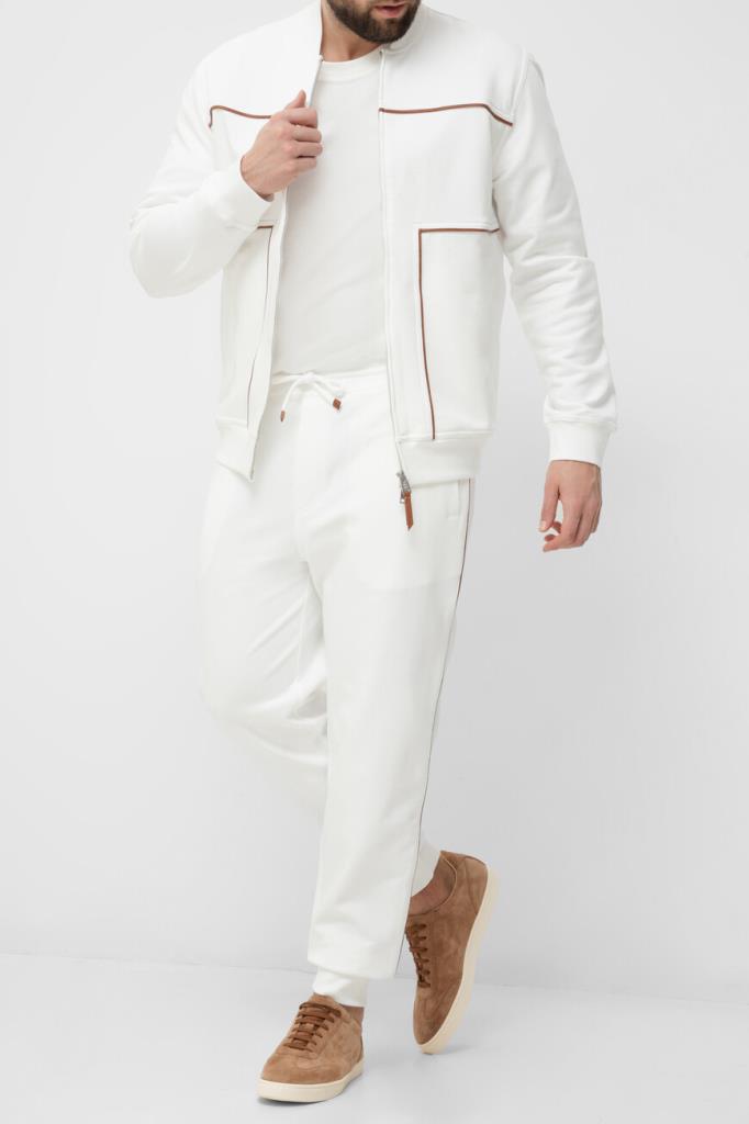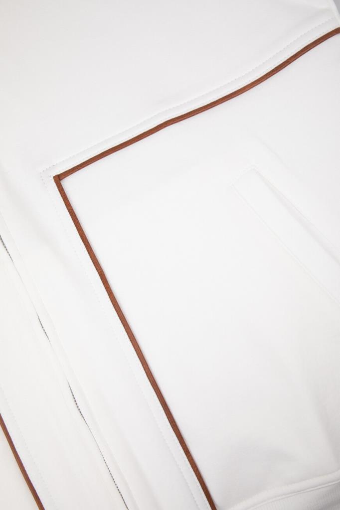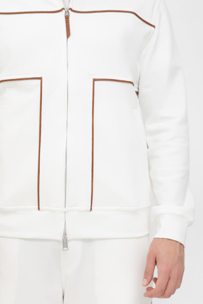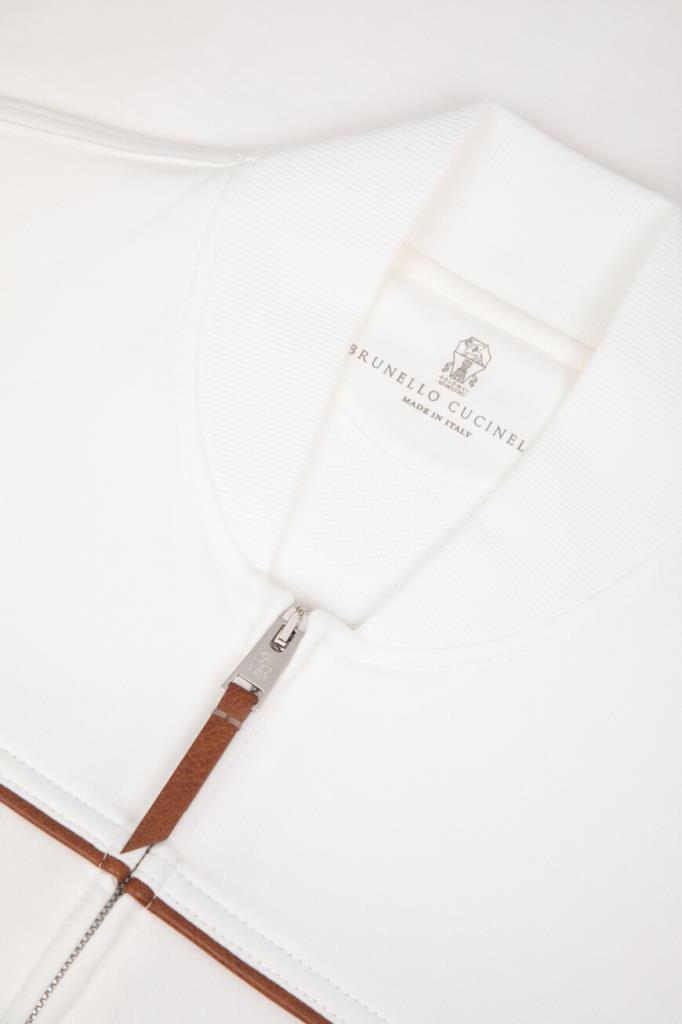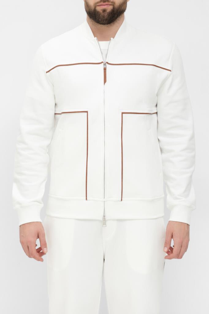 Трикотажная толстовка BRUNELLO CUCINELLI с невысоким воротником-стойкой. Модель линии Travelwear изготовлена из высокотехнологичного хлопкового футера белого цвета и украшена рельефными коричневыми полосами-отделкой. Конструкция изделия свободного силуэта, выполненного в стиле бомбера, предполагает застёжку на серую молнию с двумя брендированными пуллерами, широкий эластичный пояс и манжеты-резинки для оптимальной посадки.